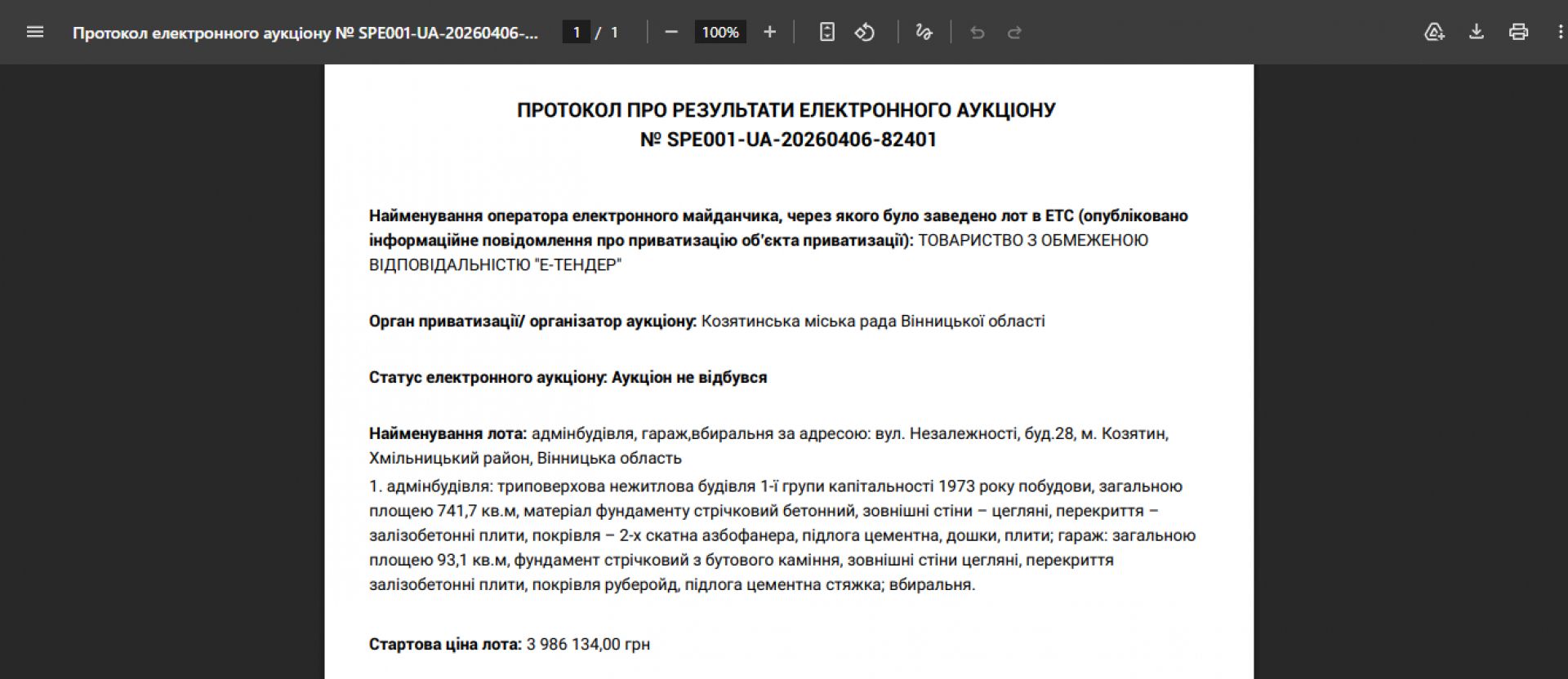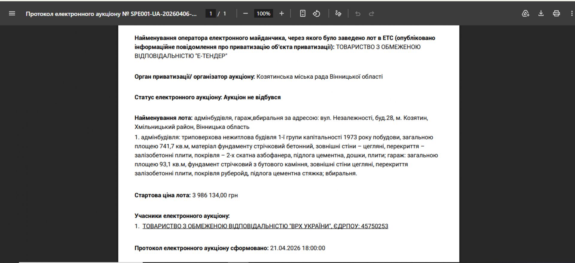 На другий аукціон подалася компанія «ВРХ України», що зареєстрована у Флоріанівці. Про це ми вже розповідали. Фірма запропонувала ціну в чотири мільйона гривень і позаяк була єдиним учасником, мала б, за логікою, стати переможцем аукціону. Сам аукціон мав відбутися опівдні у середу, 15 квітня і того дня на майданчику «Prozorro.Продажі» з’явилася інформація про те, що торги відбулися й очікується опублікування протоколу. Але минув майже тиждень і у вівторок, 21 квітня на сторінку аукціону завантажили протокол, відповідно до якого електронний аукціон не відбувся.