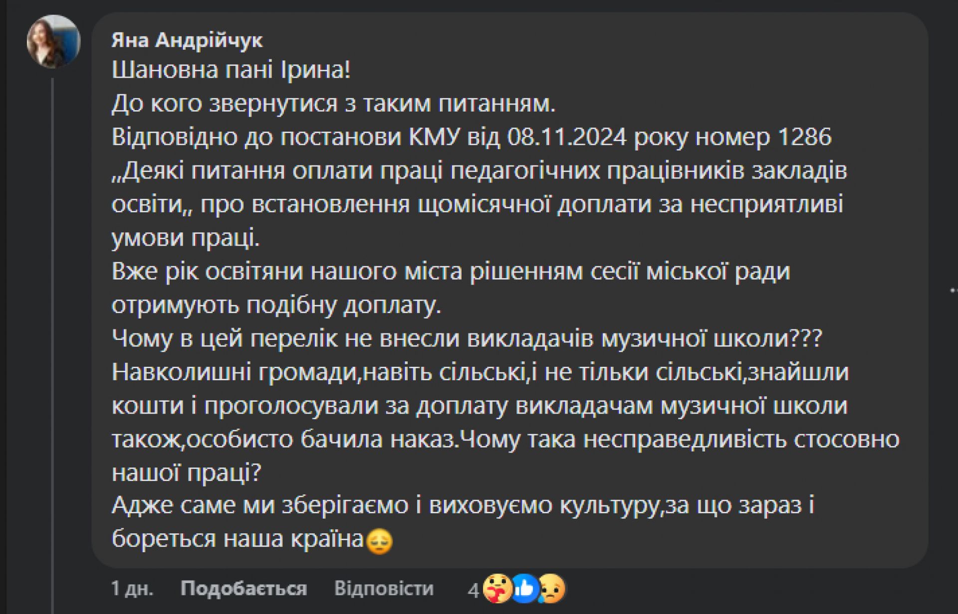 «Відповідно до постанови КМУ від 08.11.2024 року номер 1286 […] про встановлення щомісячної доплати за несприятливі умови праці. Вже рік освітяни нашого міста рішенням сесії міської ради отримують подібну доплату. Чому в цей перелік не внесли викладачів музичної школи??? Навколишні громади, навіть сільські, знайшли кошти і проголосували за доплату викладачам музичної школи також. Чому така несправедливість стосовно нашої праці? Адже саме ми зберігаємо і виховуємо культуру, за що зараз і бореться наша країна.»