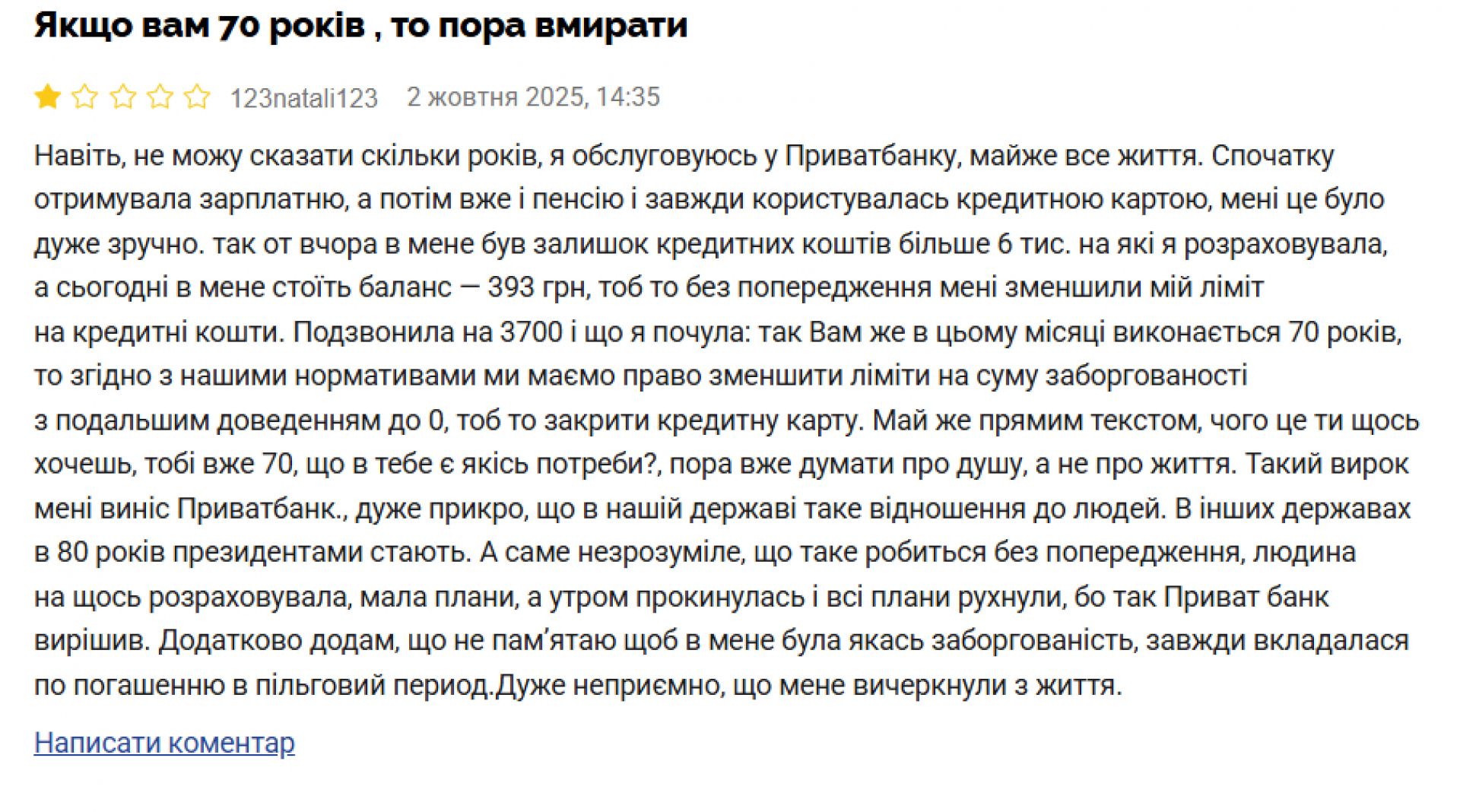 Пенсіонерка емоційно прокоментувала, що відчуває, ніби банк виніс їй "вирок", і засмучена тим, що її багаторічна фінансова дисципліна не була врахована. Найбільше засмутило її те, що банк не надіслав жодного попередження про скорочення ліміту.