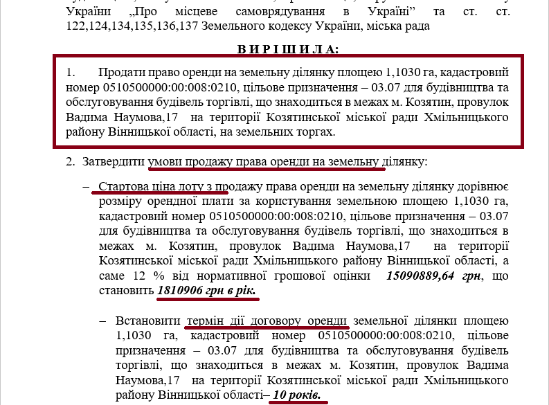 Відповідно до рішення, яке прийняли депутати на сесії, земельну ділянку з кадастровим номером 0510500000:00:008:0210 мають виставити на аукціон з продажу права оренди. Територія чимала — 1,1 гектара. Втім охоплює вона не весь Центральний ринок — будівлі, де раніше був молочний та м’ясний павільйони, кафе і сусідні споруди, усі магазини ліворуч від в’їзду на ринок, а також споруди по периметру перед костелом у межі цієї земельної ділянки не входять. Земельна ділянка із вищезгаданим кадастровим номером охоплює центральну частину ринку, де стоять контейнери та криті павільйони.