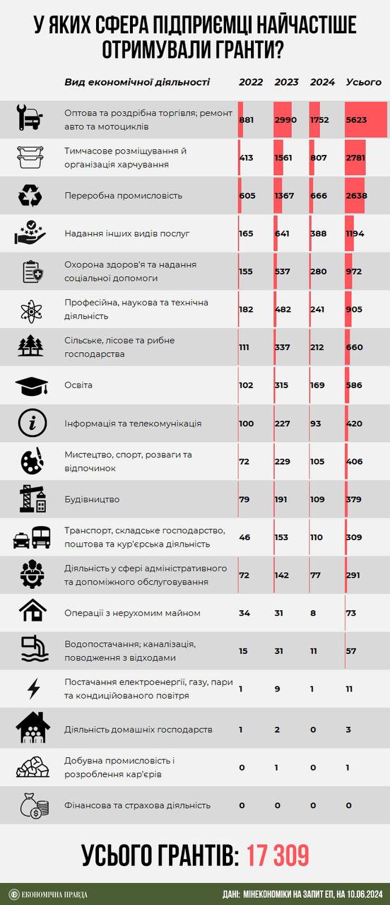 У червні цього року видання «Економічна правда» розробило статистику, для яких видів економічної діяльності підприємці найчастіше брали гранти за період з 2022 по 2024 рік. Користувалися відомостями, які одержали від Мінекономіки у відповідь на інформаційний запит.