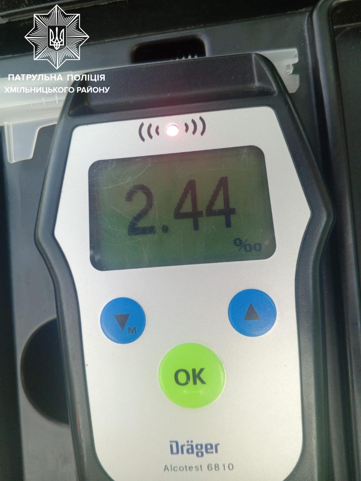 — Спілкуючись з 50-річним керманичем, інспектори виявили в нього ознаки алкогольного сп'яніння. Чоловік погодився пройти огляд за допомогою алкотесту «Драгер». Результат позитивний — 2,44 проміле, — інформують у поліції