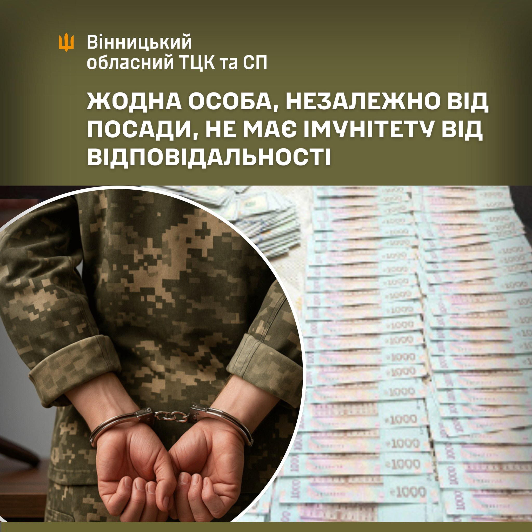 «За результатами взаємодії з правоохоронними органами викрили факт вчинення кримінального правопорушення посадовою особою одного із районних ТЦК та СП Вінницької області. Зазначаємо, що військова служба в системі Збройних Сил України — це висока відповідальність перед державою і суспільством. Будь-які спроби використання службового становища з протиправною метою є неприпустимими та матимуть невідворотні правові наслідки. Вінницький обласний ТЦК та СП надає повне сприяння правоохоронним органам для всебічного та об’єктивного розслідування. Жодна особа, незалежно від посади, не має імунітету від відповідальності. Очищення системи від осіб, які дискредитують Збройні Сили України, залишається пріоритетним напрямом роботи. ТЦК та СП і надалі продовжуватимуть системну взаємодію з правоохоронними органами з метою виявлення порушень та притягнення винних осіб до відповідальності» — пишуть в обласному ТЦК.