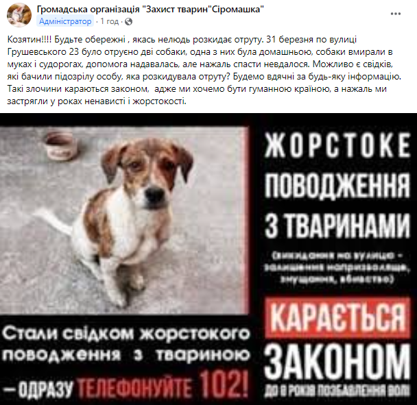 «Козятин! Будьте обережні, якась нелюдь розкидає отруту. 31 березня по вулиці Грушевського, 23 отруїли дві собаки, одна з них була домашньою, собаки вмирали в муках і судомах, допомога надавалась, але на жаль спасти не вдалося. Можливо є свідки, які бачили підозрілу особу, яка розкидувала отруту? Будемо вдячні за будь-яку інформацію. Такі злочини караються законом, адже ми хочемо бути гуманною країною, а на жаль ми застрягли у роках ненависті і жорстокості».