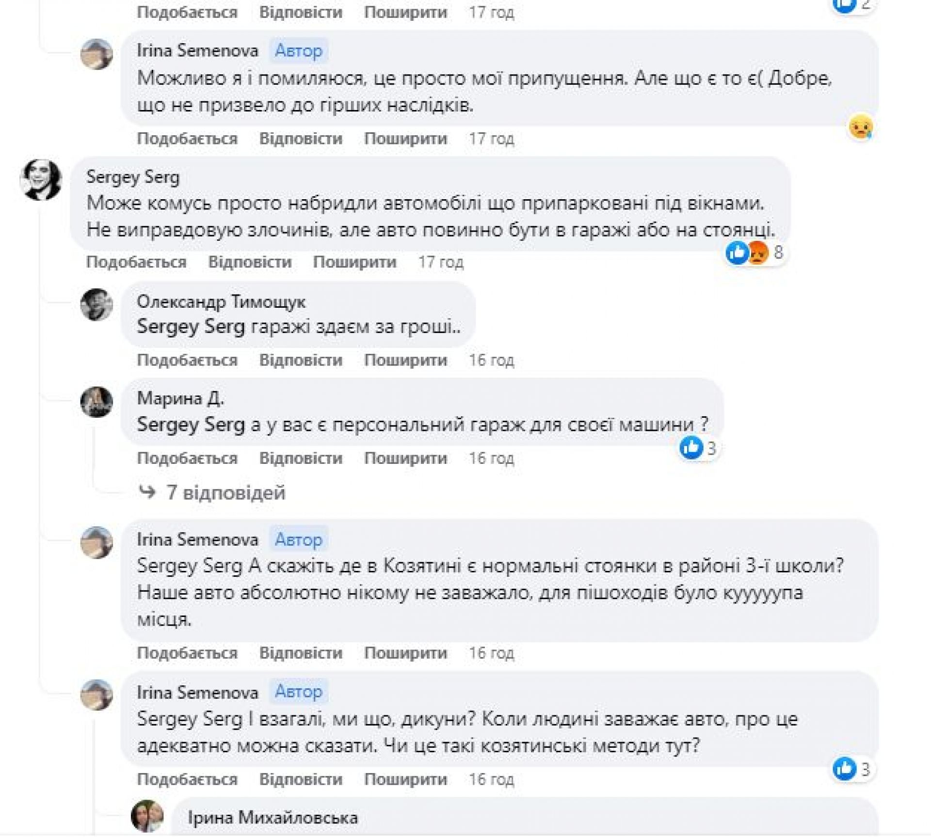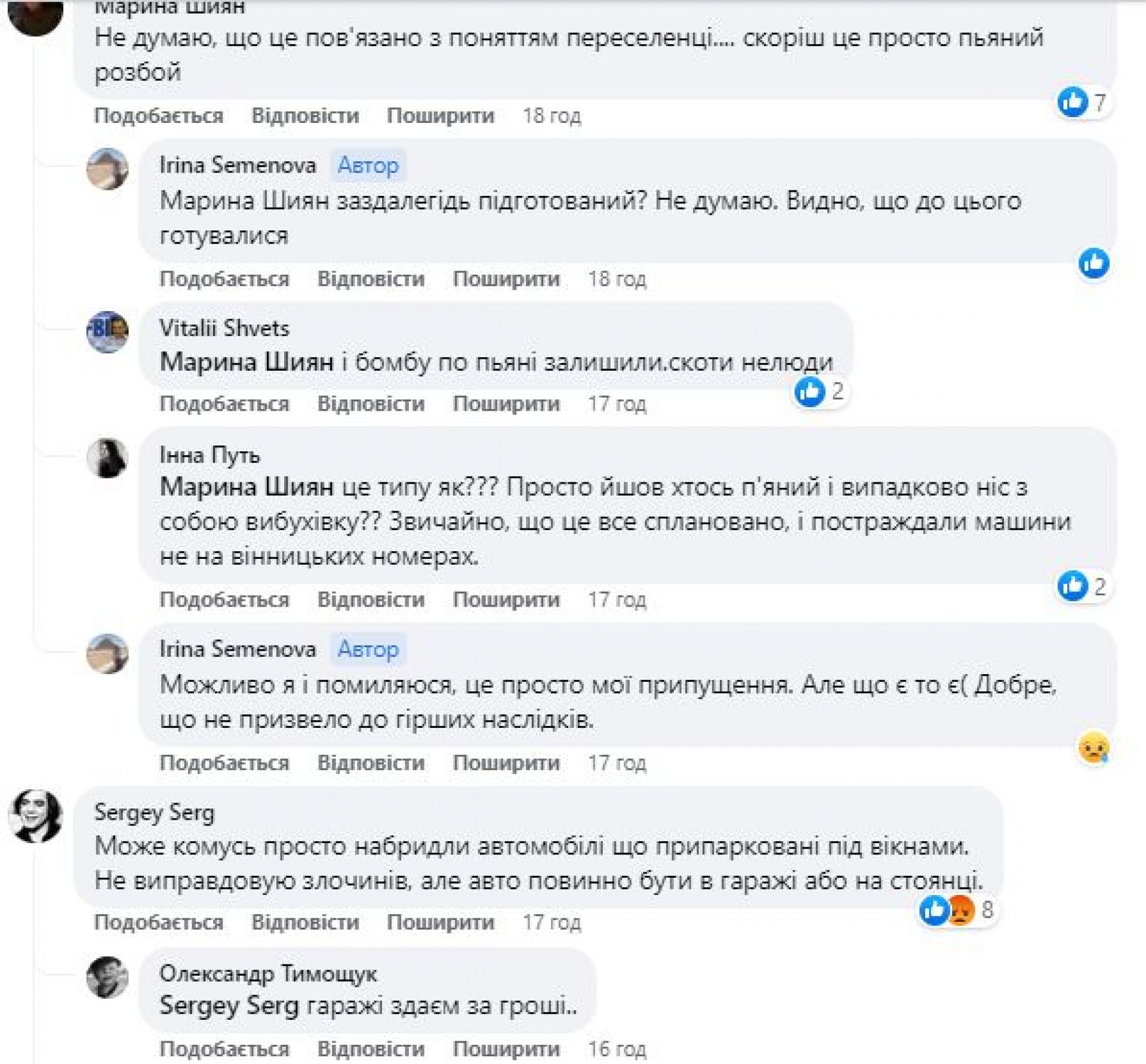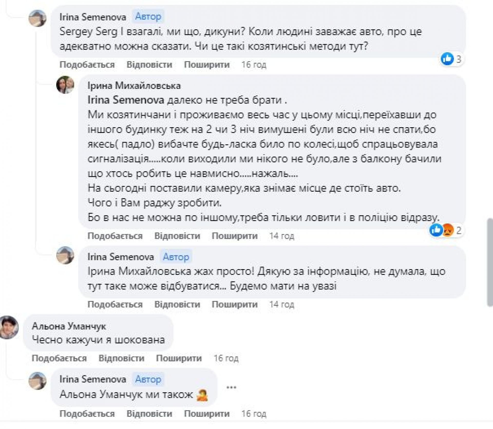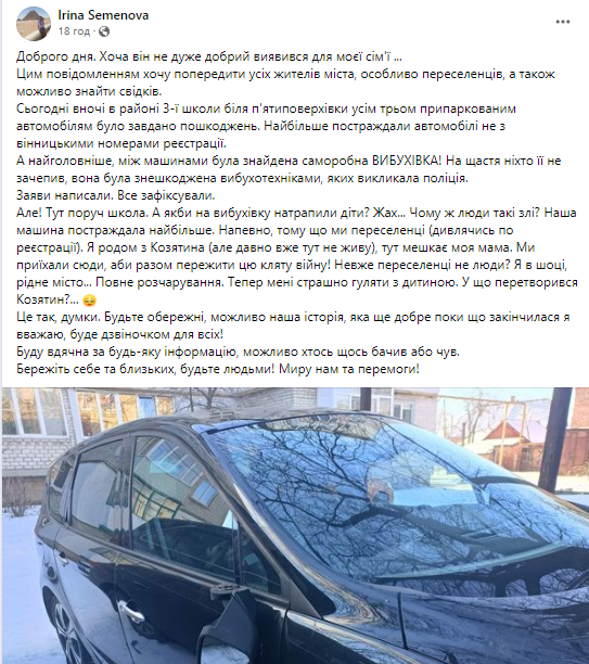 — Цим повідомленням хочу попередити усіх жителів міста, особливо переселенців, а також можливо знайти свідків. Усім трьом припаркованим автомобілям, біля п'ятиповерхівки завдали пошкоджень. Найбільше постраждали автомобілі не з Вінницькими номерами реєстрації, — написала у соціальних меражах Irina Semenova. — А найголовніше, між машинами була знайдена саморобна вибухівка! На щастя ніхто її не зачепив, вона була знешкоджена вибухотехніками, яких викликала поліція. Заяви написали. Все зафіксували. Але! Тут поруч школа. А якби на вибухівку натрапили діти? Жах... Чому ж люди такі злі? Наша машина постраждала найбільше. Напевно, тому що ми переселенці (дивлячись по реєстрації). Я родом з Козятина (але давно вже тут не живу), тут мешкає моя мама. Ми приїхали сюди, аби разом пережити цю кляту війну! Невже переселенці не люди? Я в шоці, рідне місто... Повне розчарування. Тепер мені страшно гуляти з дитиною. У що перетворився Козятин?... Це так, думки. Будьте обережні, можливо наша історія, яка ще добре поки що закінчилася я вважаю, буде дзвіночком для всіх! Буду вдячна за будь-яку інформацію, можливо хтось щось бачив або чув.
