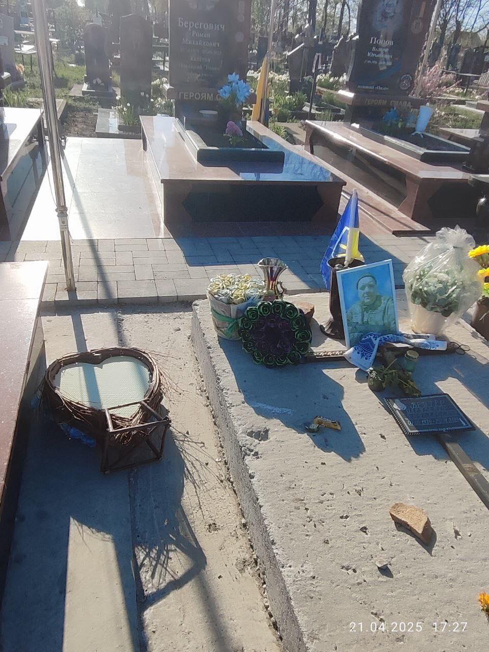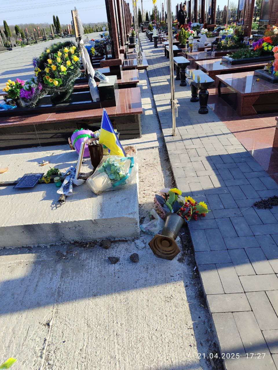 - Батько загиблого воїна Олег Іщук двічі на день поливає квіти на могилі сина. Віранці 21 квітня було все добре, а коли приїхав ввечері — побачив біля могил синів України розбиті лампадки, перевернуті портрети Героїв і вази з квітами. Він повідомив про це родини загиблих воїнів.