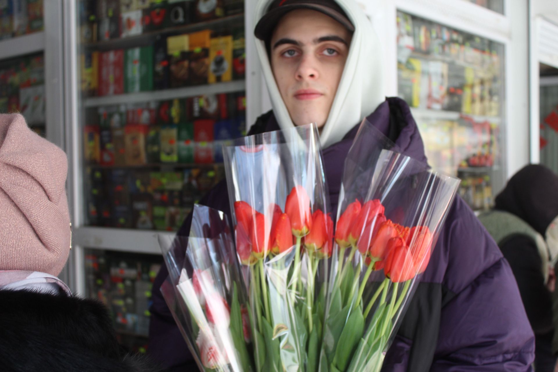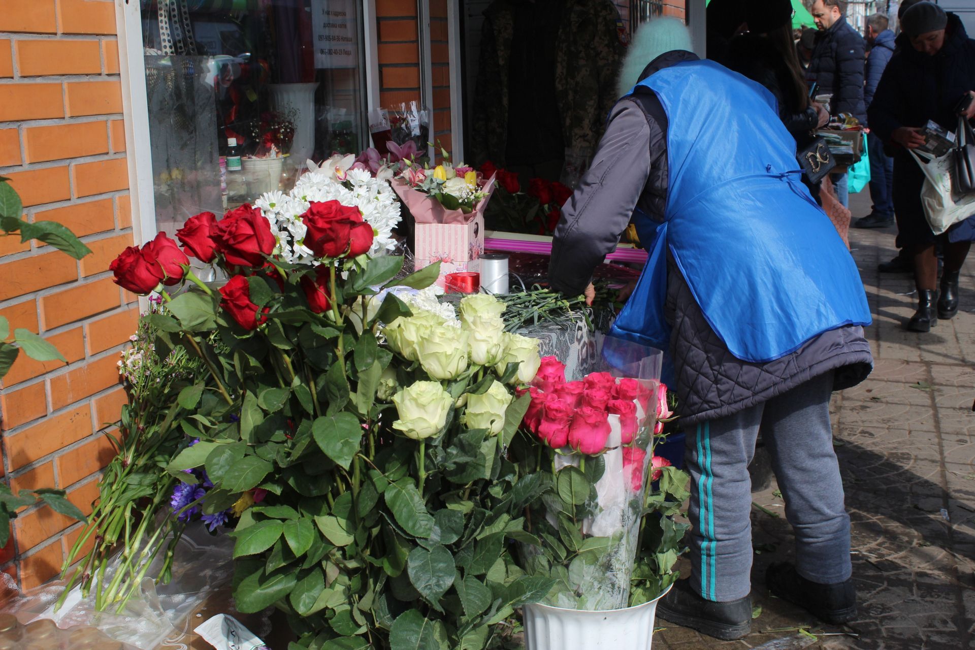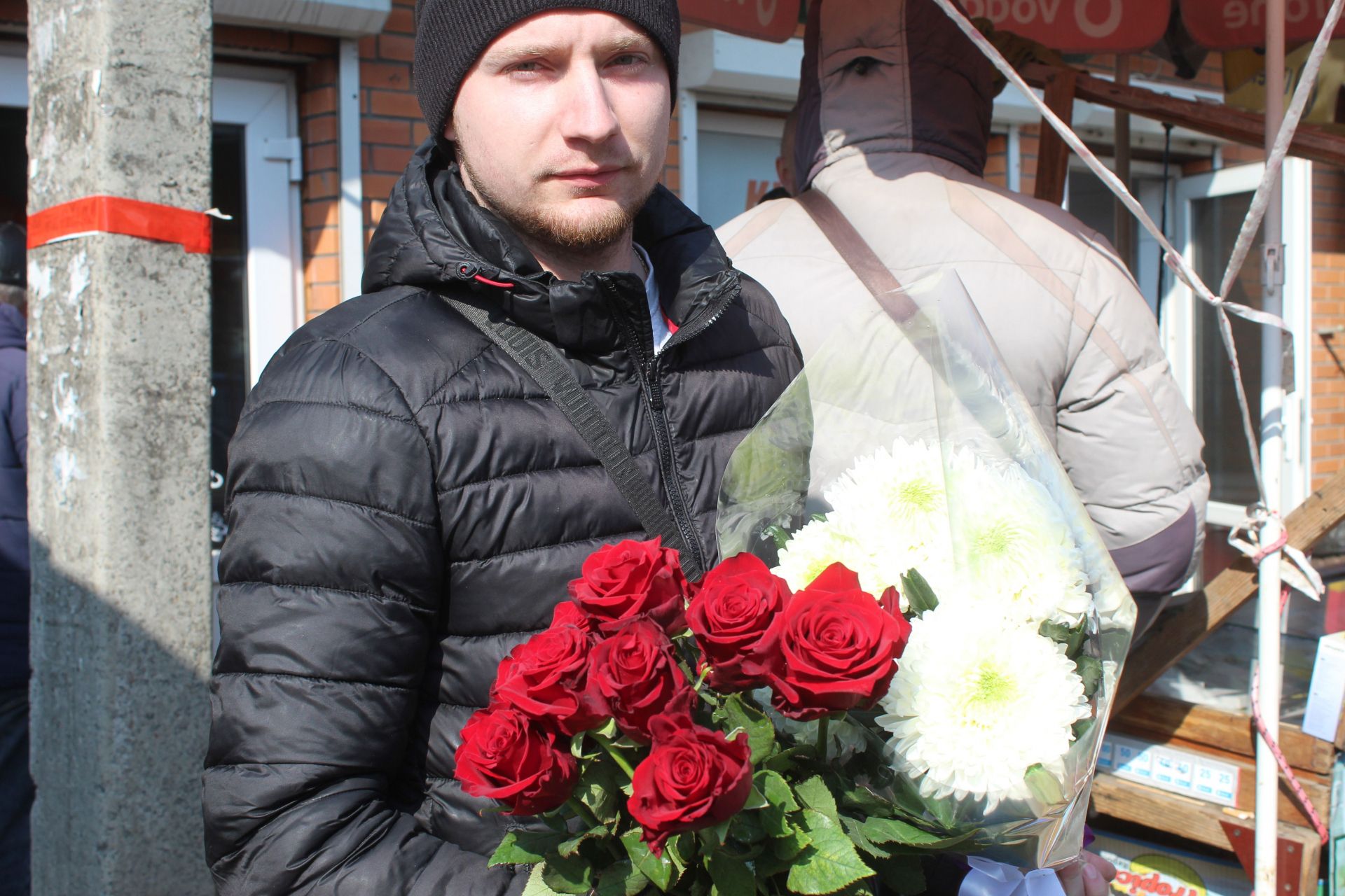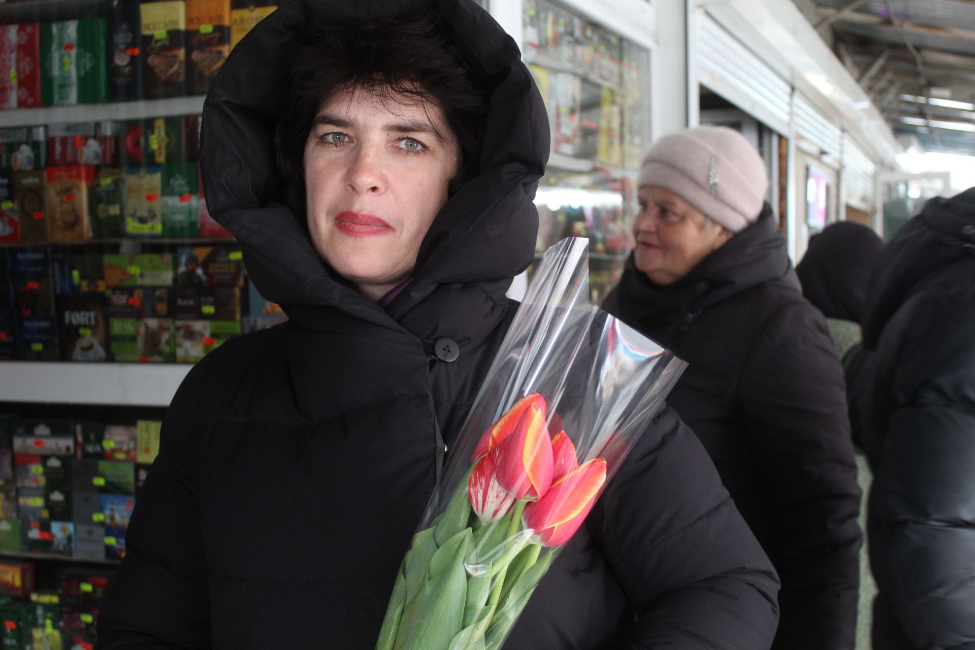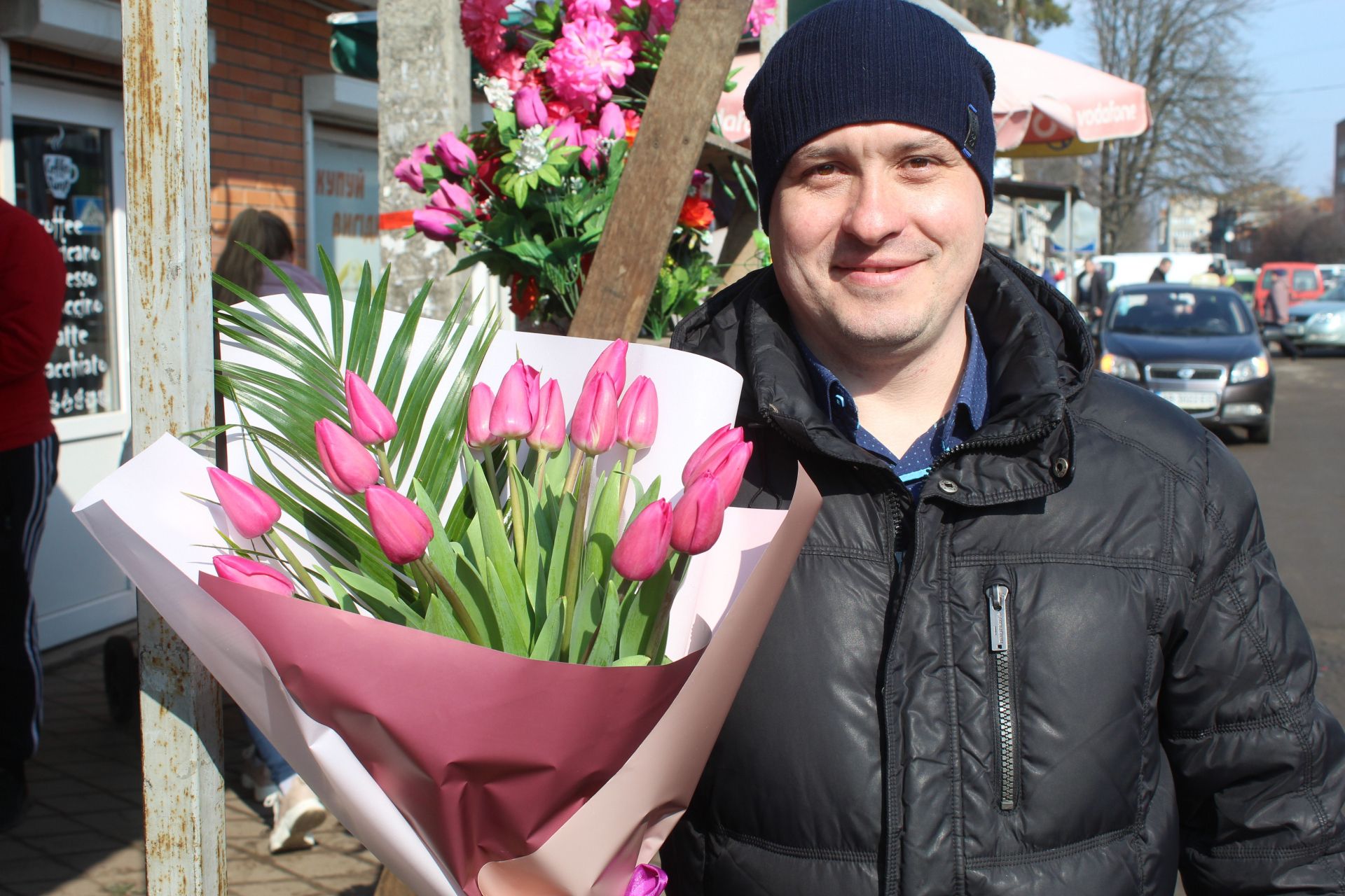 Микола порадує подарунком дружину Світлану а життєрадісна Анна сказала, що цим славним букетом привітали її. Ще ми біля квіткового магазину зустріли Влада, Олександра та Оксану Іванівну. Вони брали квіти для своїх самих близьких. Багато вітали чоловіки жінок прямо на ринку.