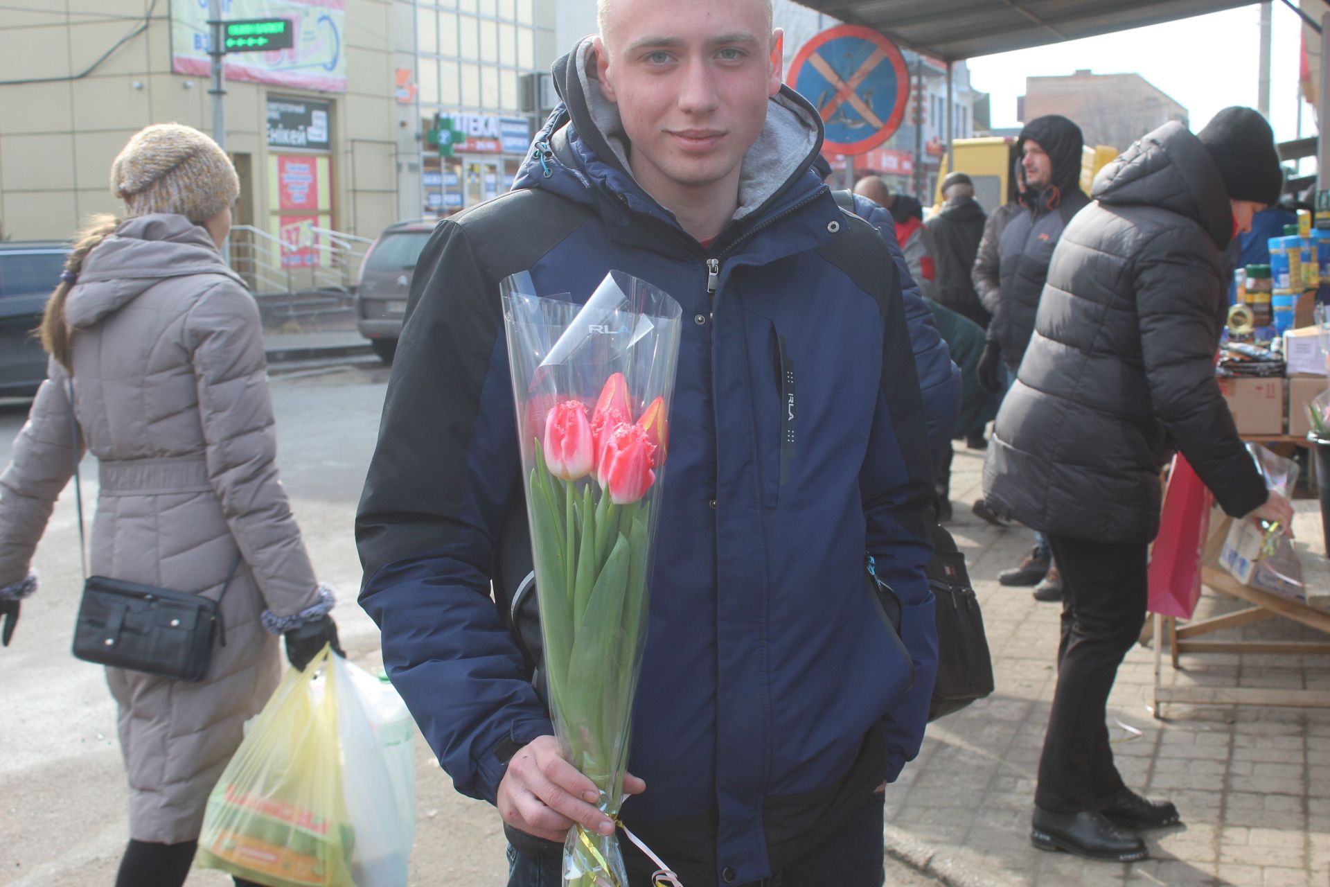 Зустріли й чоловіка, який має велику родину. Купив квіти для дружини, матері, матері дружини тещі, двом сестрам і двом дочкам. Тільки був він автівкою і зупинився, щоб купити квіти на заборонений знак. Він не був впевнений, що стражі порядку коли побачать фото його по чоловічому зрозуміють, тому до прохання пана Віктора не фотографувати його з оберемком квітів, ми віднеслися з розумінням. Чоловіки на автівках так спішили привітати своїх близьких, що крім пана Віктора, ставили своїх залізних коней в зоні дії знаку ще двоє водіїв. То, мабуть, рано жіночий день переносити, коли чоловіки купують квіти під загрозою штрафних санкцій.