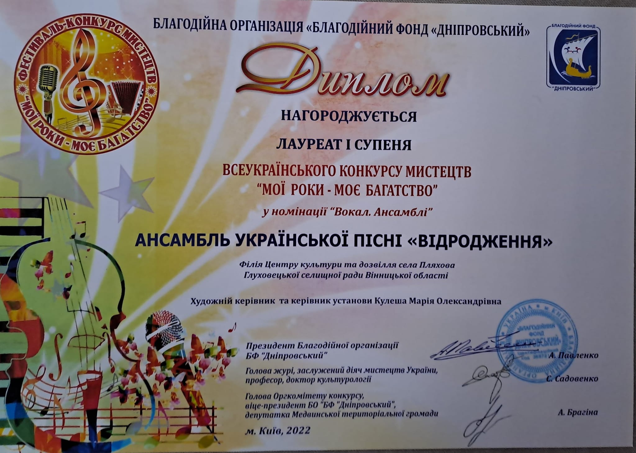 - Ансамбль української пісні «Відродження» філії Центру культури та дозвілля с.Пляхова Глуховецької селищної ради прийняли участь у Всеукраїнському онлайн конкурсі мистецтв «Мої роки — моє багатство» м.Київ.