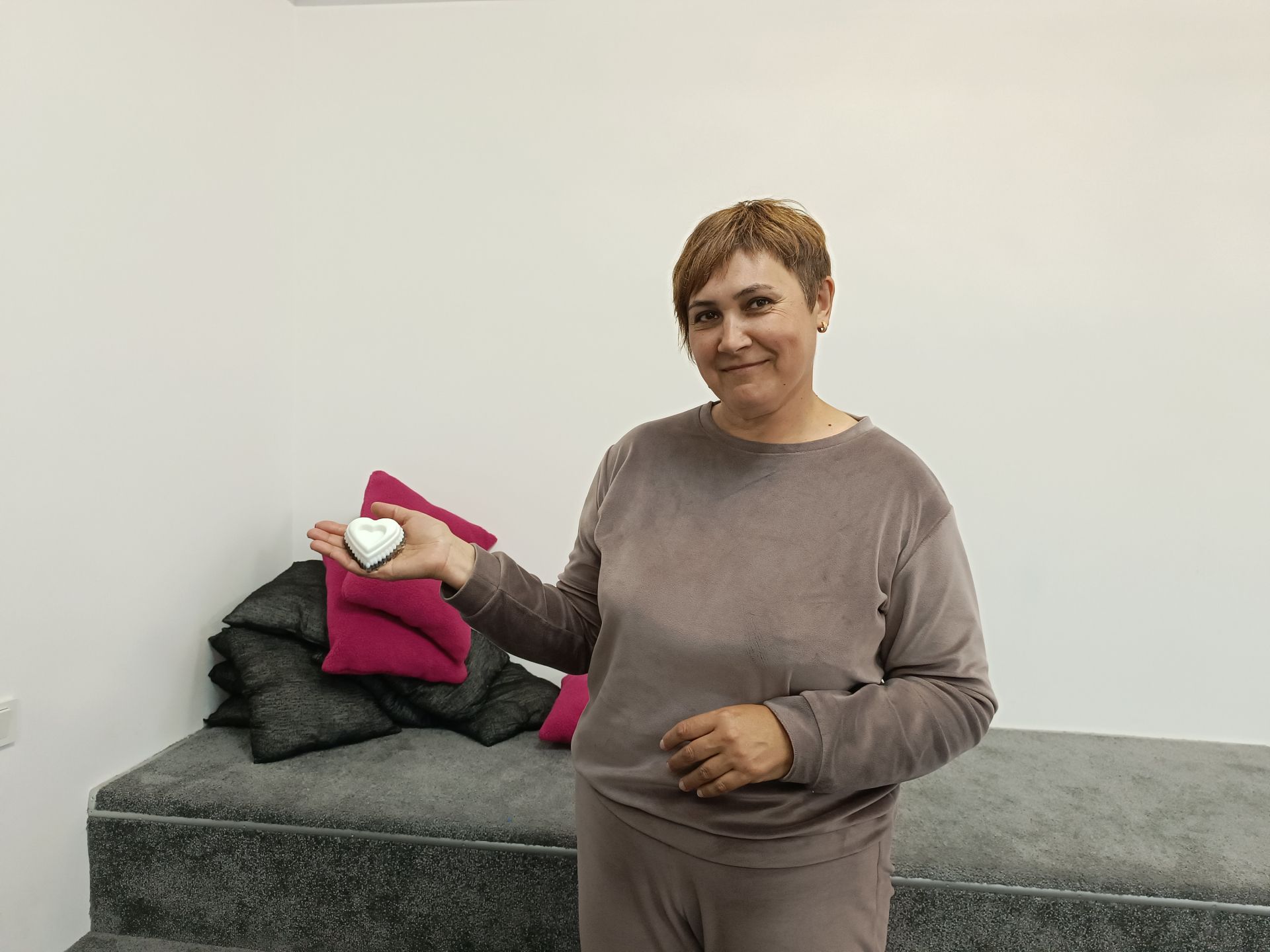 До мильної основи можна додавати сухі квіти лаванди, однак Світлана попереджає — за декілька днів вони трохи потьмяніють. Можна додати насіння чіа, тоді вийде мило з ефектом скрабування. Також можна покласти люфу. Це рослина, з якої роблять натуральні мочалки. Світлана нарізає люфу на шматочки, формує з них сердечка і дає учасницям майстер-класу. Тим, хто взяв собі квіти лаванди, треба ще відділити їх від стеблин.