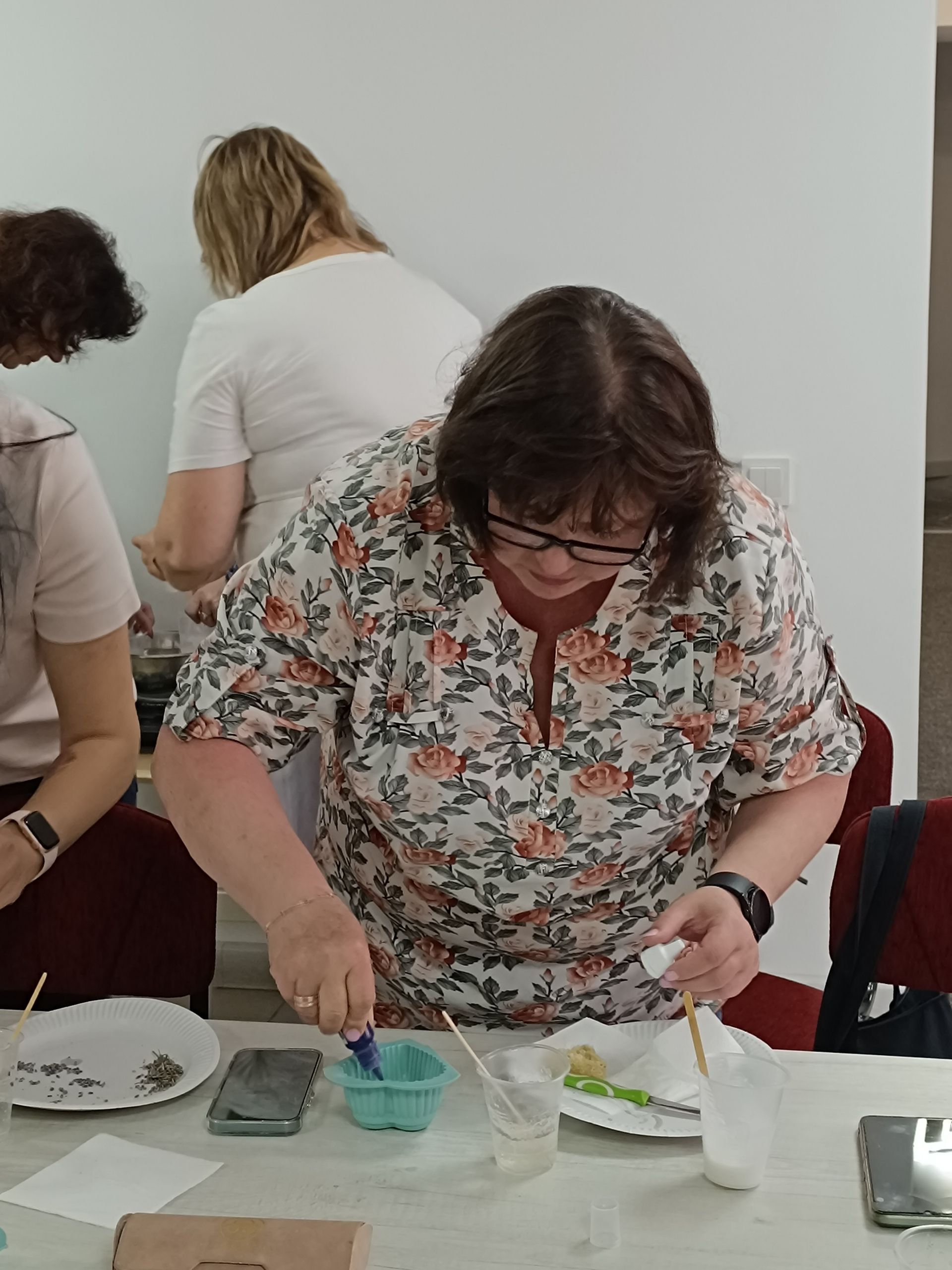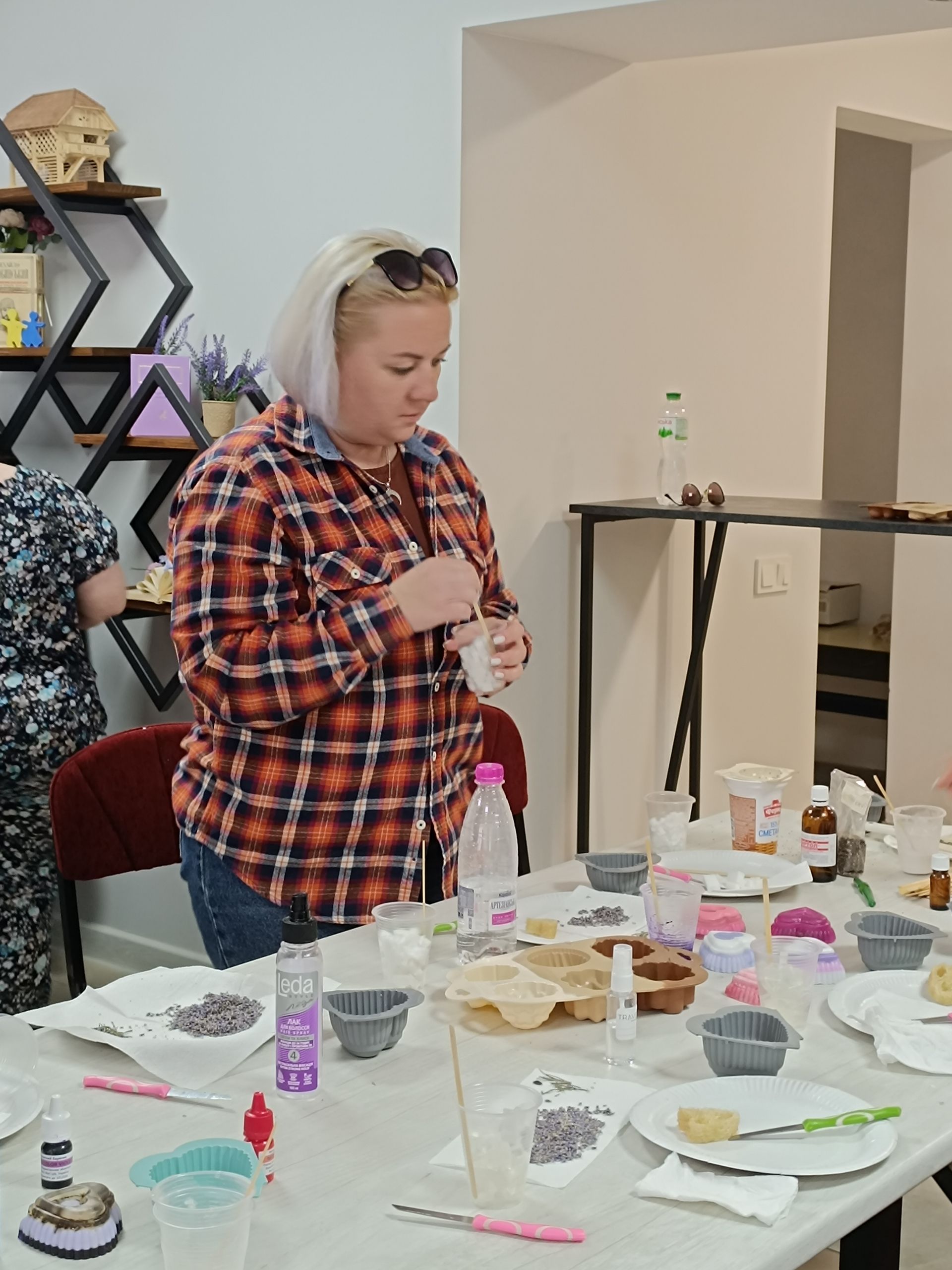 На столі перед кожною учасницею набір предметів, необхідних для роботи: дерев’яна паличка, пластиковий стаканчик, силіконова форма, невеликий ніж та два бруски — один прозорий, інший білий. Це — основа майбутнього мила.