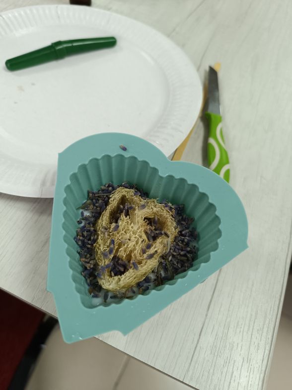 Поки учасниці майстер-класу розтоплюють основу для наступного шару, мило, вже залите у форми, застигає. Минає трохи менше години і духмяне мило готове. Олена до свого поклала і квіти лаванди, і люфу.