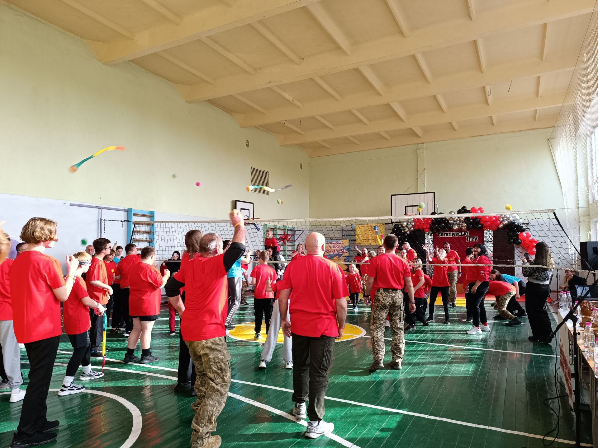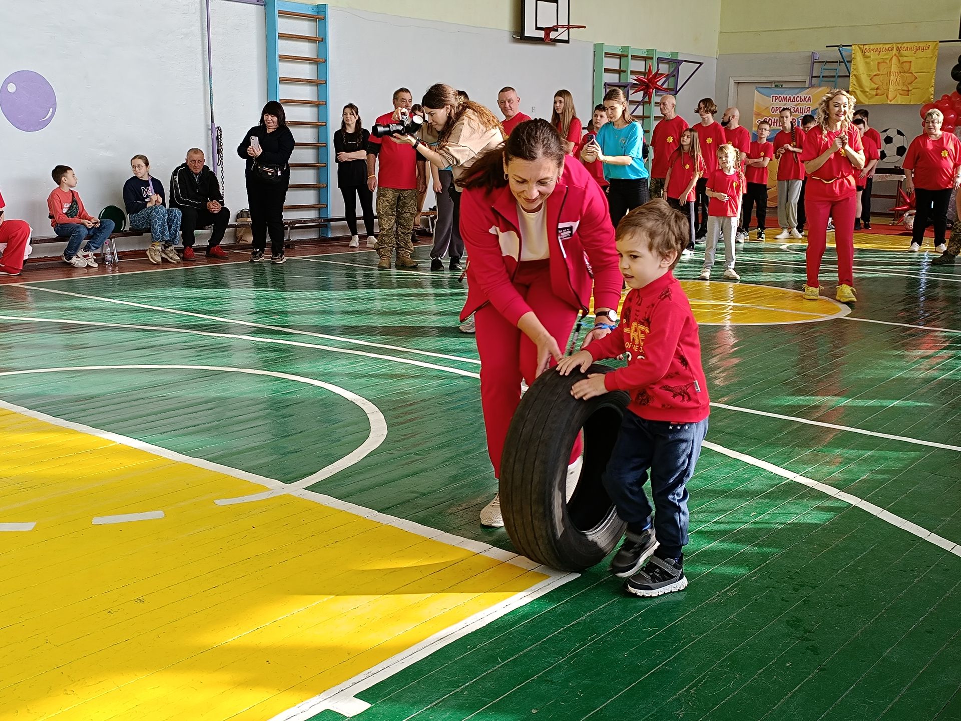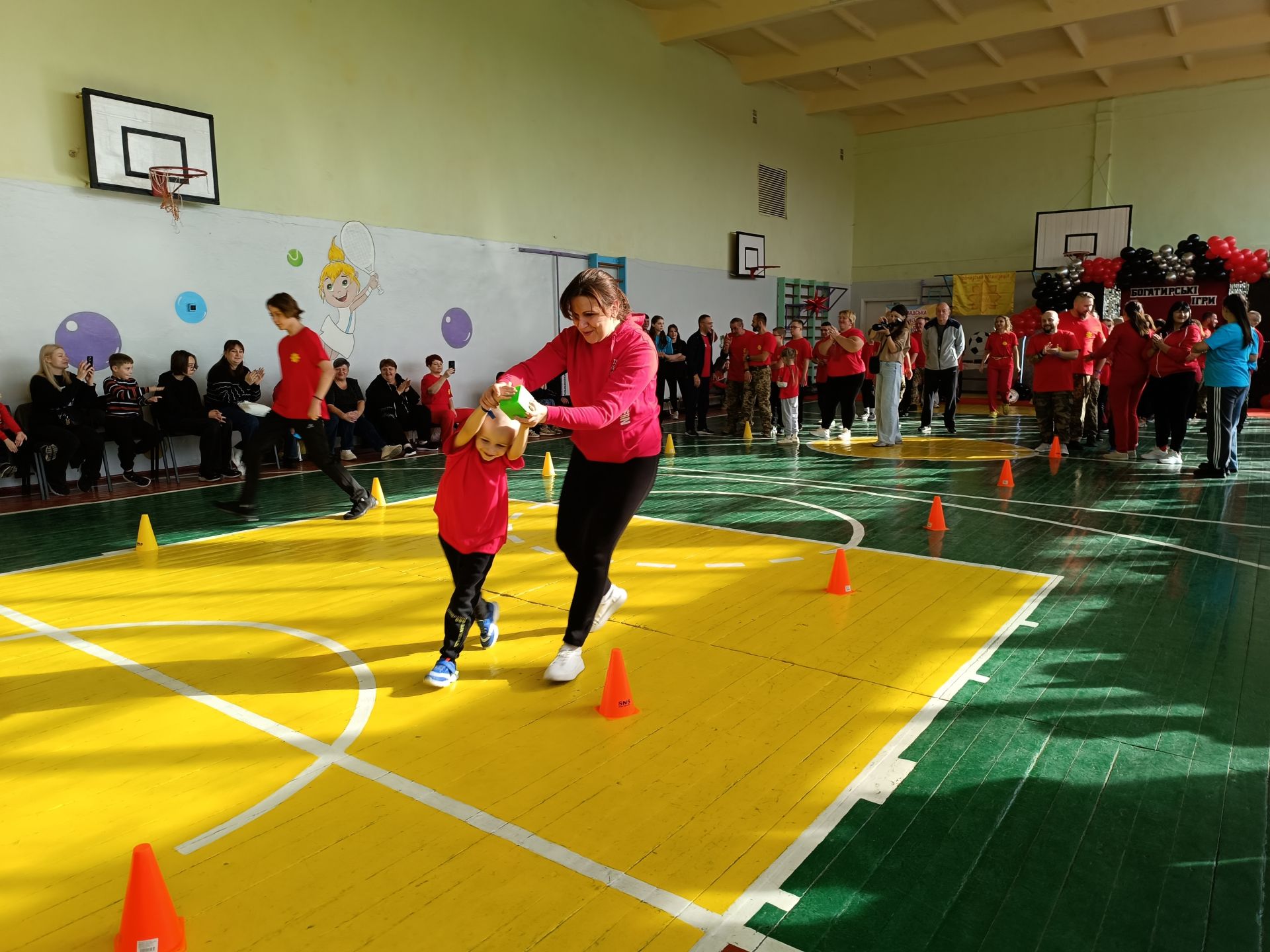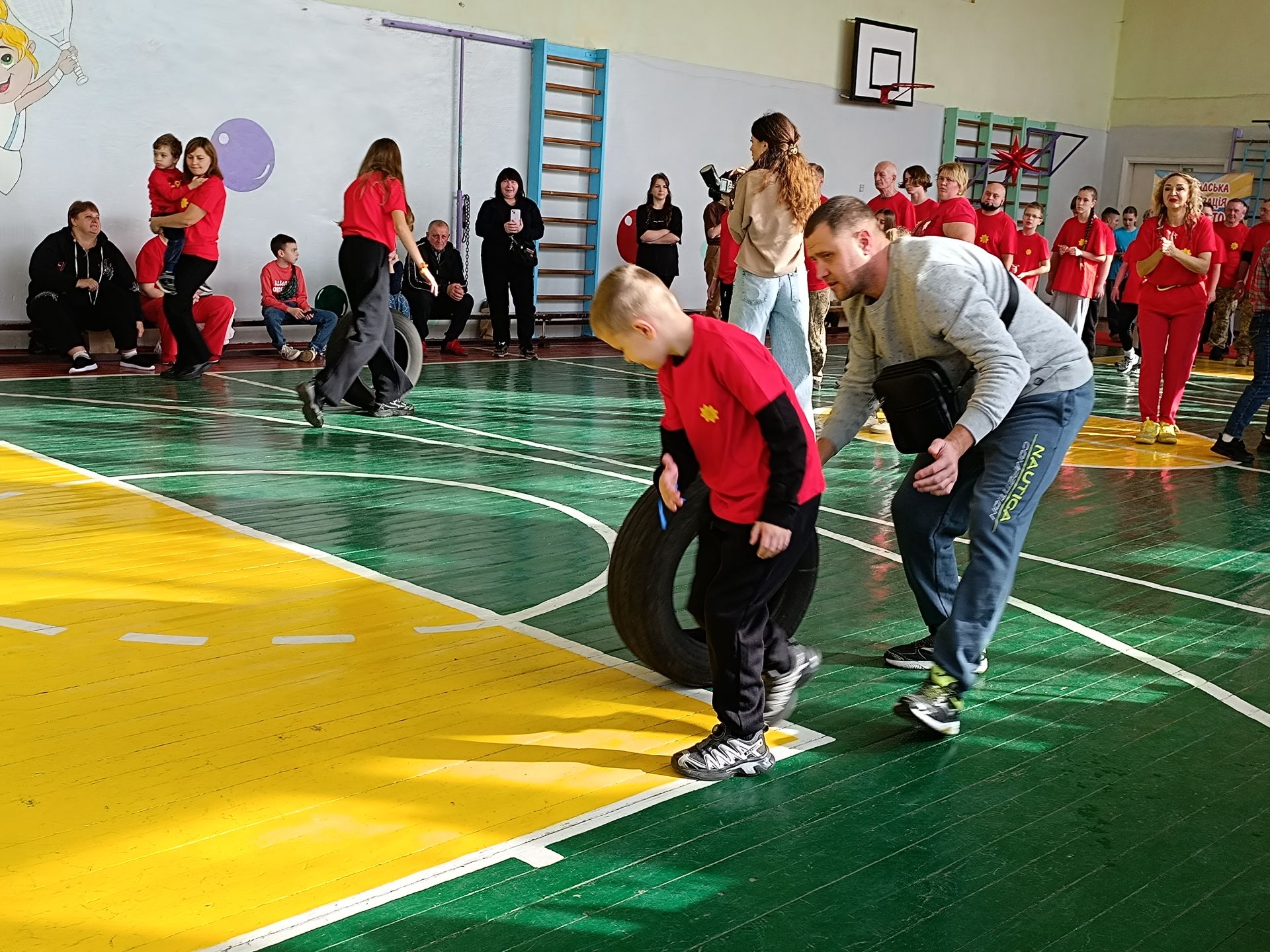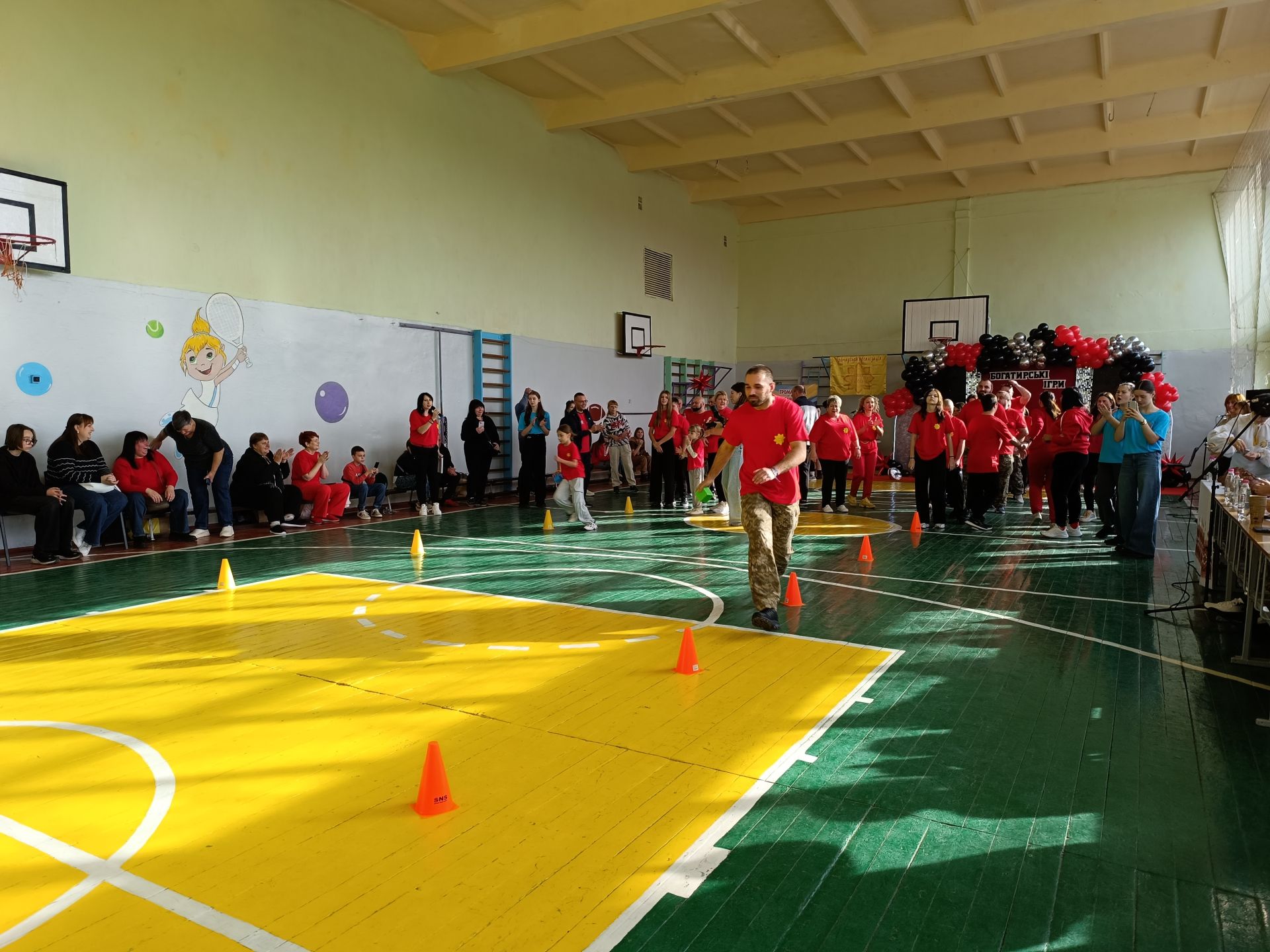 Головний суддя змагань, вчитель фізкультури опорного ліцею Віктор Стадник пояснює правила першого завдання: оббігти фішки та передати естафету наступному учаснику. Бігтимуть діти й ветерани не з пустими руками: «Залізні серця» отримують синій кубик, а «Воїни світла» — зелений. За командою судді учасники стартують. Наймолодшим і тим, кому важко бігти, допомагають капітани, батьки та ветерани. Першими естафету завершили «Залізні серця».