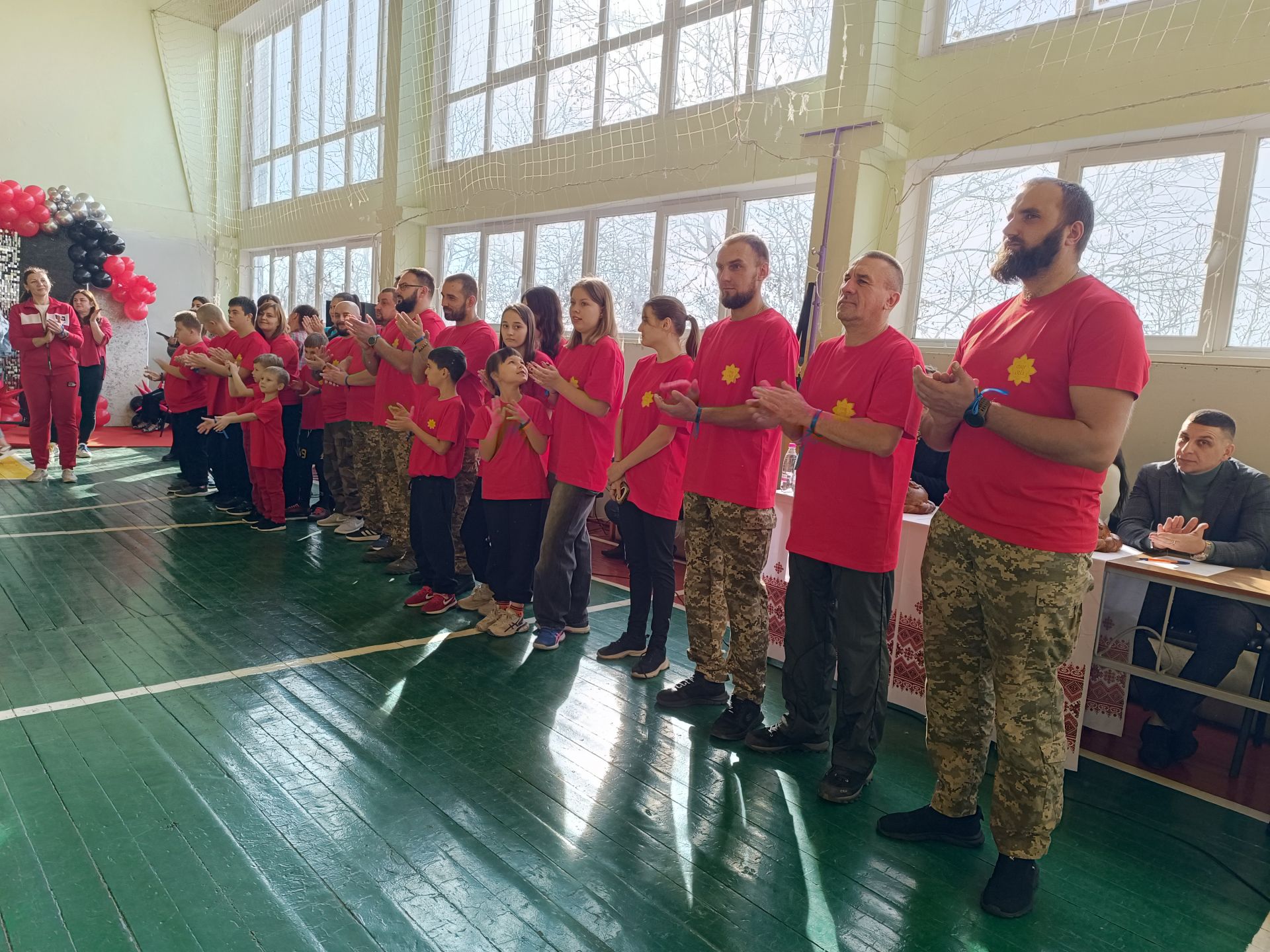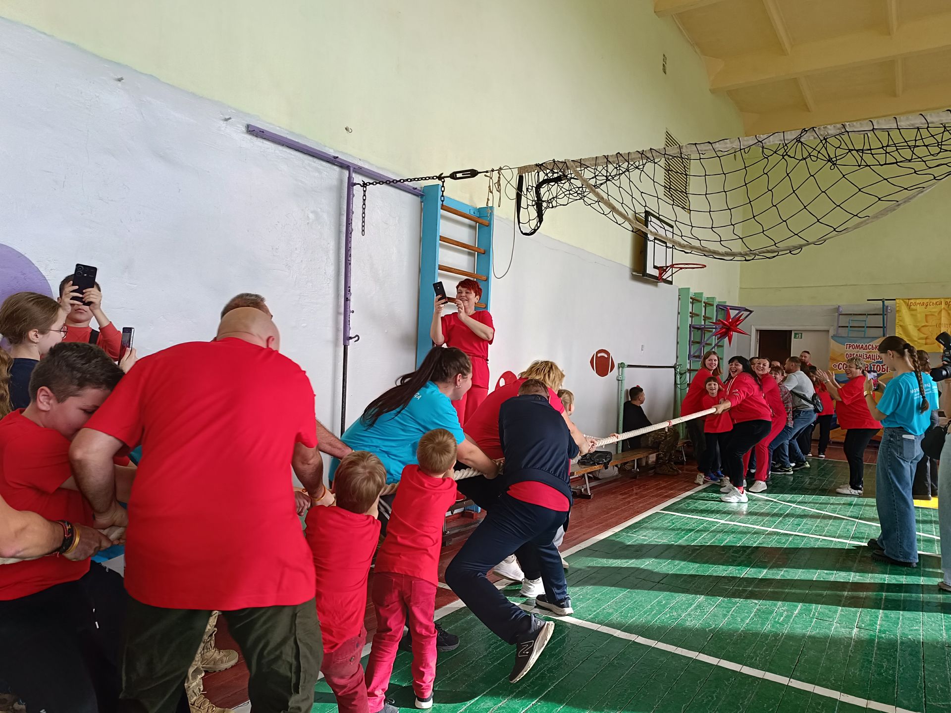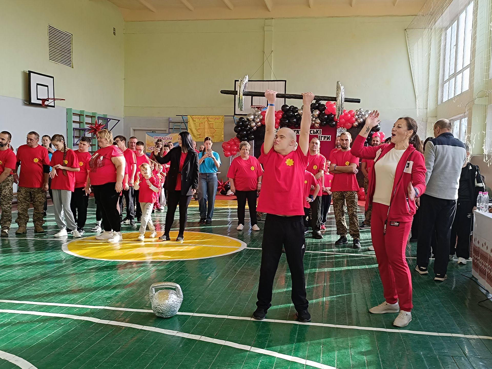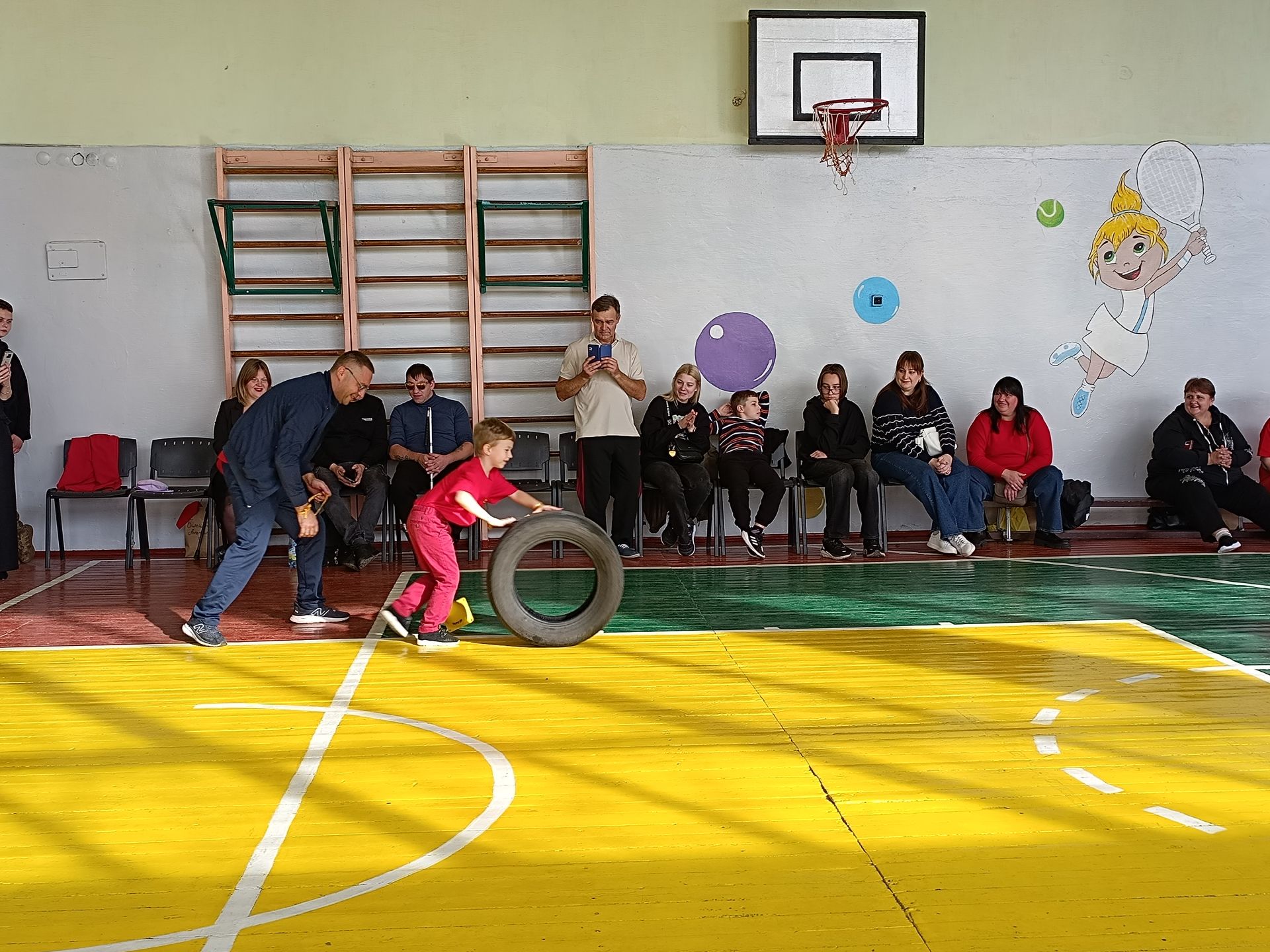 Головний суддя змагань, вчитель фізкультури опорного ліцею Віктор Стадник пояснює правила першого завдання: оббігти фішки та передати естафету наступному учаснику. Бігтимуть діти й ветерани не з пустими руками: «Залізні серця» отримують синій кубик, а «Воїни світла» — зелений. За командою судді учасники стартують. Наймолодшим і тим, кому важко бігти, допомагають капітани, батьки та ветерани. Першими естафету завершили «Залізні серця».