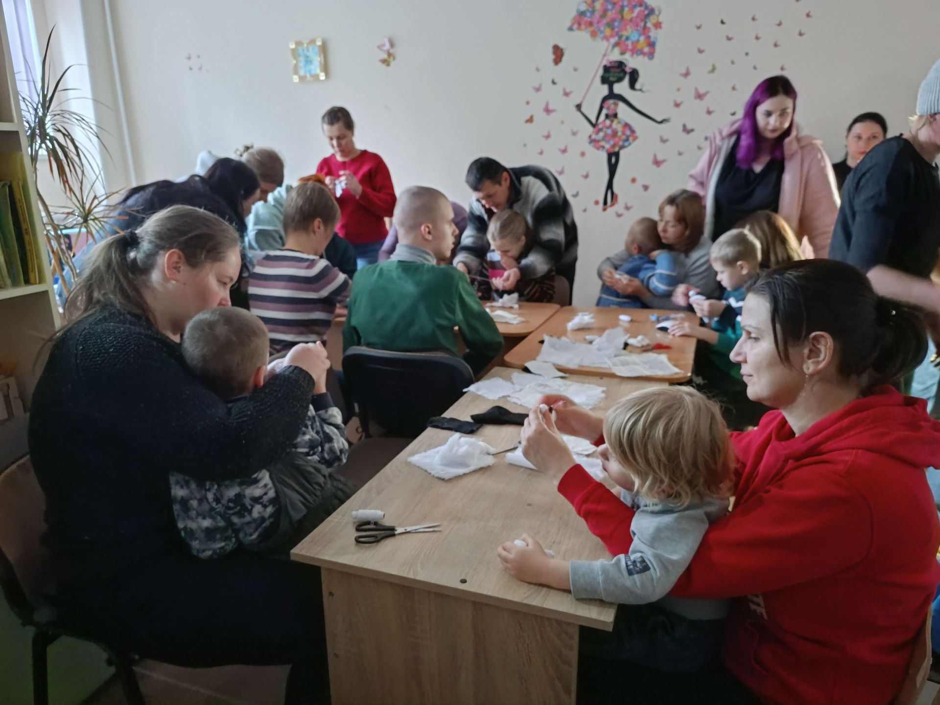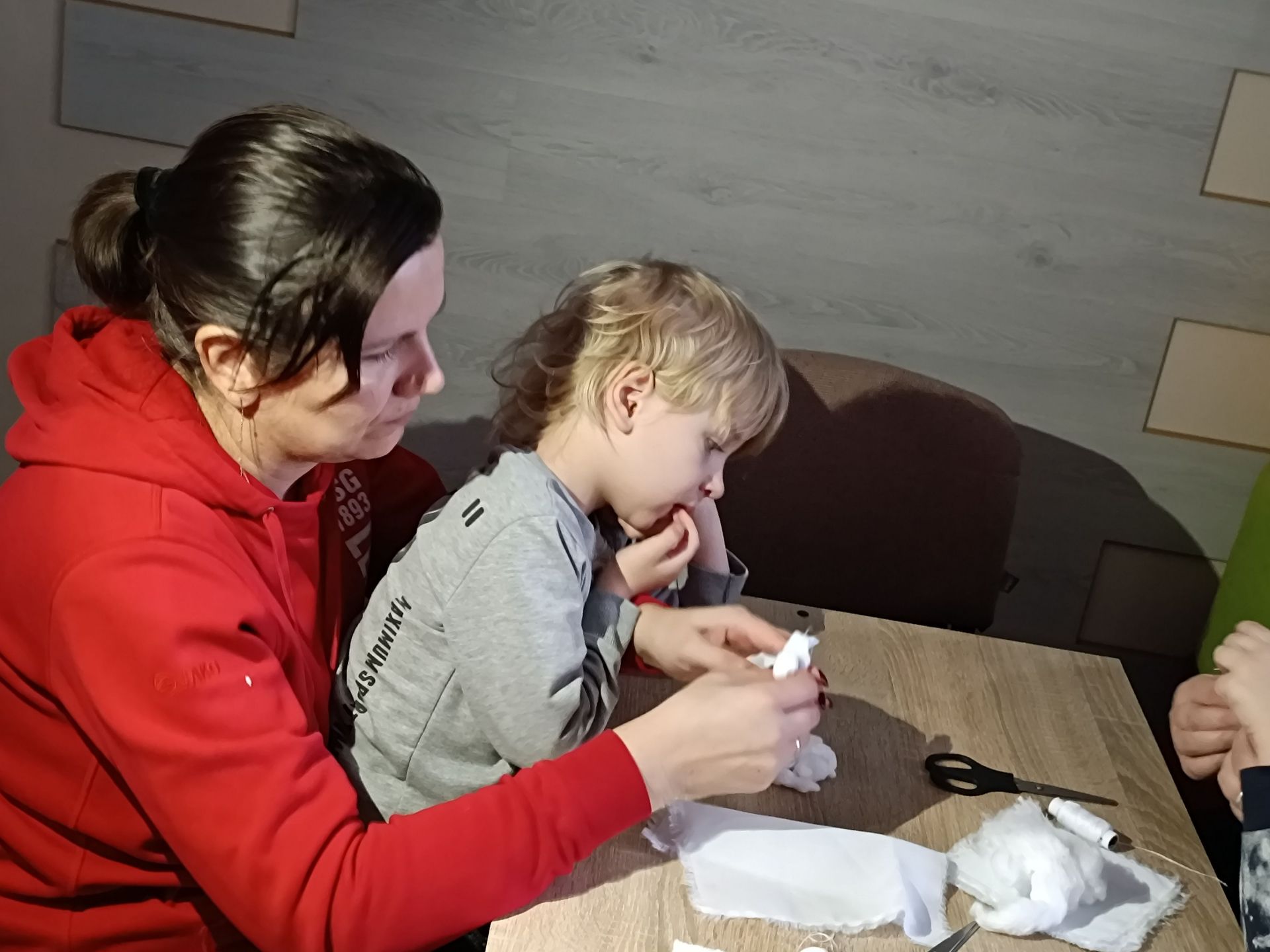 На столах перед дітьми та їх батьками тканина, нитки, шматочки вати та стрічки. Перша іграшка, яку вони робитимуть — це янгол. Він виконується у техніці ляльки-мотанки — для формування та приєднання різних частин іграшки використовуються лише нитки. При чому ними не пришивають, а примотують різні деталі. Наталія Баштова покроково показує, як створити янгола — спершу голову та руки, потім крила. Для когось із батьків це перший подібний досвід, тому потрібна допомога. Хтось уже раніше мотав мотанку, тож береться за роботу з розумінням справи.
