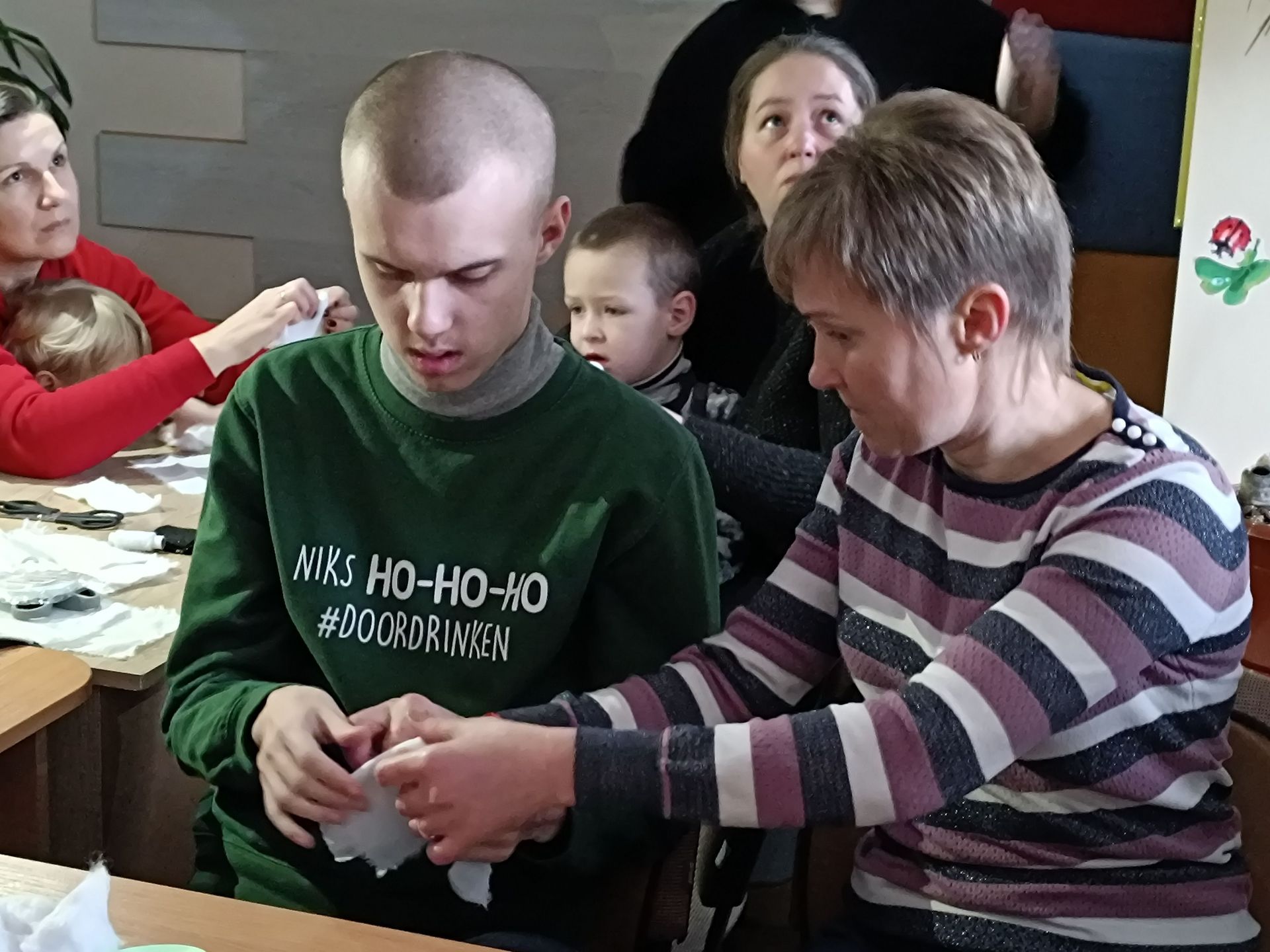 Минає п’ятнадцять хвилин і майже всі своїх янголів вже зробили. Олесь, якому допомагала директорка центру Марина Гончарук, встиг змотати одразу дві іграшки — велику і маленьку. Залишається придумати, як повісити янгола на ялинку.