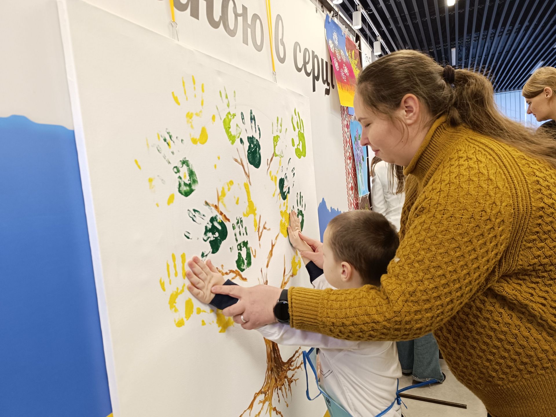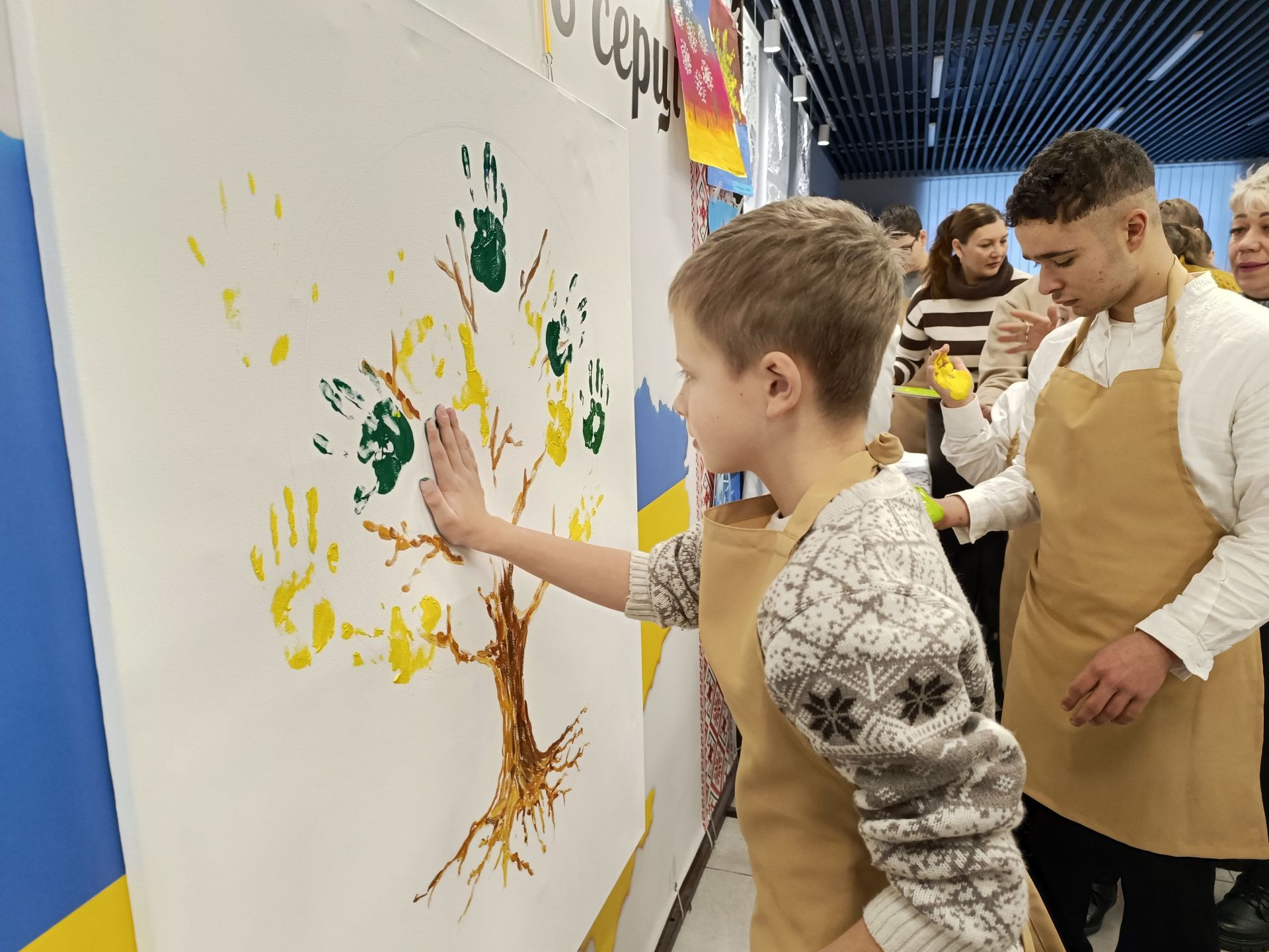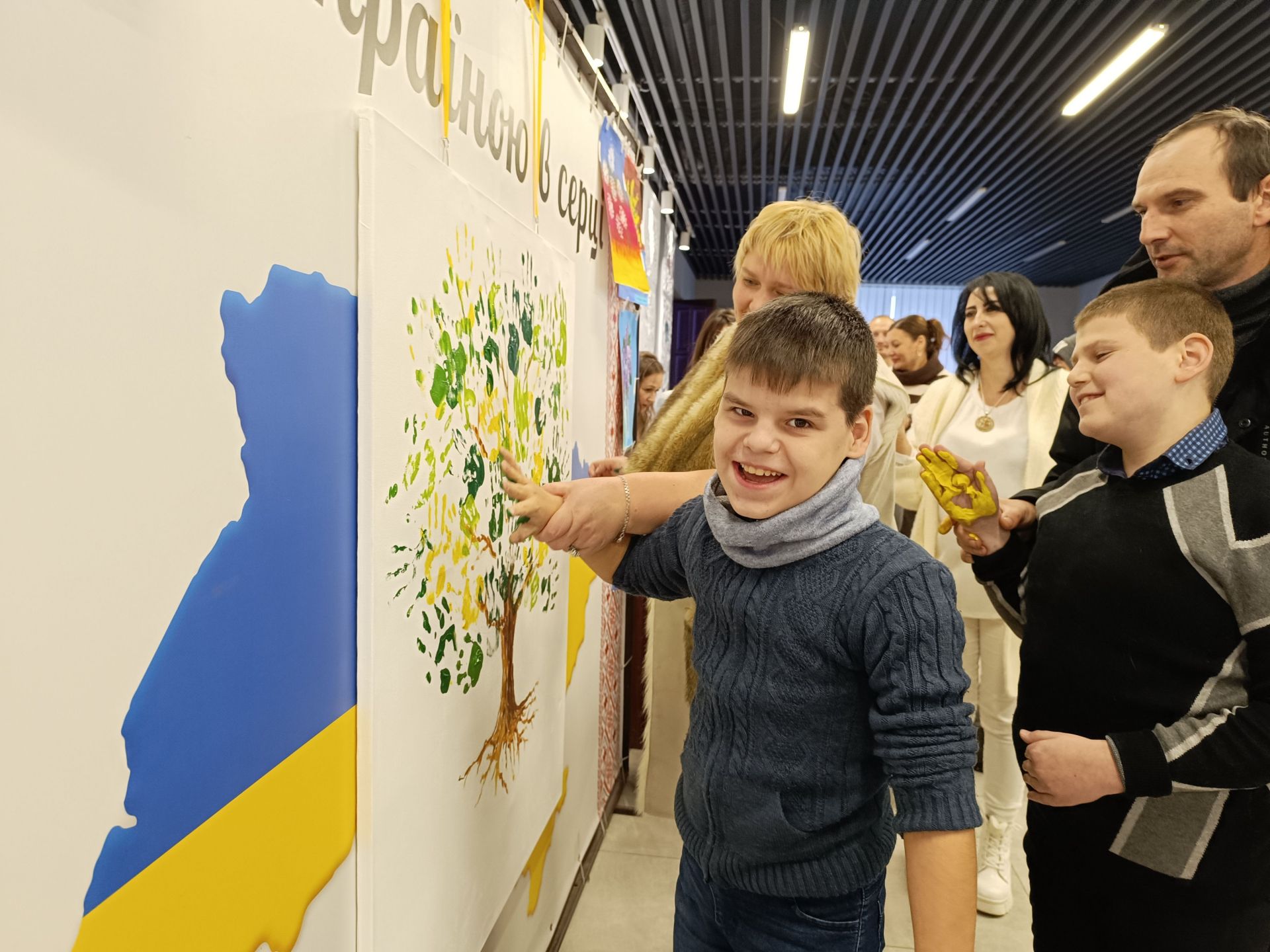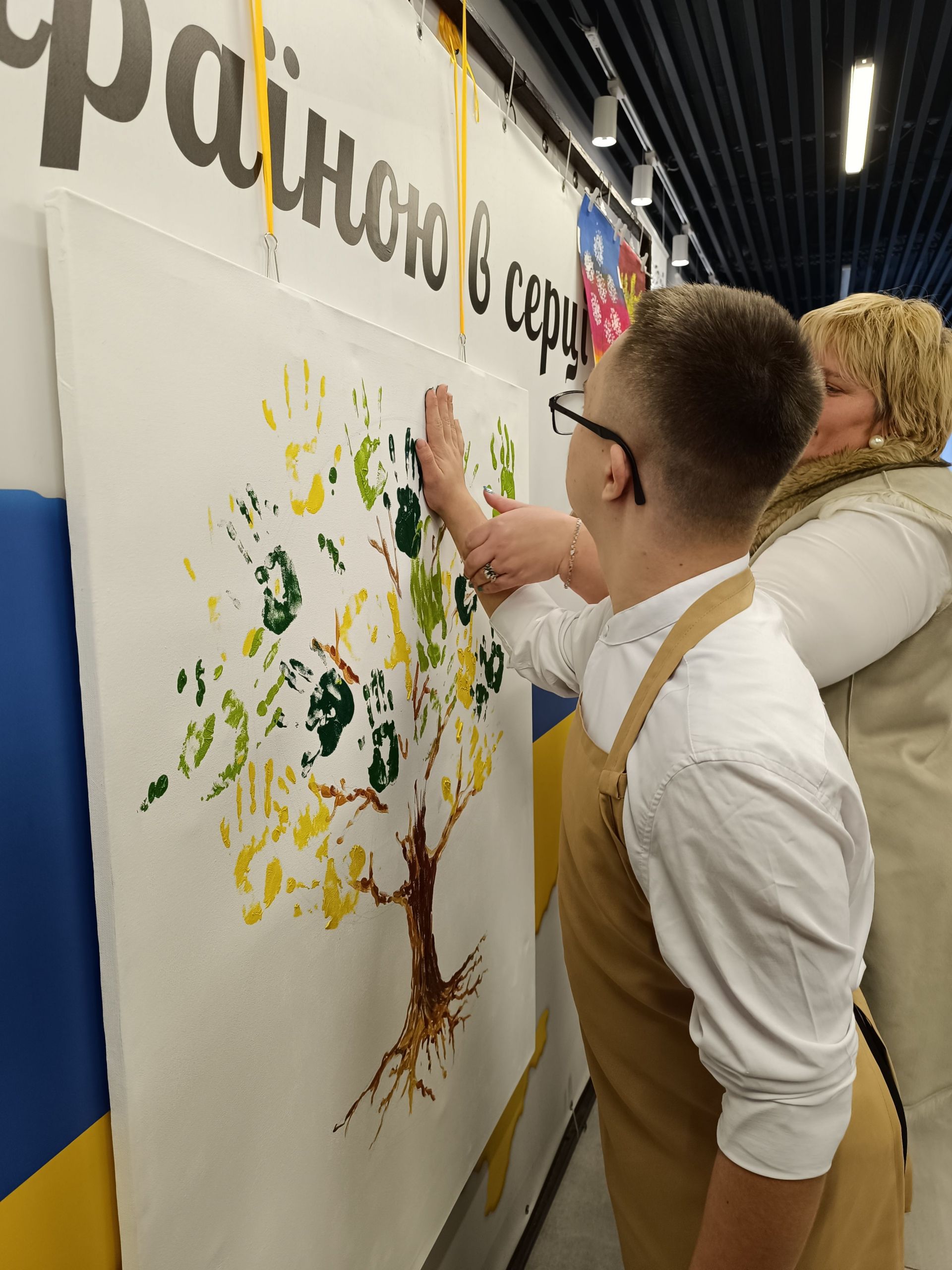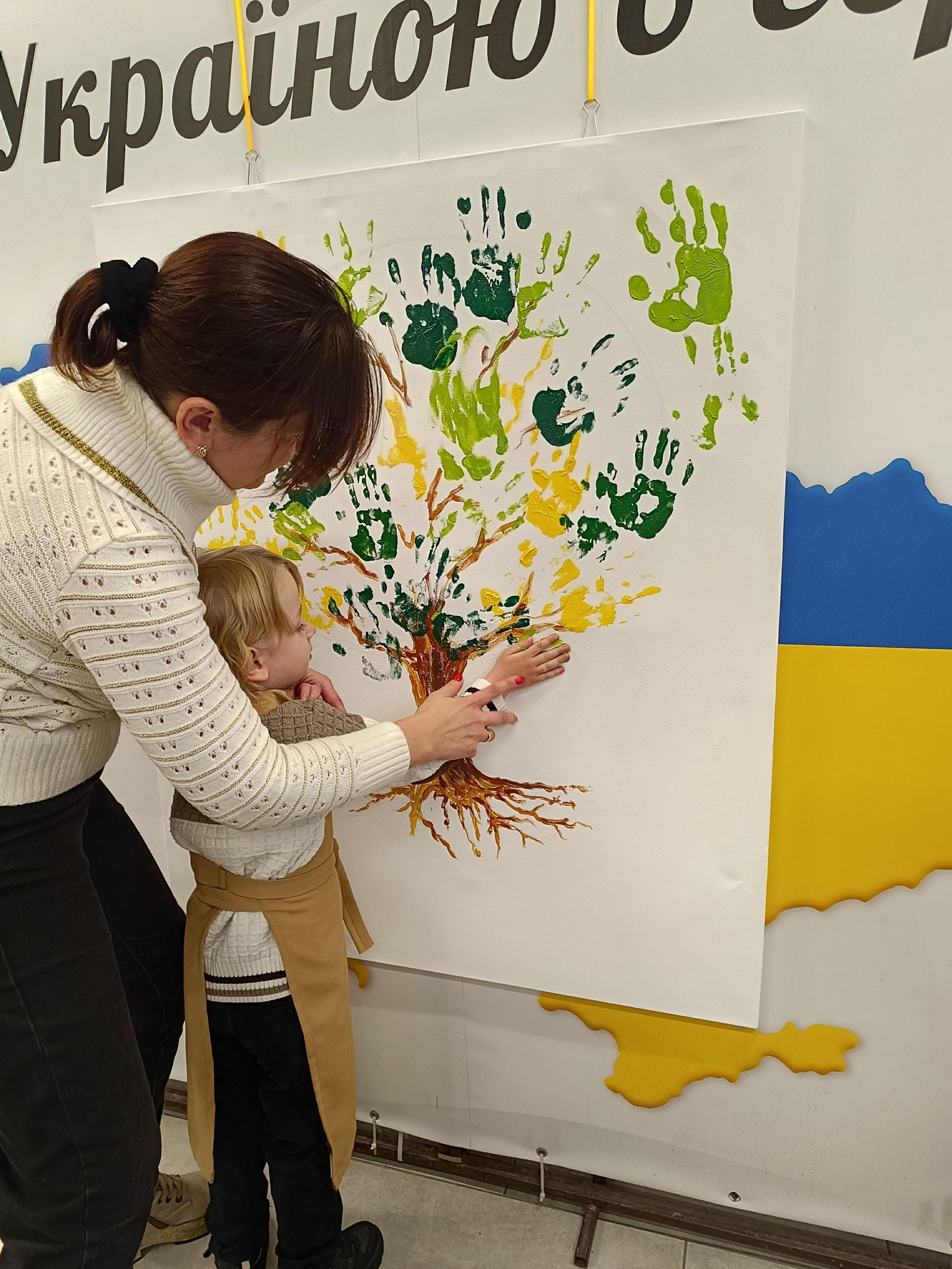 Минає декілька хвилин і на білому полотні з’являється стовбур дерева та гілки. Попрацювати над кроною запрошують дітей. Але малюватимуть вони не пензлями, а своїми руками. Хлопчики з дівчатками по-черзі підходять до волонтерів, занурюють долоні у фарбу і ставлять на полотні відбитки жовтого та зеленого кольорів. Комусь допомагають волонтери, комусь — батьки. Дорослі не стояли осторонь і також долучилися до створення картини.