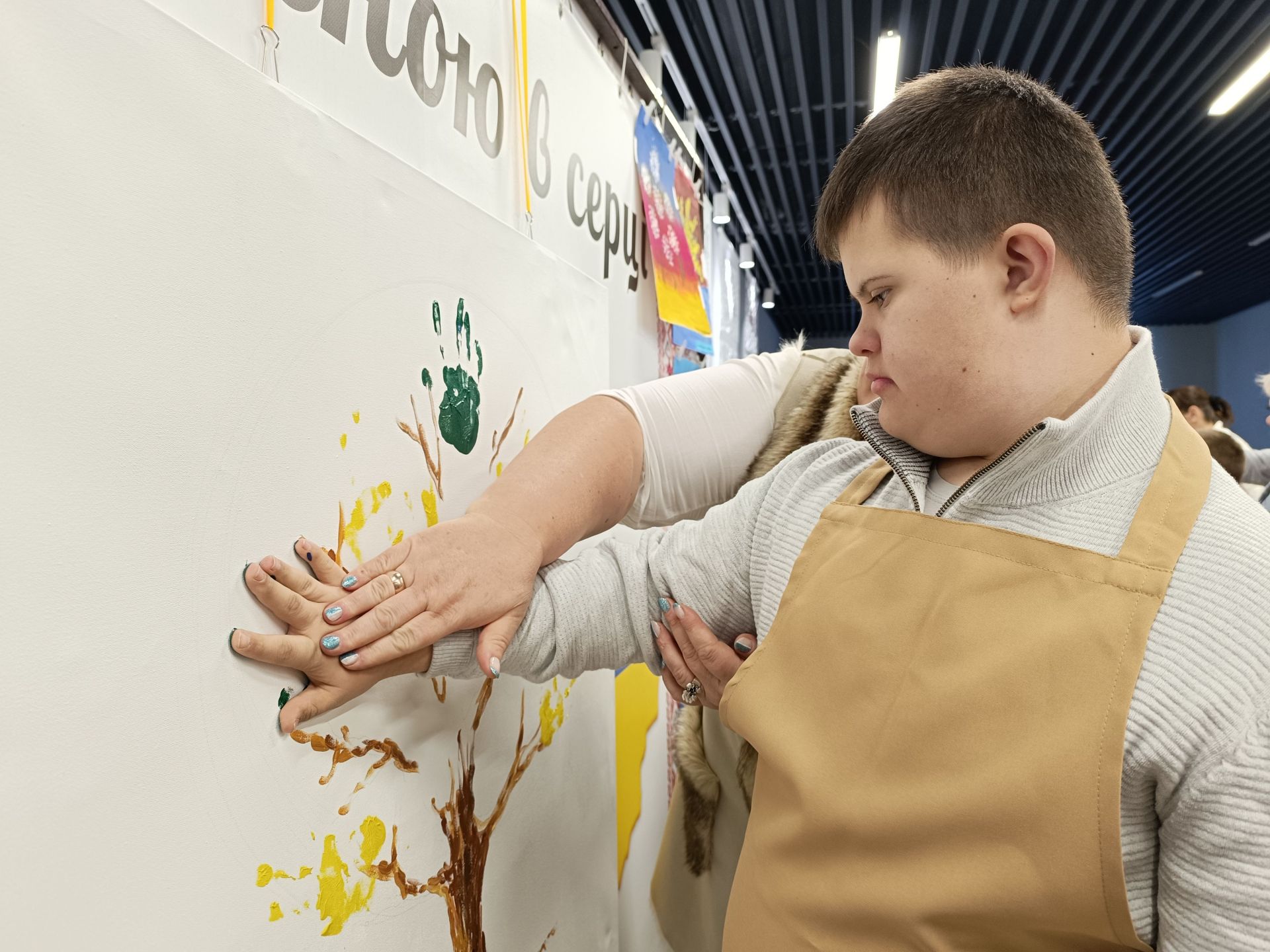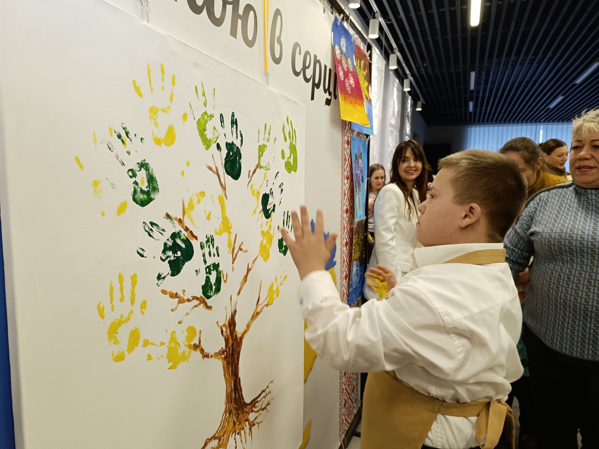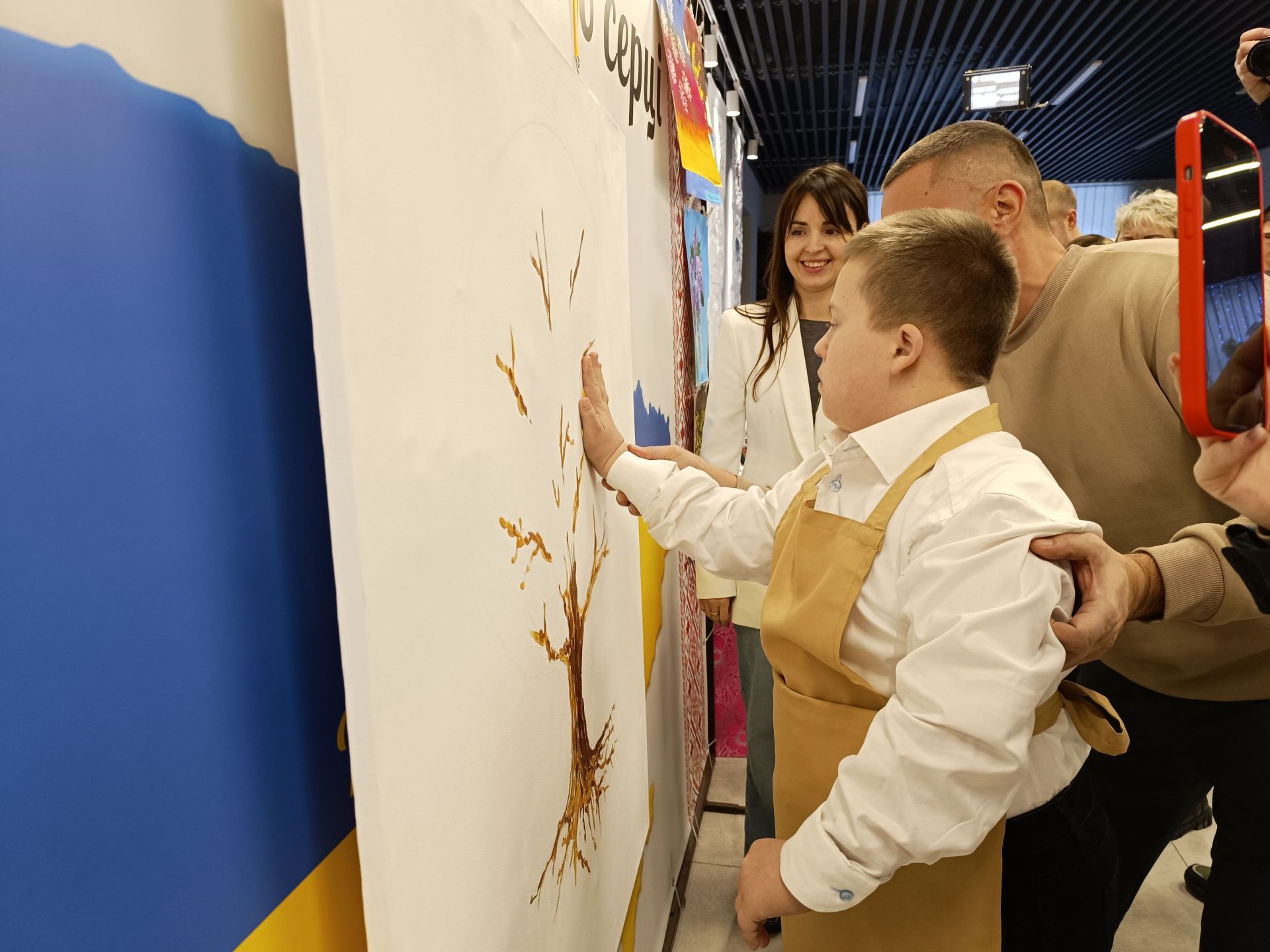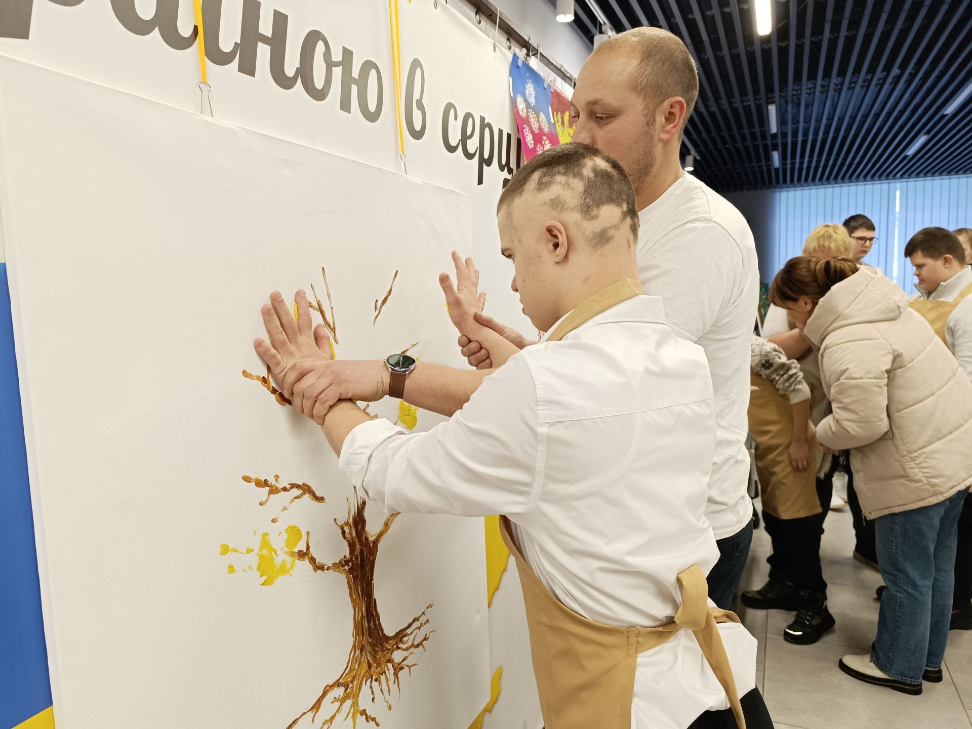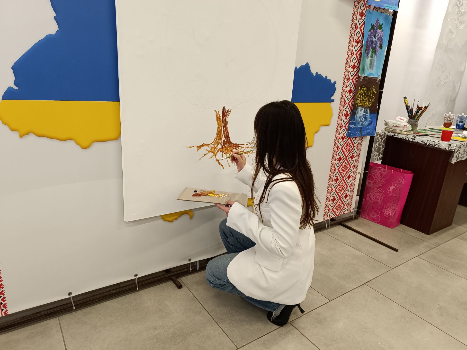 Минає декілька хвилин і на білому полотні з’являється стовбур дерева та гілки. Попрацювати над кроною запрошують дітей. Але малюватимуть вони не пензлями, а своїми руками. Хлопчики з дівчатками по-черзі підходять до волонтерів, занурюють долоні у фарбу і ставлять на полотні відбитки жовтого та зеленого кольорів. Комусь допомагають волонтери, комусь — батьки. Дорослі не стояли осторонь і також долучилися до створення картини.