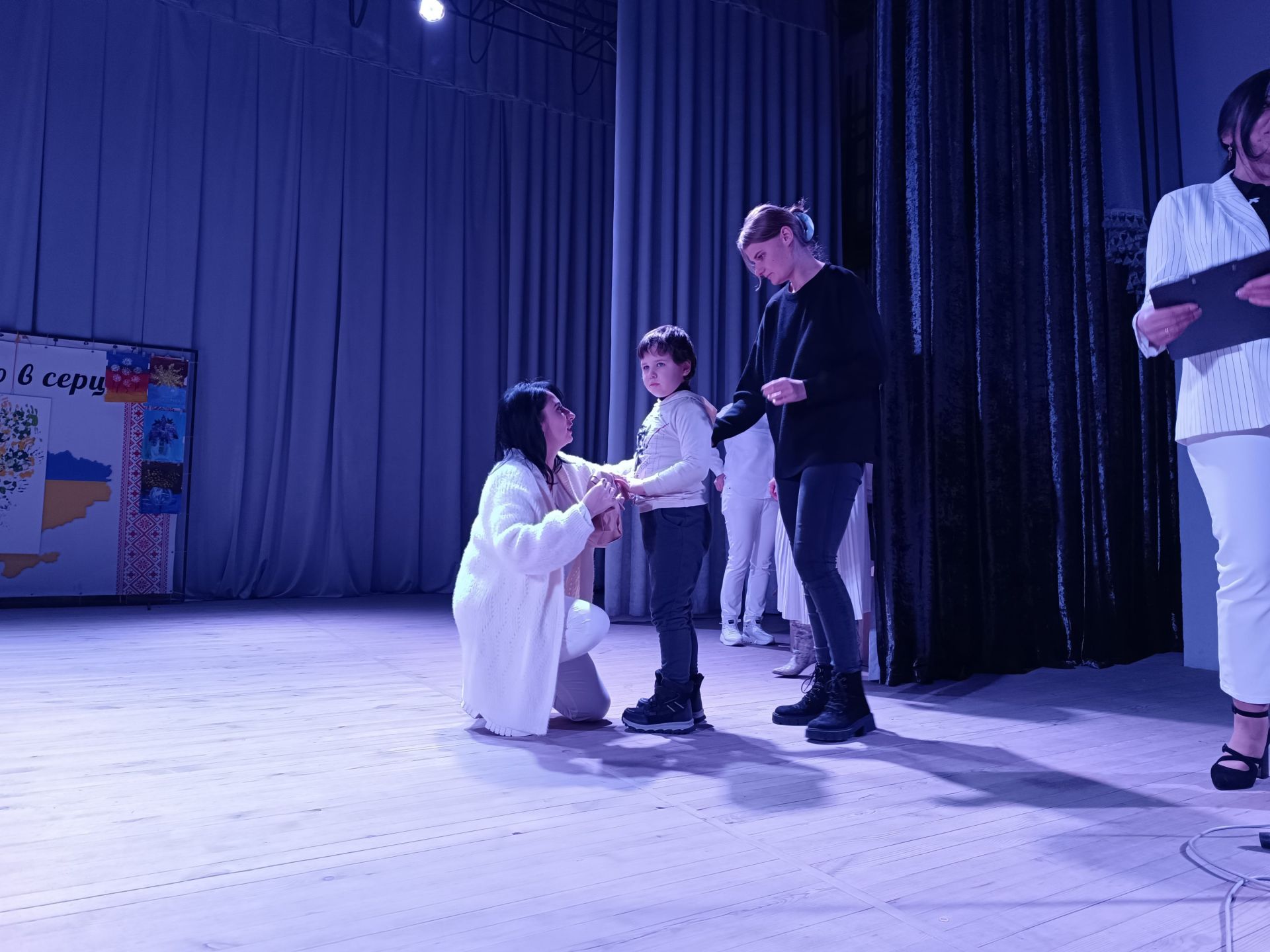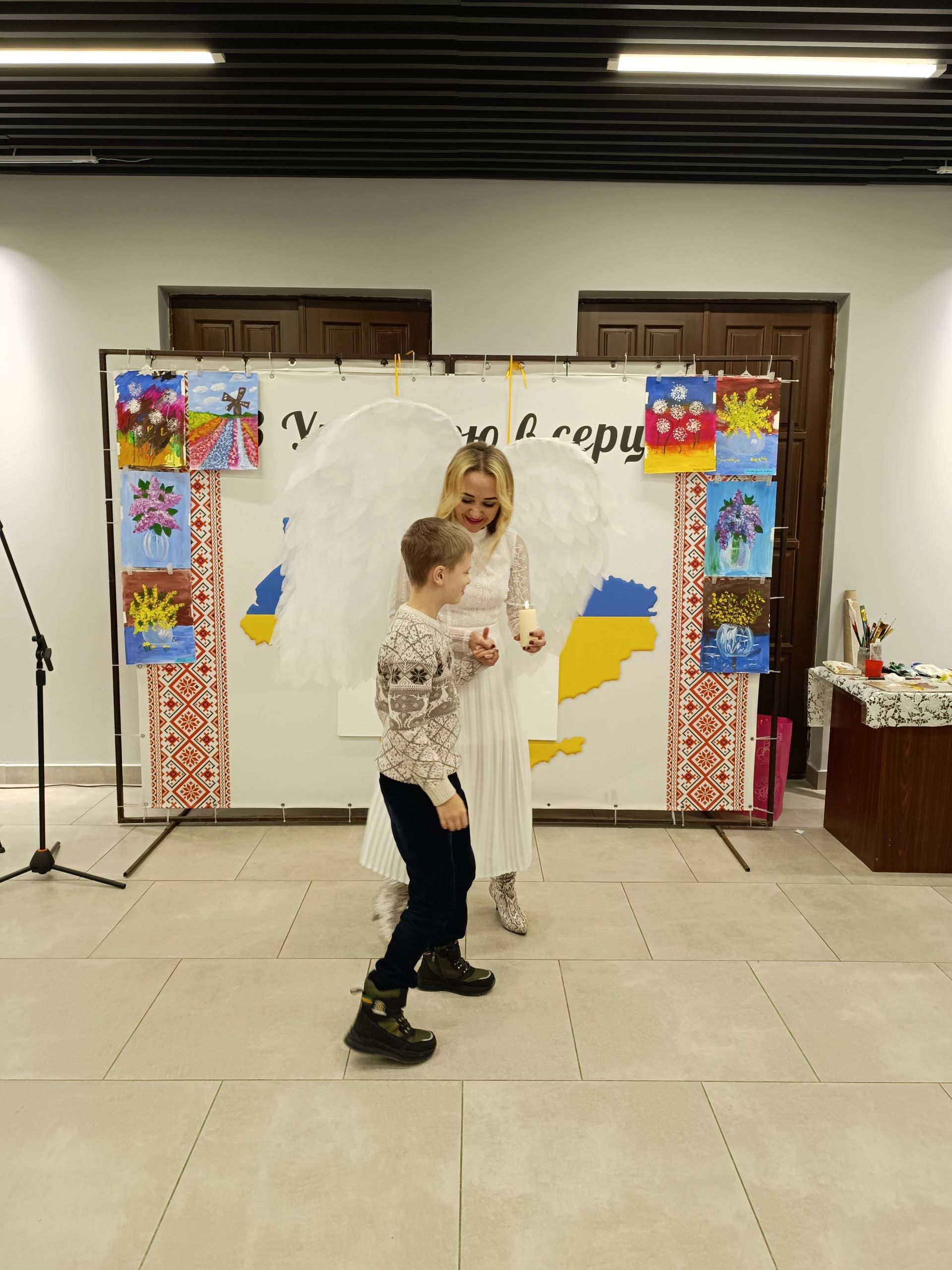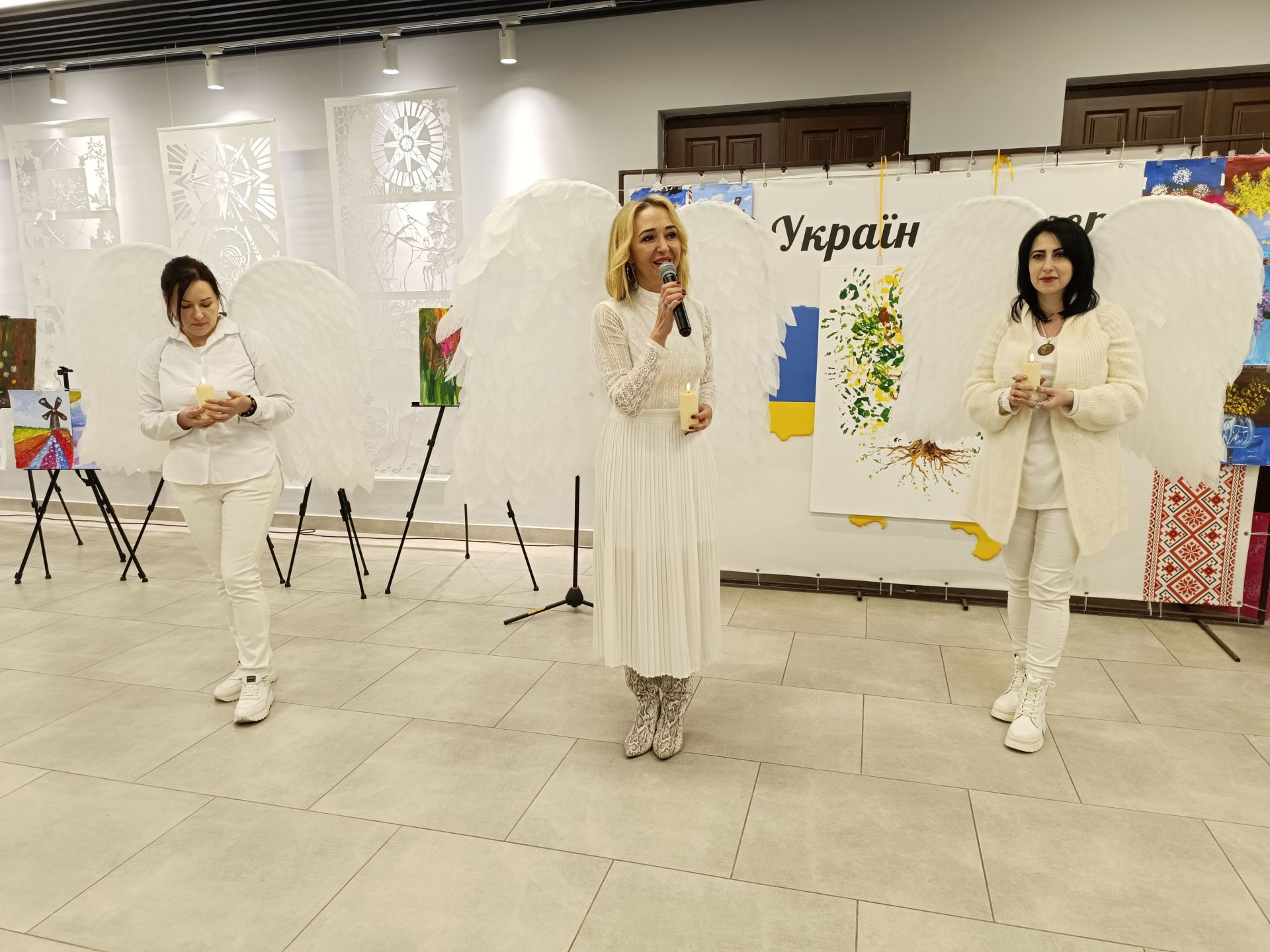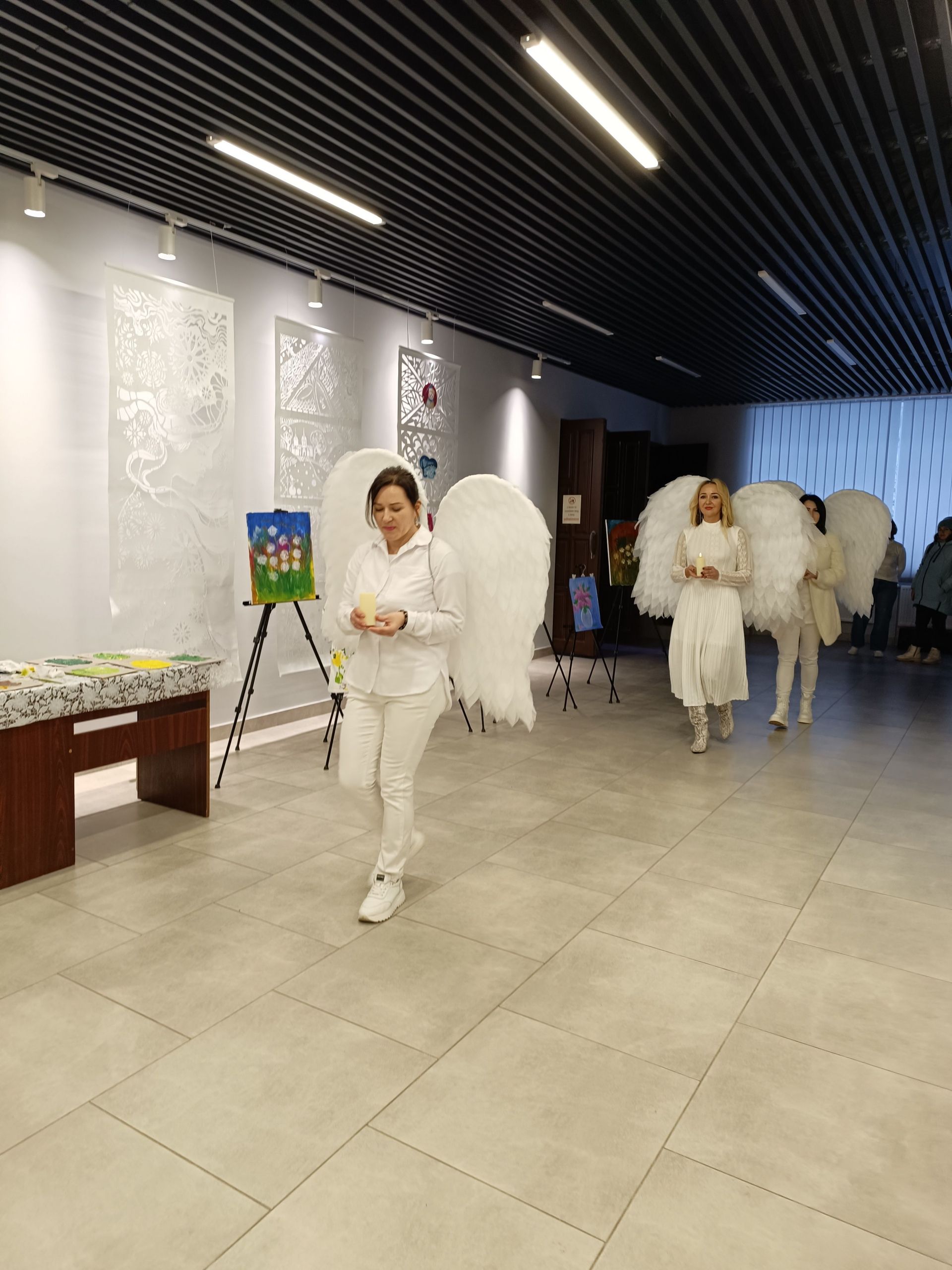 До фойє заходять голова громадської організації «Сонце в тобі» Ірина Шахін та волонтери Олександра Омельчук і Марина Чагіна. За спинами в них білі крила, адже вони в образі янголів. У руках тримають свічки.