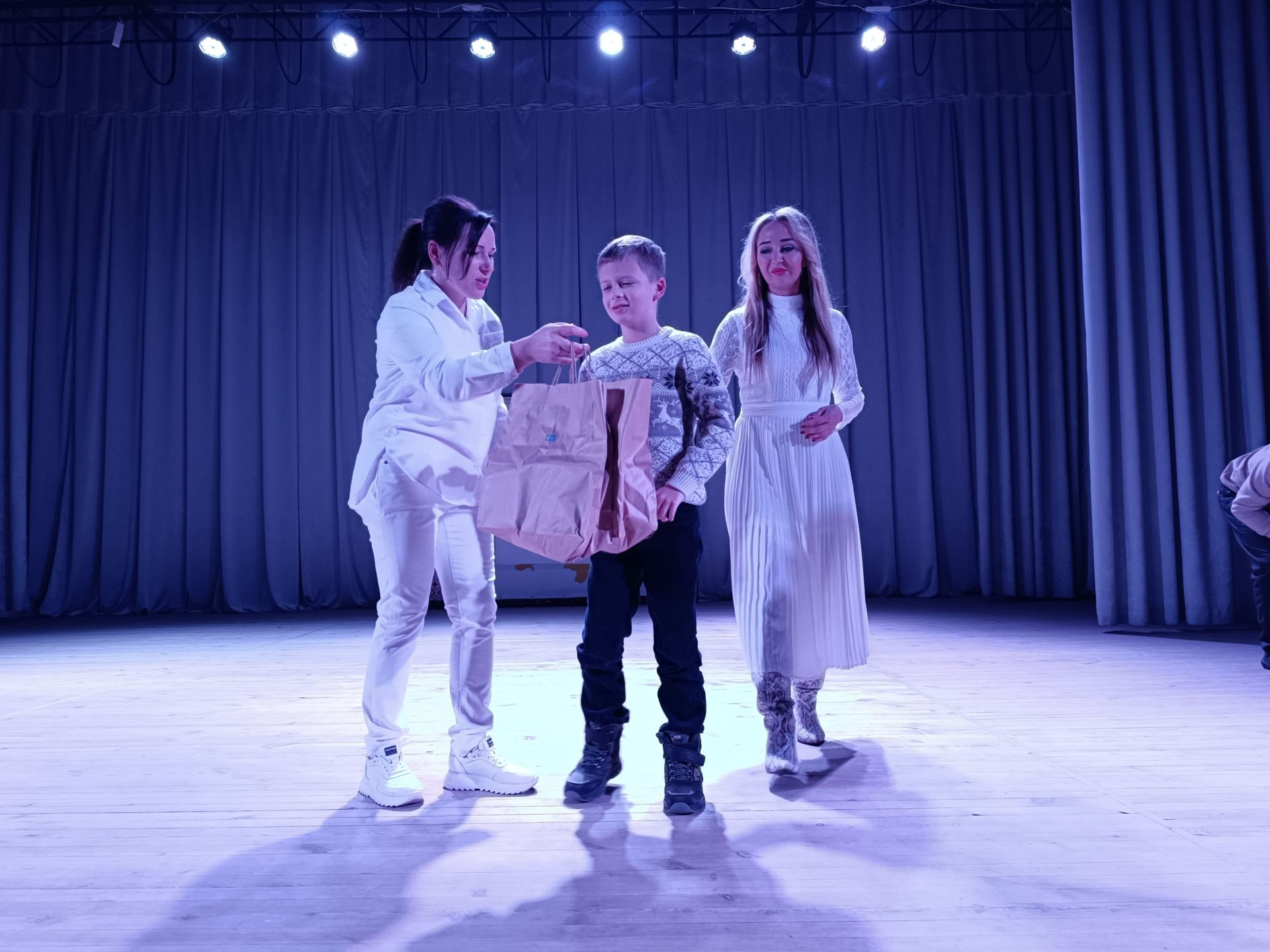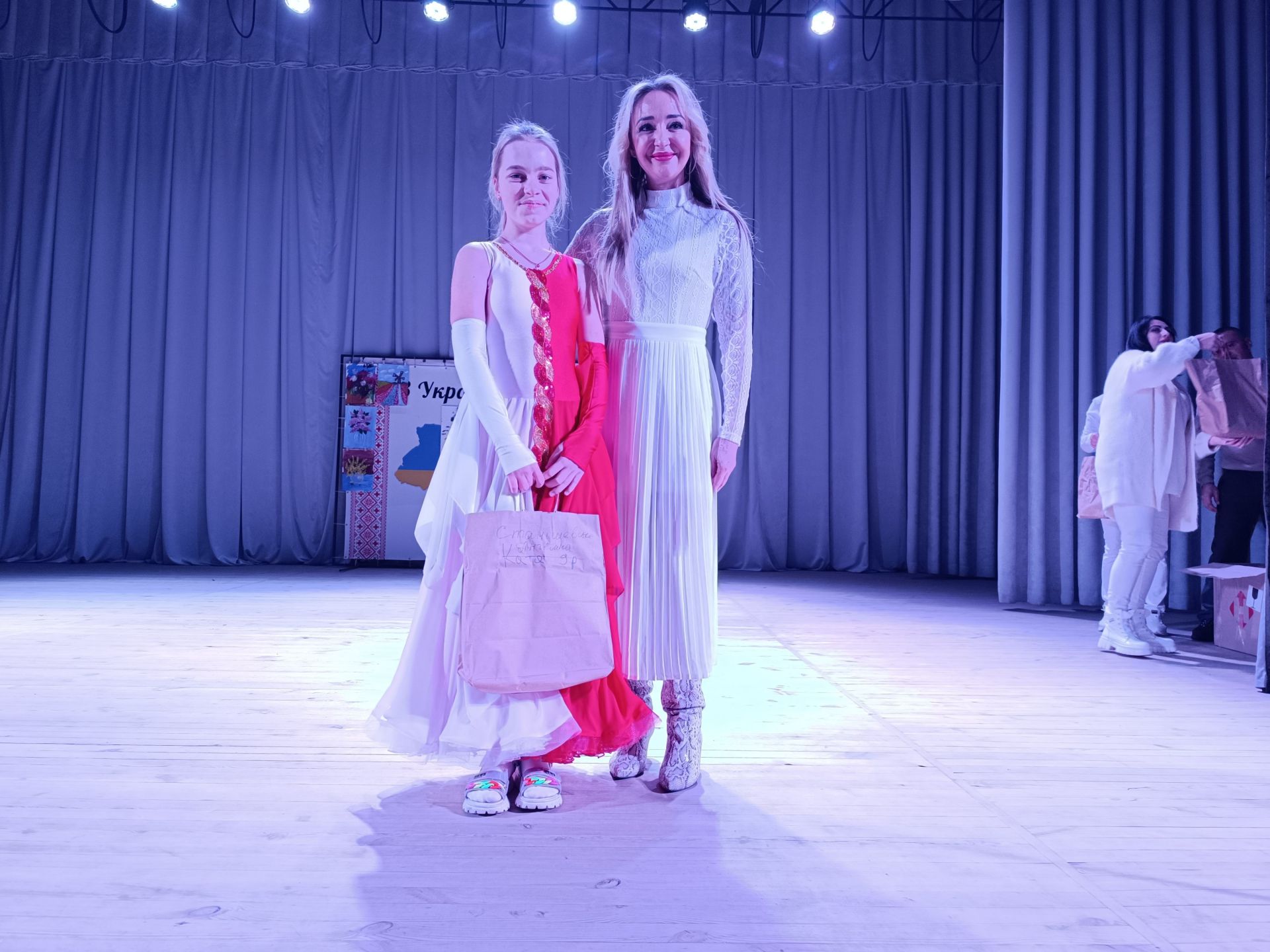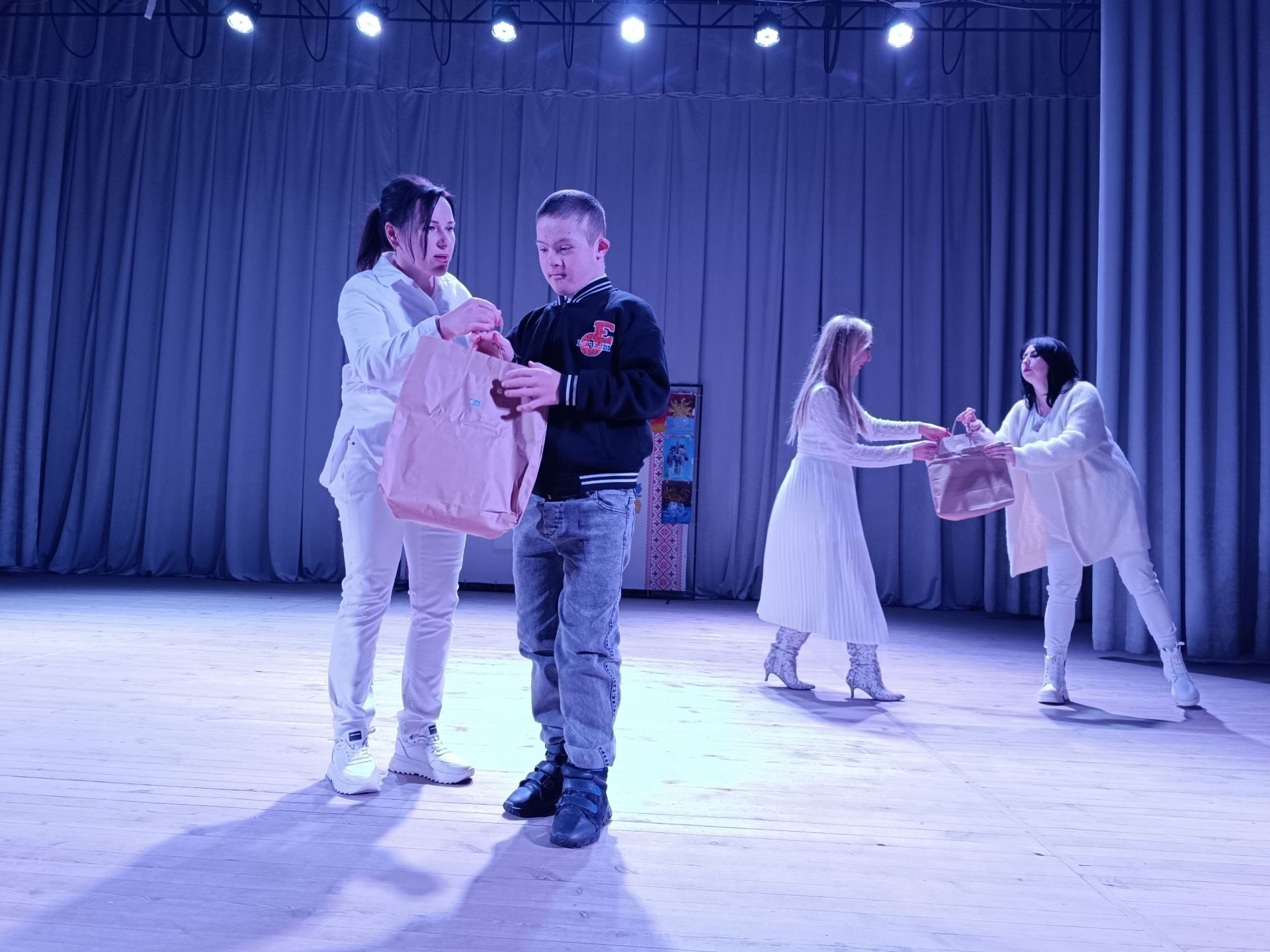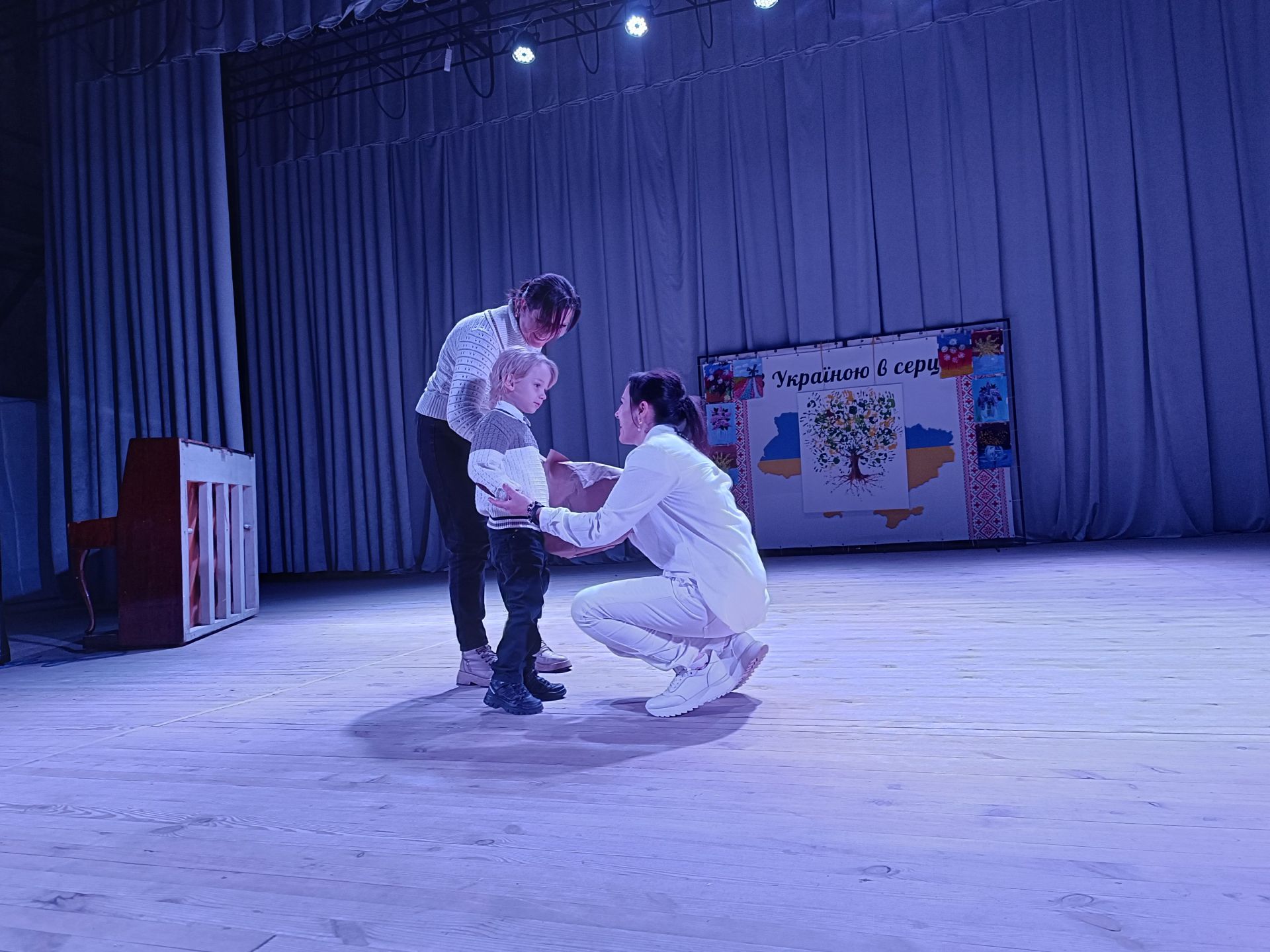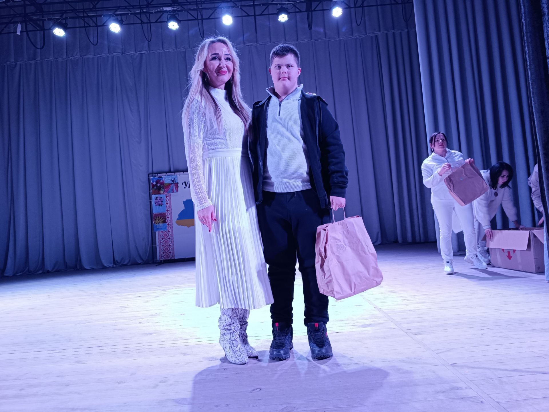 До фойє заходять голова громадської організації «Сонце в тобі» Ірина Шахін та волонтери Олександра Омельчук і Марина Чагіна. За спинами в них білі крила, адже вони в образі янголів. У руках тримають свічки.