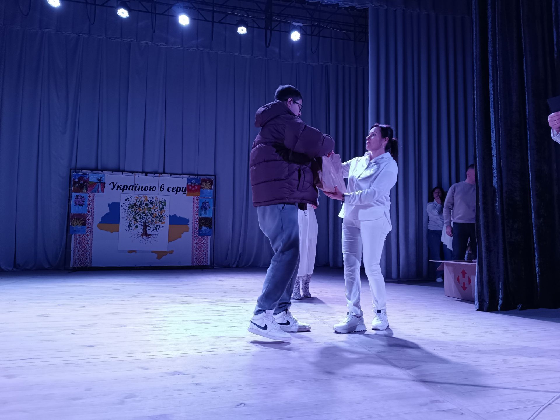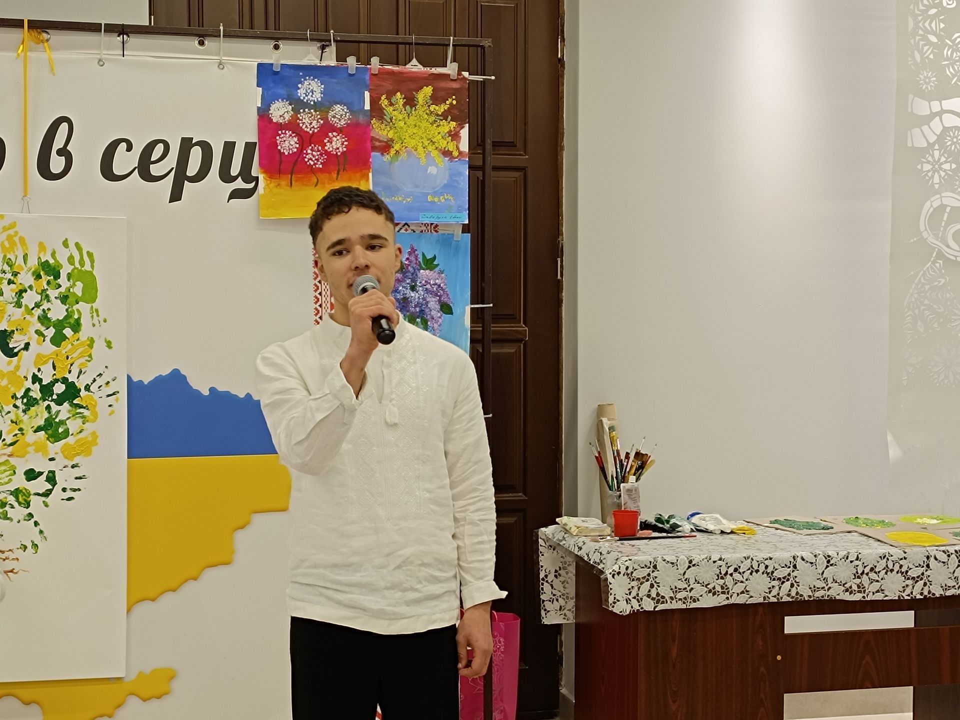 Крона дерева готова, залишилися деталі. Поки Ірина Коротич допрацьовує картину, на імпровізовану сцену запрошують Каріма Шахіна. Юнак співає «Обійми мене» гурту «Океан Ельзи».