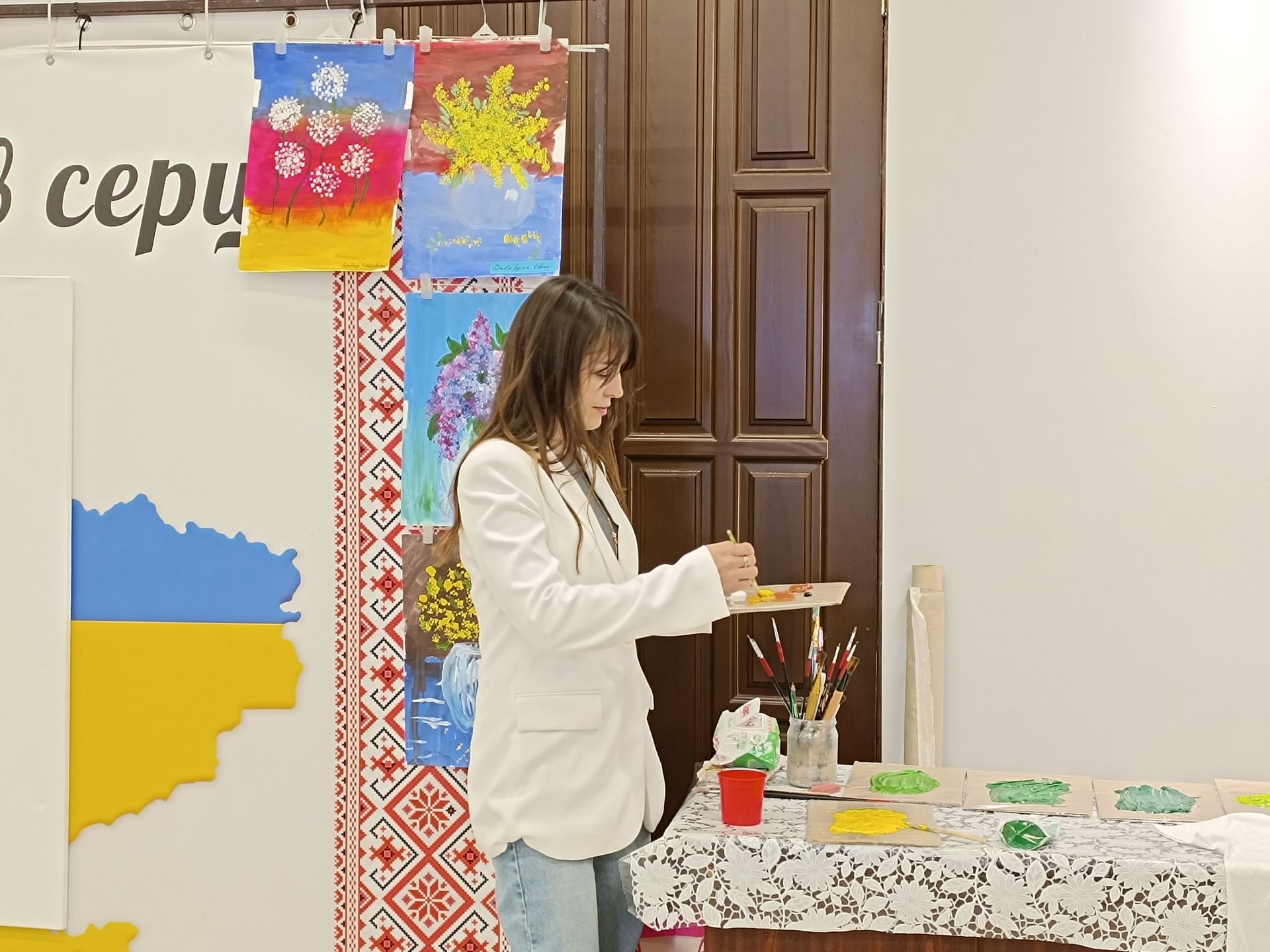 За столиком біля стіни художниця Ірина Коротич готує фарби. Вона із Запоріжжя, та через повномасштабне вторгнення наразі мешкає у Хмельницькому і активно займається волонтерською діяльністю. До нашого міста мисткиня приїхала, аби спільно з дітьми, котрі відвідують простір «Сонце в тобі» створити масштабну картину.
