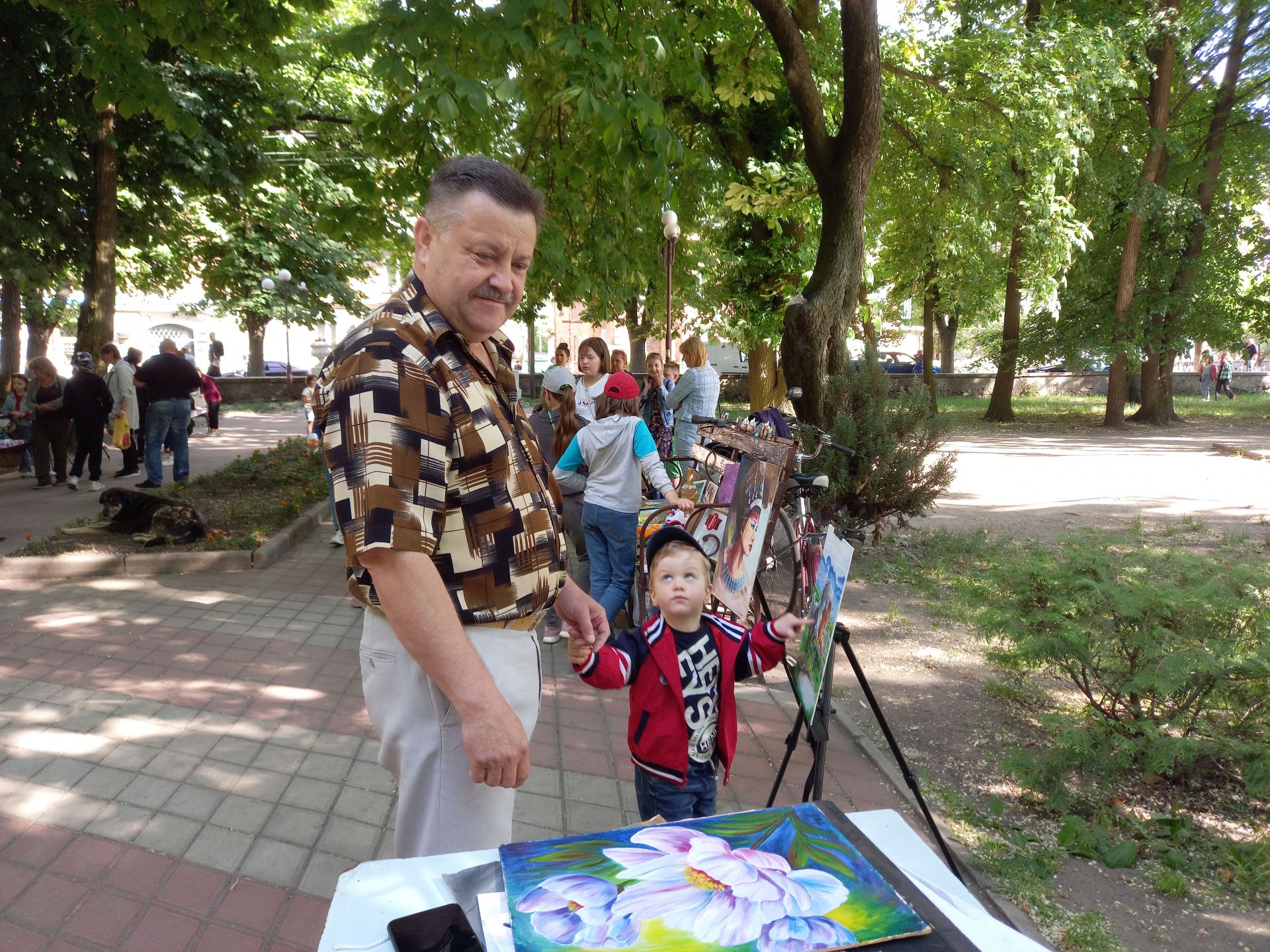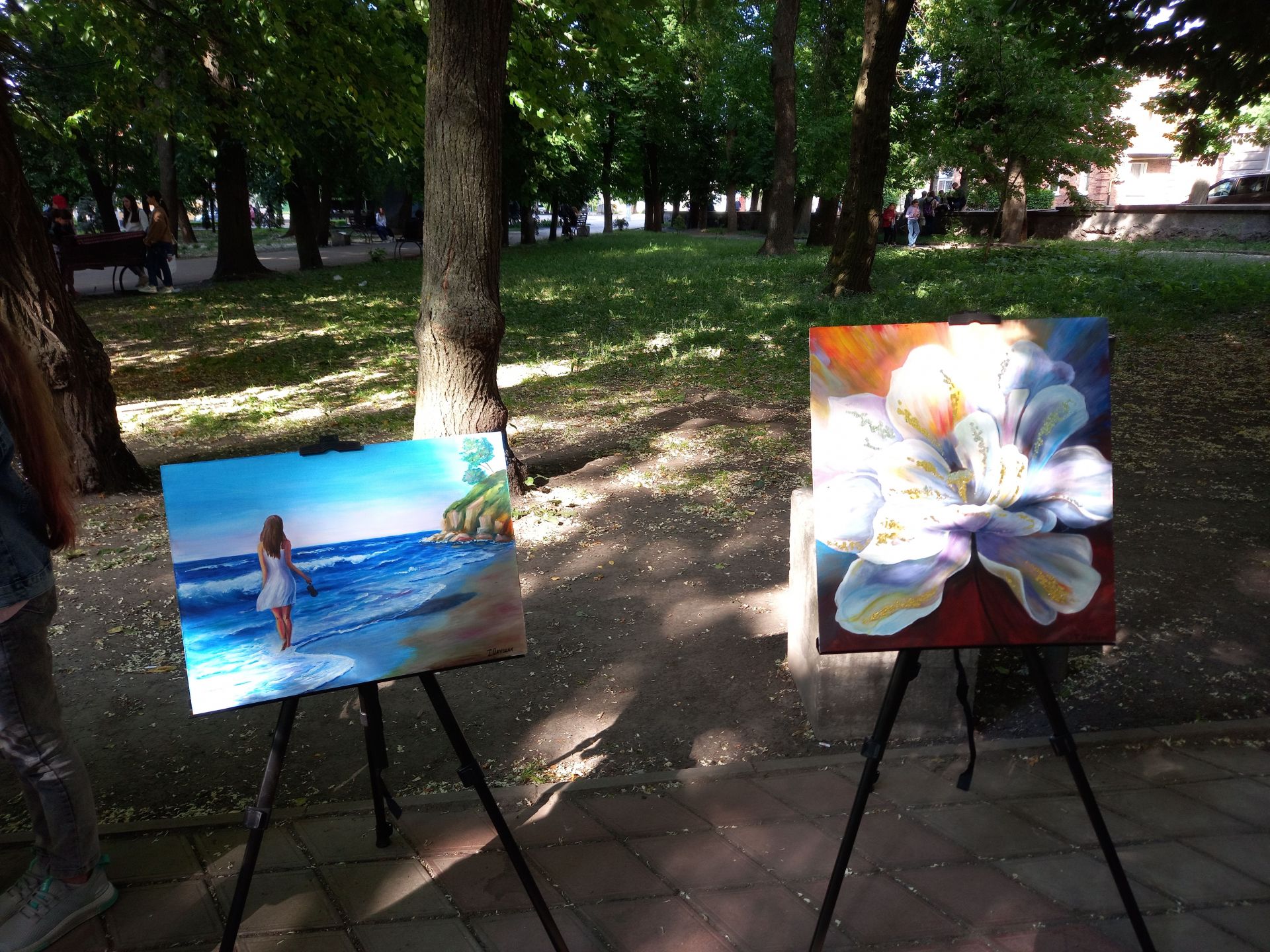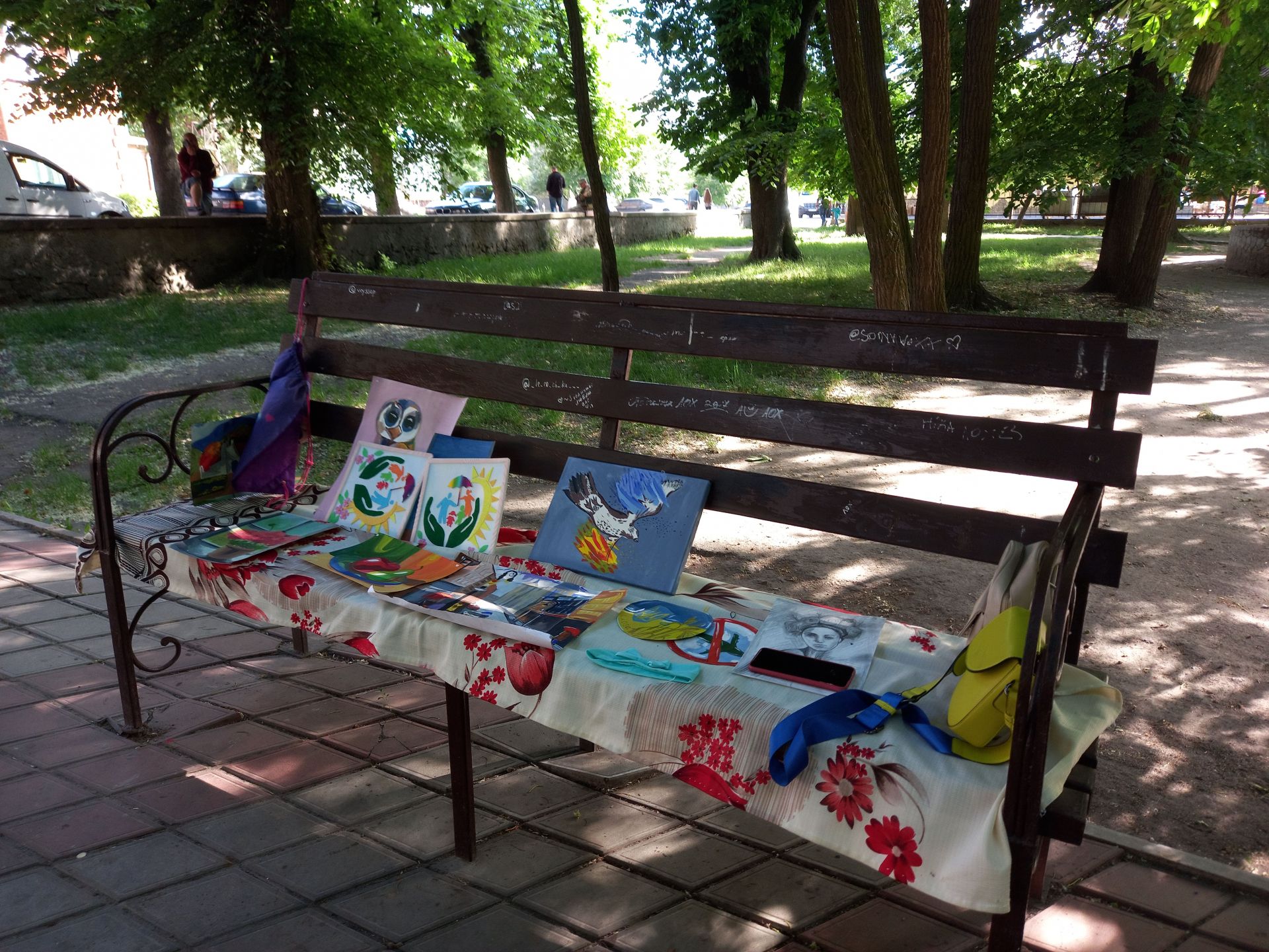 Поруч свої роботи продає художниця Маруся Мельник. Тут і котик, написаний акриловими фарбами, і копія відомого муралу, де дівчинка в українському віночку чавить ногами російські танки. Ціни для своїх картин Маруся не ставила. Каже, хто скільки дасть, за стільки і продасть.
