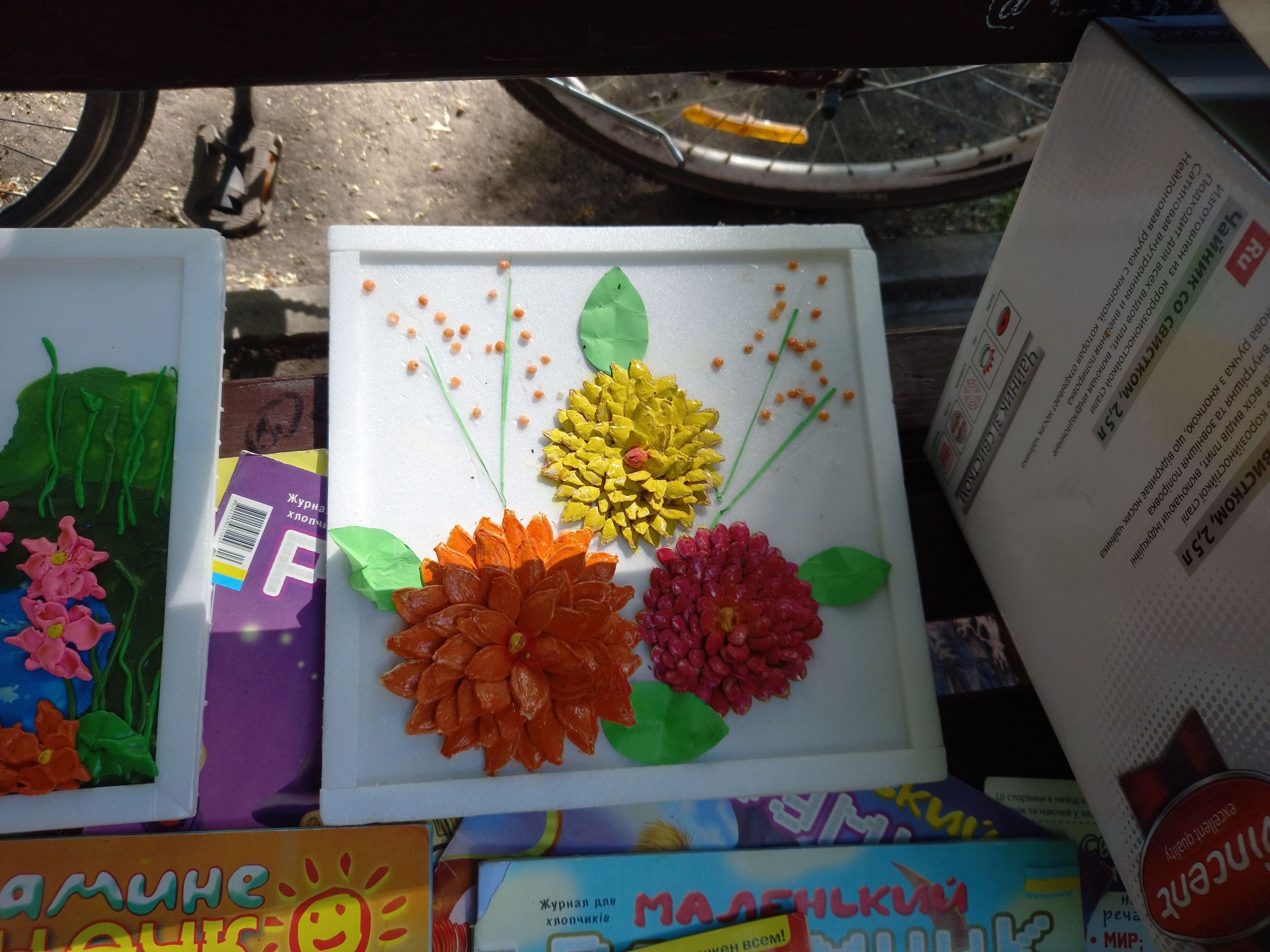 На локації поруч свої роботи представляє Ніна. Дівчинка відвідує гурток «Барви» у Центрі дитячої та юнацької творчості, де робить картини з пластиліну, насіння та яєчної шкаралупи. Всі продає за 20 гривень. На одній із робіт зображений пейзаж — дерево і водоспад. Мозаїчна картина зроблена зі звичайної шкарлупи від курячого яйця.