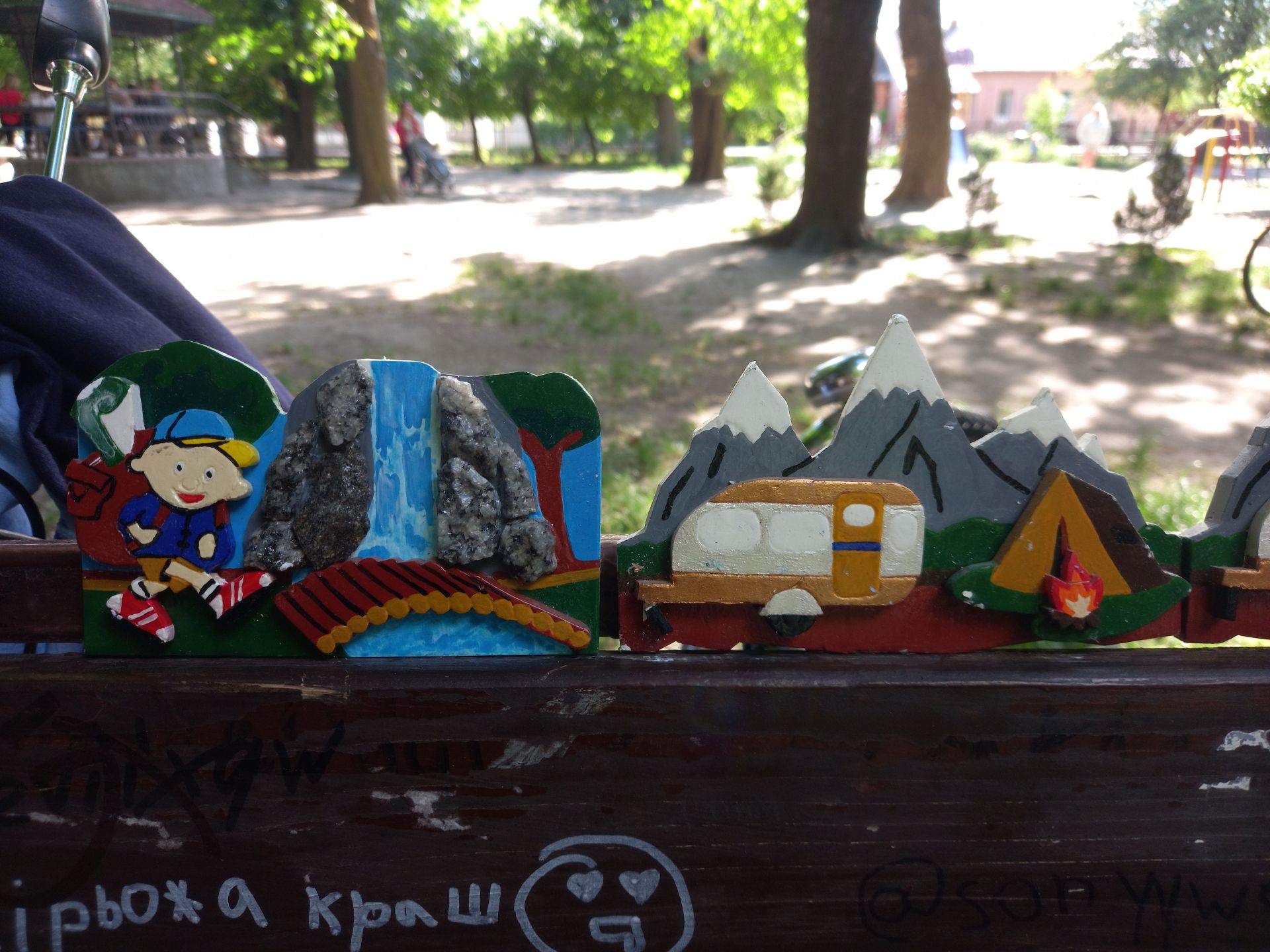Аня продає магніти ручної роботи, які виготовила разом з татом Борисом. Частина з них патріотичні — тут тризуб із жовто-блакитним стягом. Це татова ідея. Частина на тематику подорожей. Це вже ідея Ані.