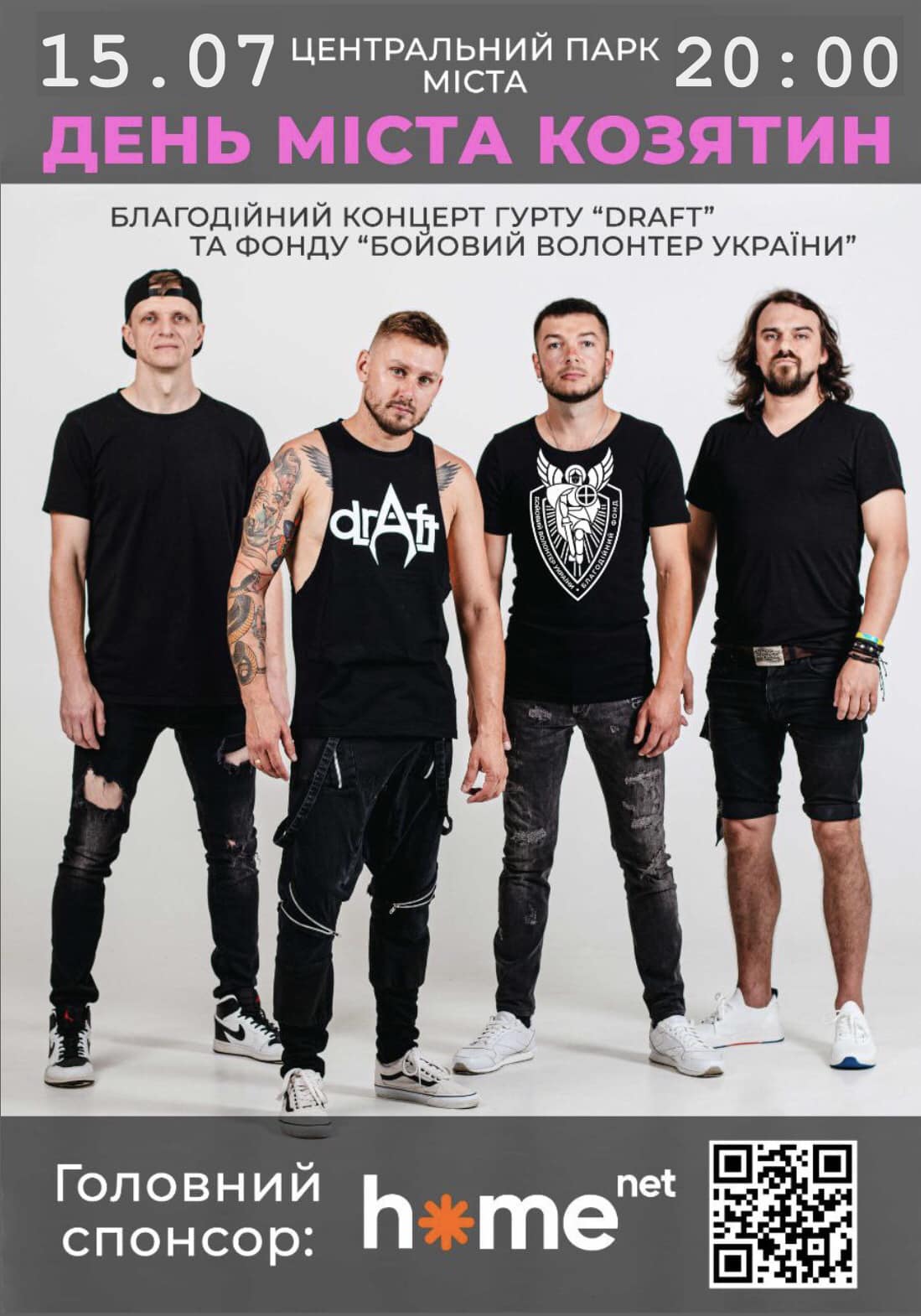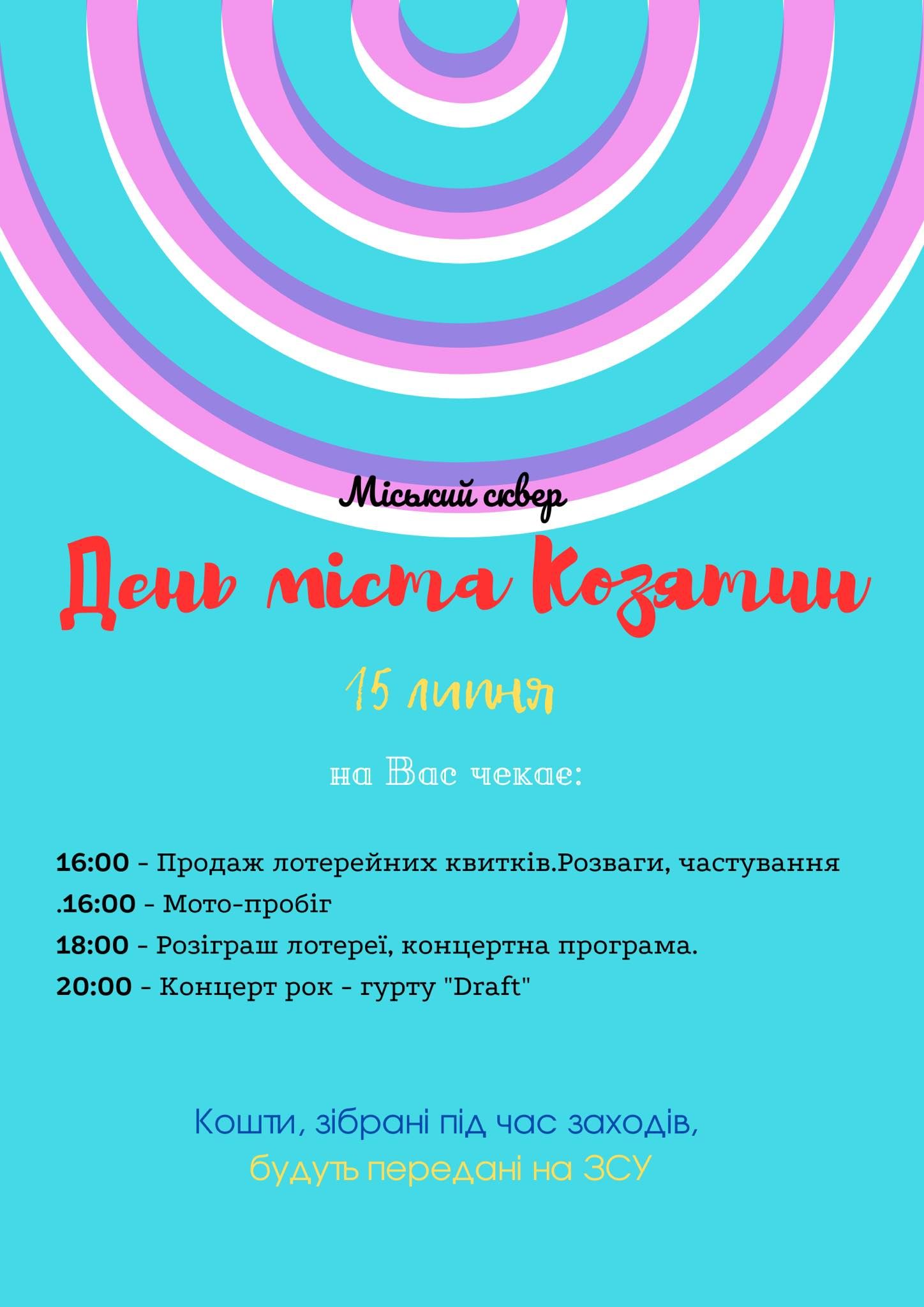 Як інформує «Культура Козятинської громади», благодійна лотерея, мото- пробіг, виступ місцевих артистів, програма гурту «Draft» перенесли на цю суботу, 15 липня