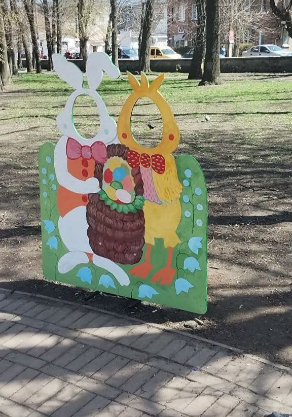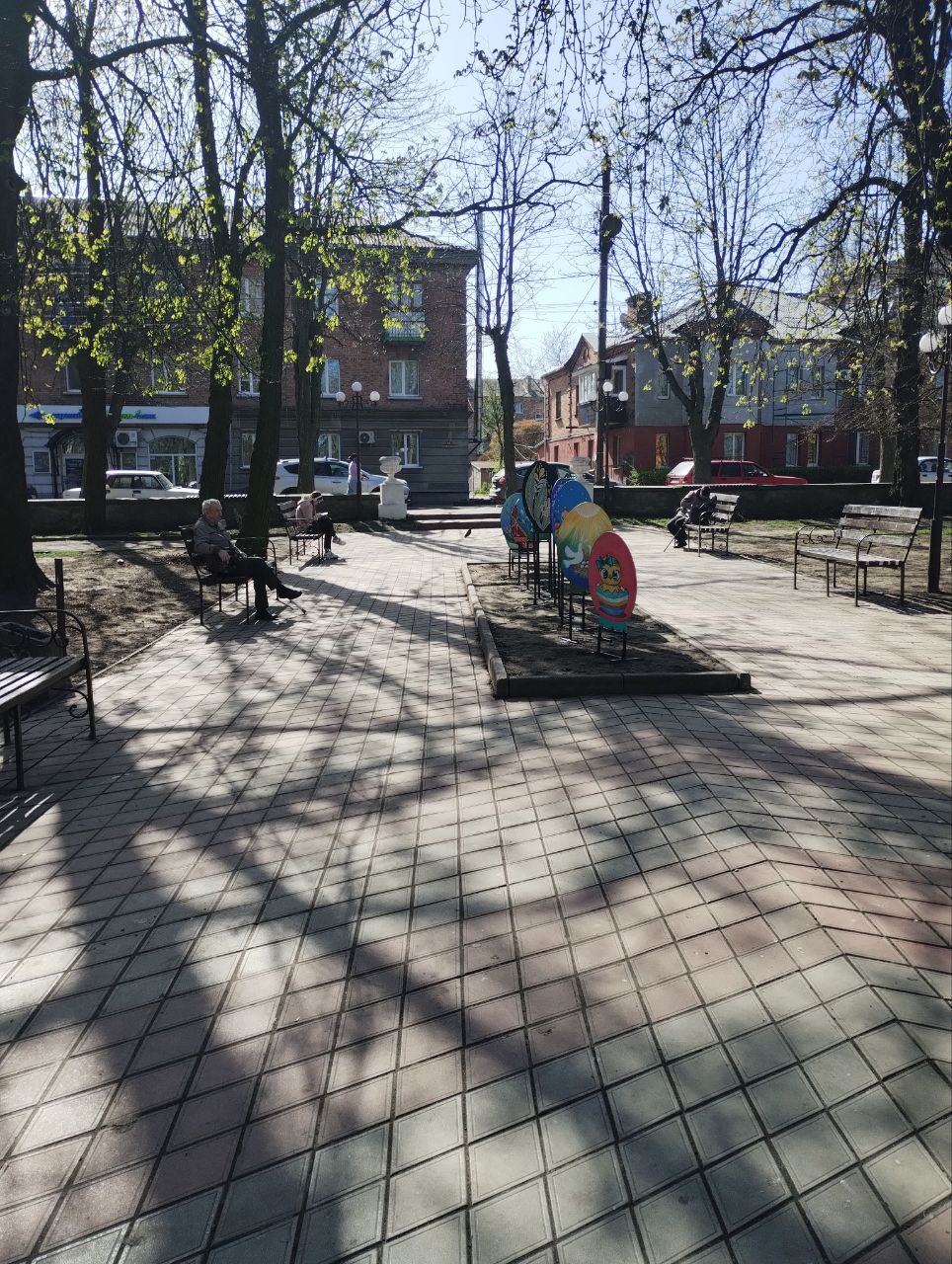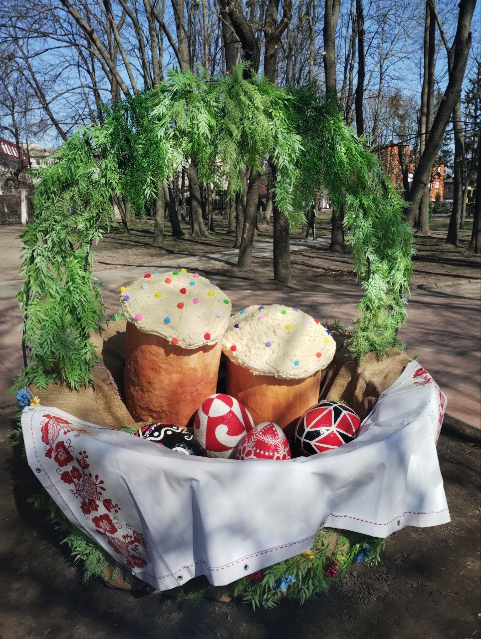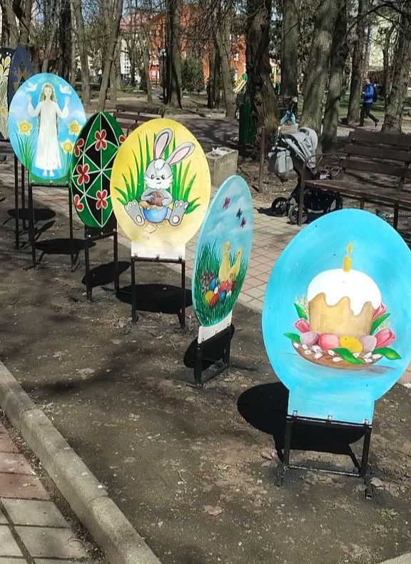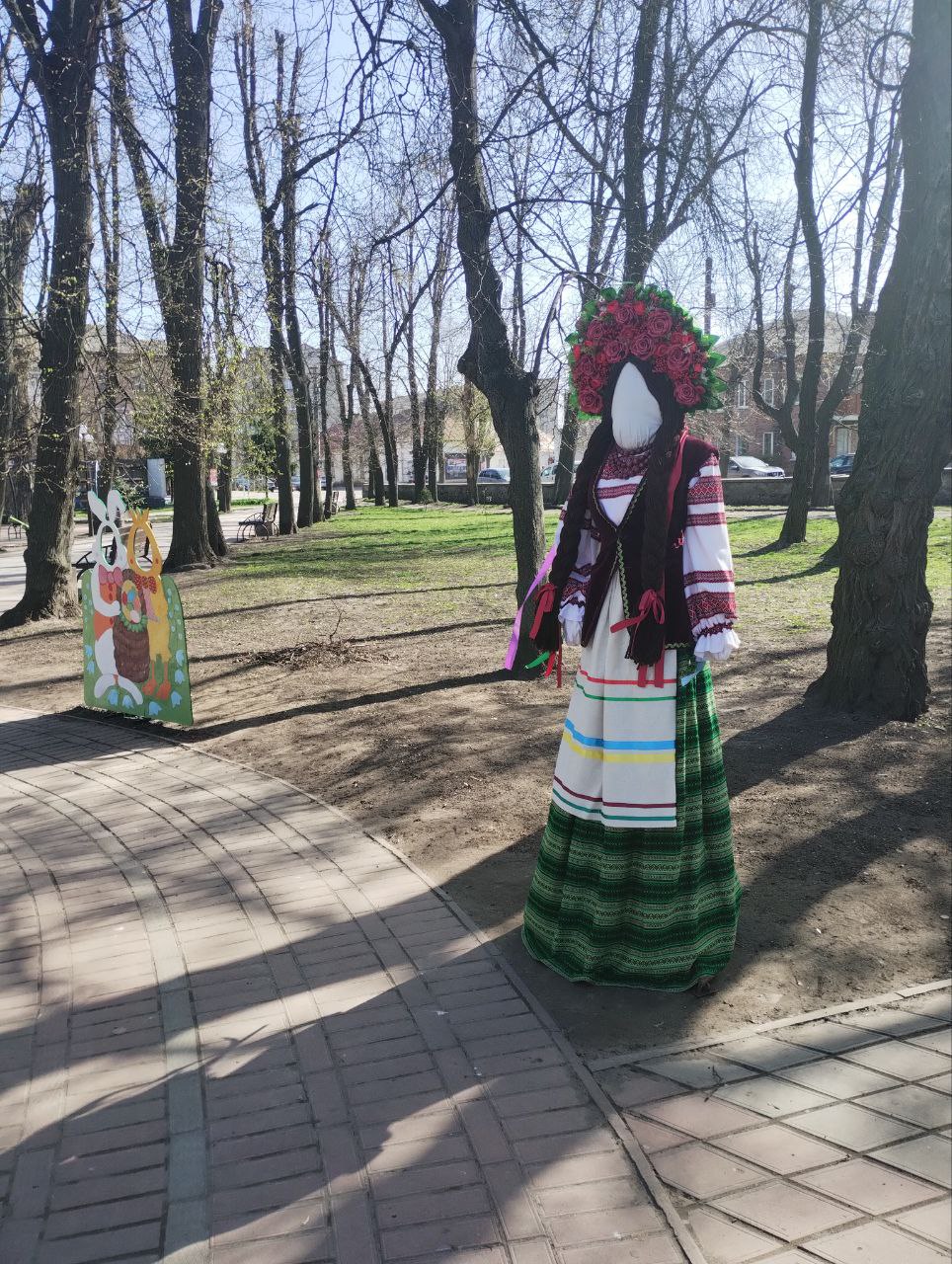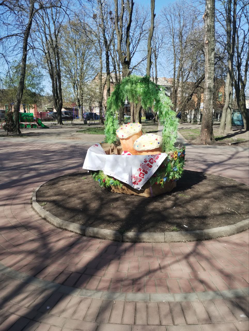 У Передвеликодній тиждень у Козятинському парку кипіла робота. Тут встановлювали святкові, інсталяції. На клумбі перед центральним входом у парк поставили розфарбовані писанки, які у свій час прикрашали центральну площу міста. Також, ближче до центру парку стоїть арт-інсталяція — двометрова ростова мотанка. Її козятинчани теж бачили рік тому на площі.