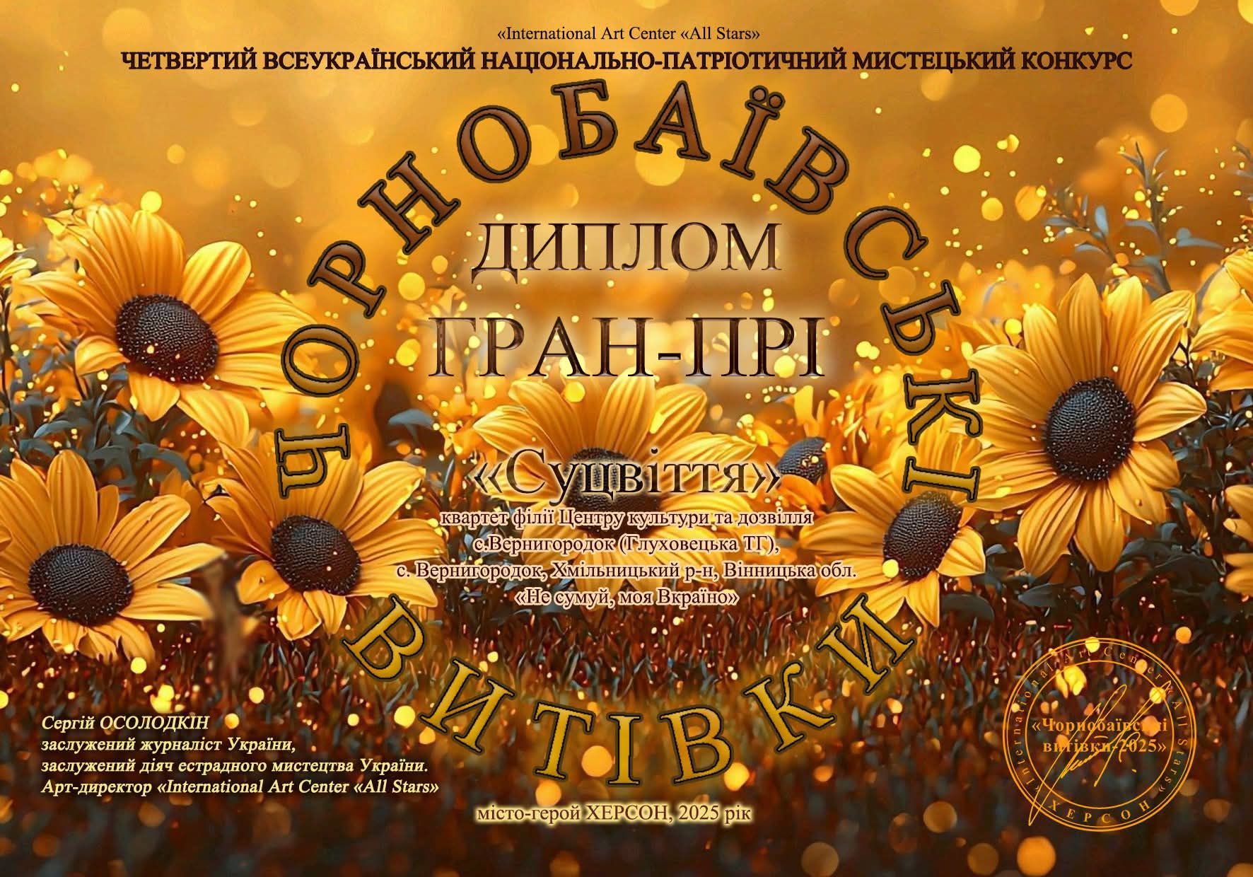 За підсумками конкурсу, вокальний гурт «Суцвіття» філії Центру культури та дозвілля с. Вернигородок Глуховецької селищної ради отримав Гран-прі конкурсу з піснею «Не сумуй, моя Вкраїно»