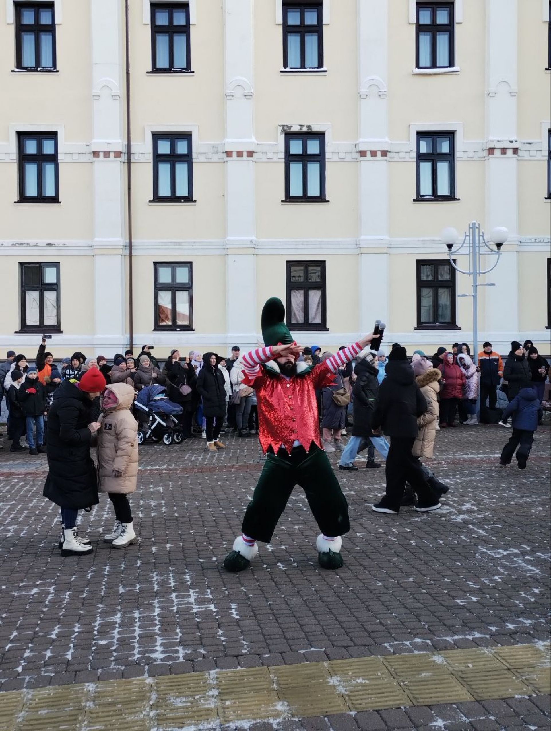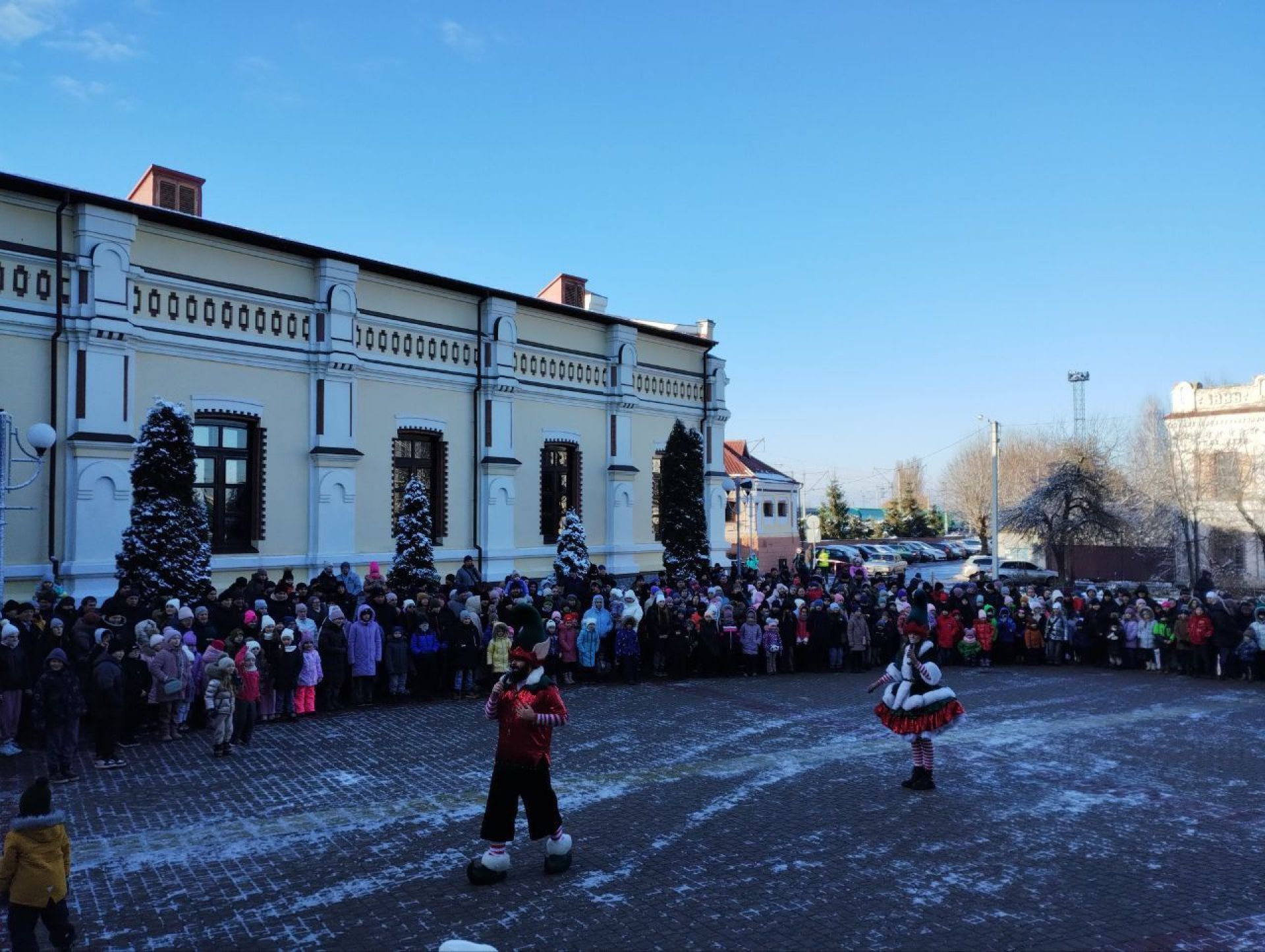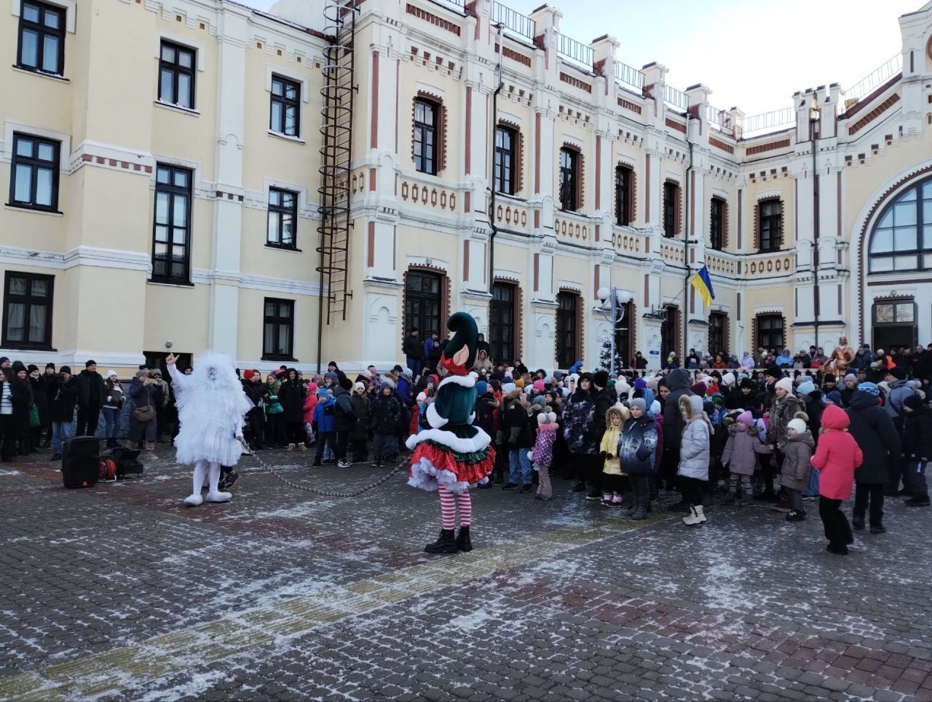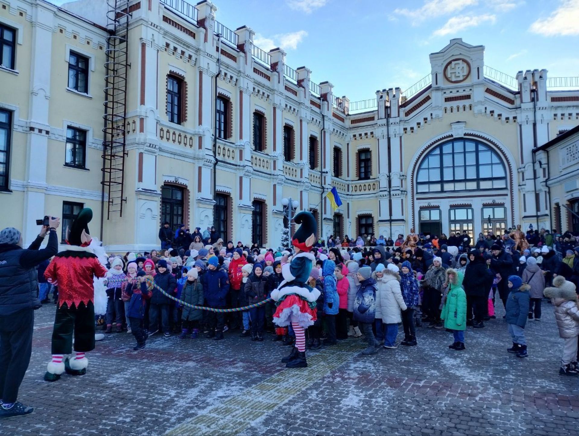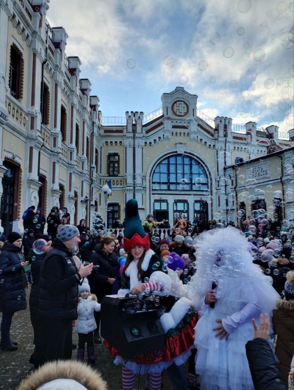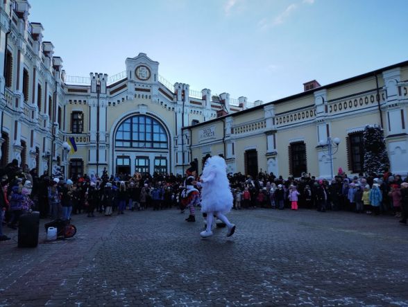Перейдемо до свята. Після того, як поїзд-кухня прибув на наш вокзал, діти разом з батьками перейшла на привокзальну площі. Тут створили коло і чекали на казку. Розважати малечу взялися казкові аніматори — Ельфи і Сніжок. Вони жартували, танцювали, влаштовували флеш-моби, бульбашкове шоу. Робили все для того, аби розігріти юних глядачів, адже у той день було прохолодно — напередодні притрусив сніг і взяв невеличкий морозець. Але це аж ніяк незавадило, а навпаки тільки додало святкового настрою.