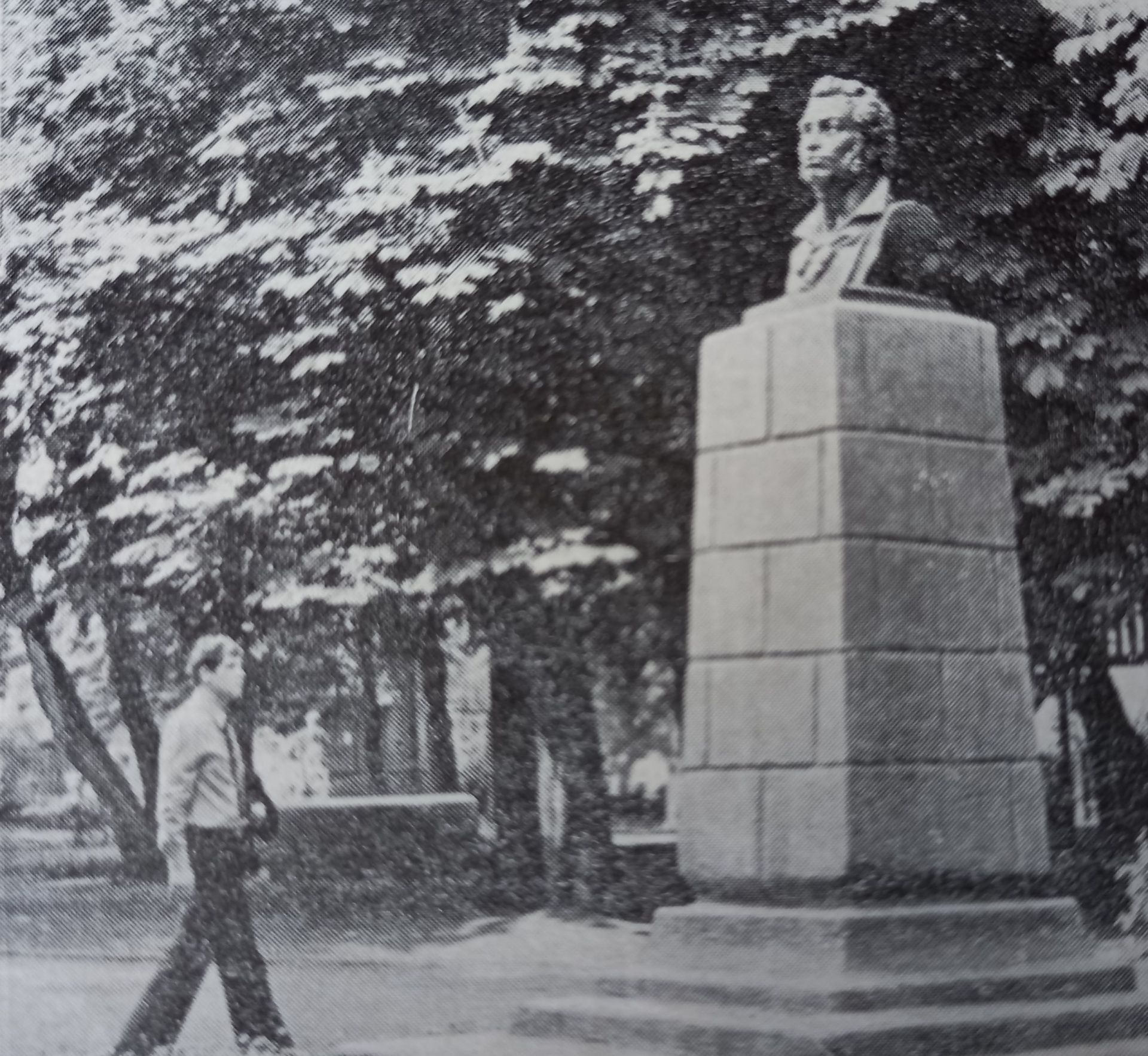 Так у 1979 році виглядав міський сквер. У центральній частині парку височів гіпсовий бюст Пушкіна, який козятинчани добре пам’ятають. Його встановили ймовірно у 50-их роках минулого століття (точну дату нам з’ясувати не вдалося). Пам’ятник простояв у парку до наших часів — у 2018-му голову Пушкіна знесли мешканці Козятина. Бетонний постамент, обкладений гранітними дошками, залишався у сквері аж до минулого року, його демонтували напередодні Дня міста, щоб облаштувати на центральній алеї парку сцену для концерту