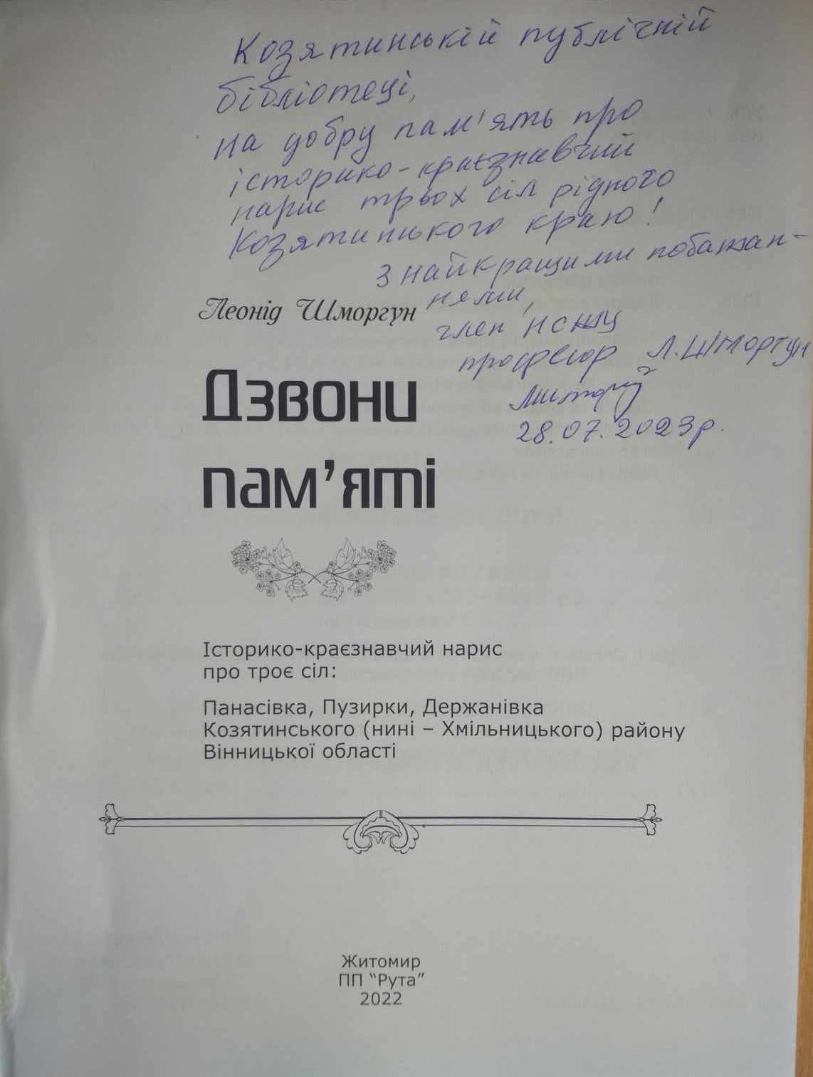 - Козятинська публічна бібліотека отримала у подарунок від земляка Леоніда Григоровича Шморгуна книгу «Дзвони пам’яті».