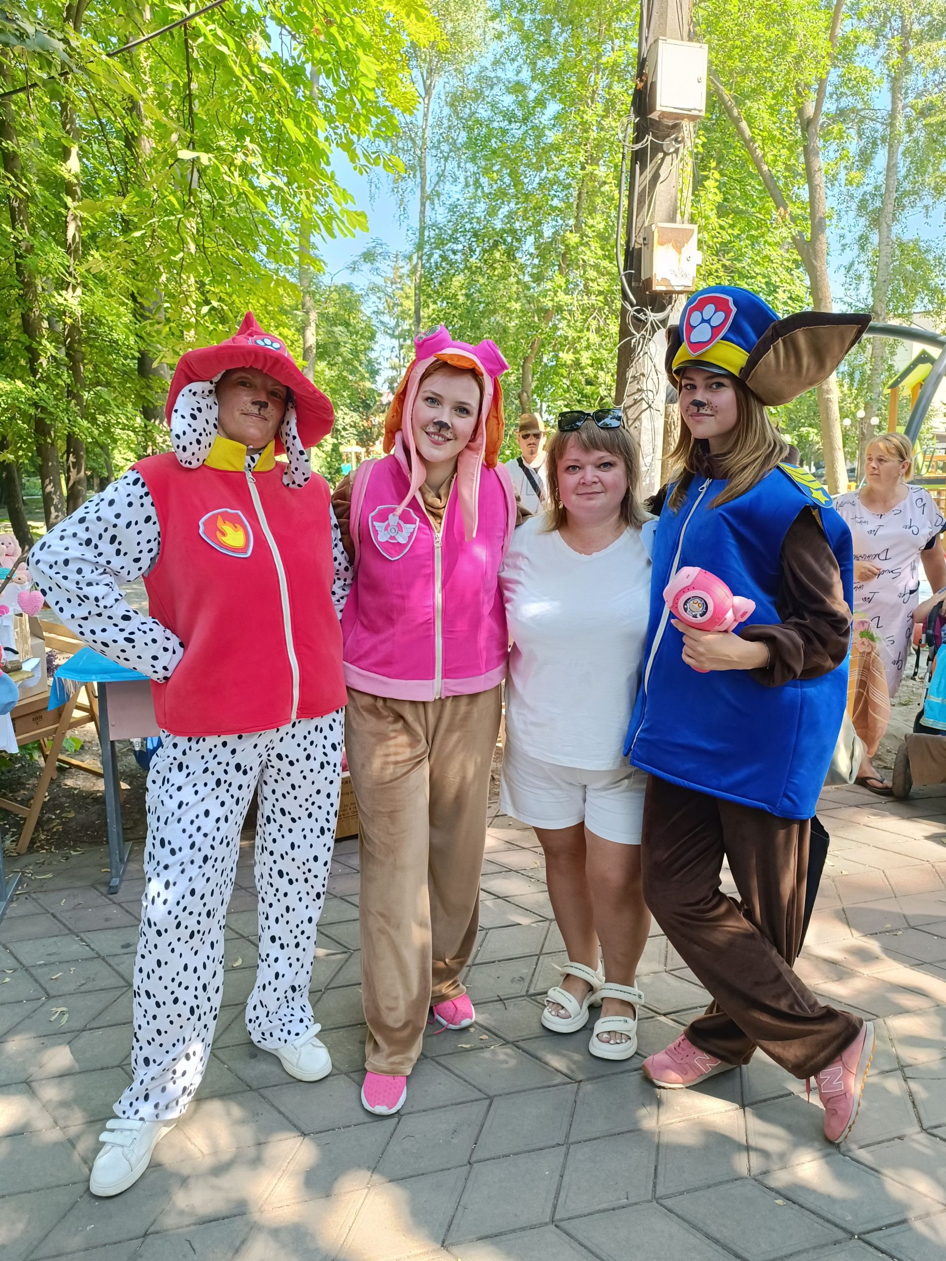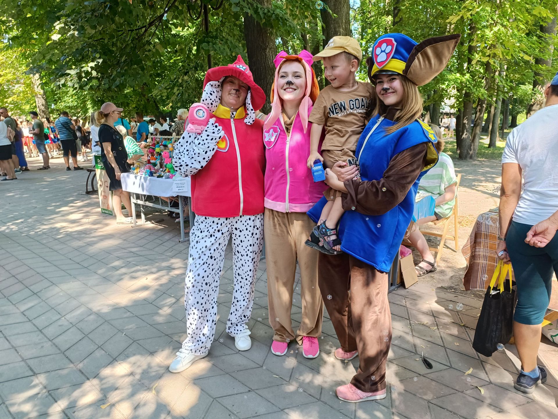 На алею скверу заходять дівчата в костюмах героїв популярного мультфільму «Щенячий патруль». Хлопці з дівчатами поспішають зробити з ними фотографії. Тим часом на імпровізованій сцені проводять конкурс для наймолодших. Завдання учасників — нагодувати гусінь іграшковими фруктами та овочами.