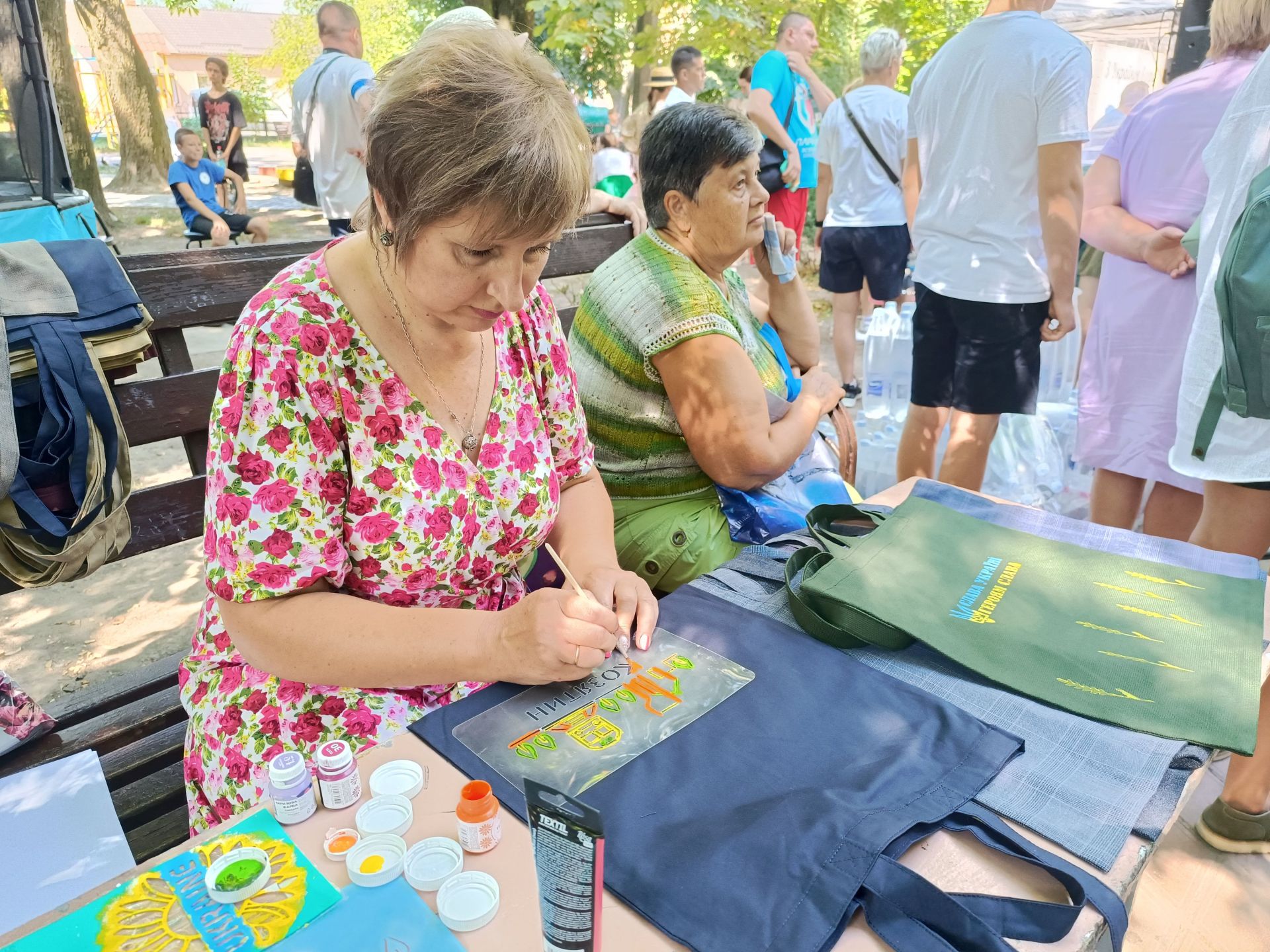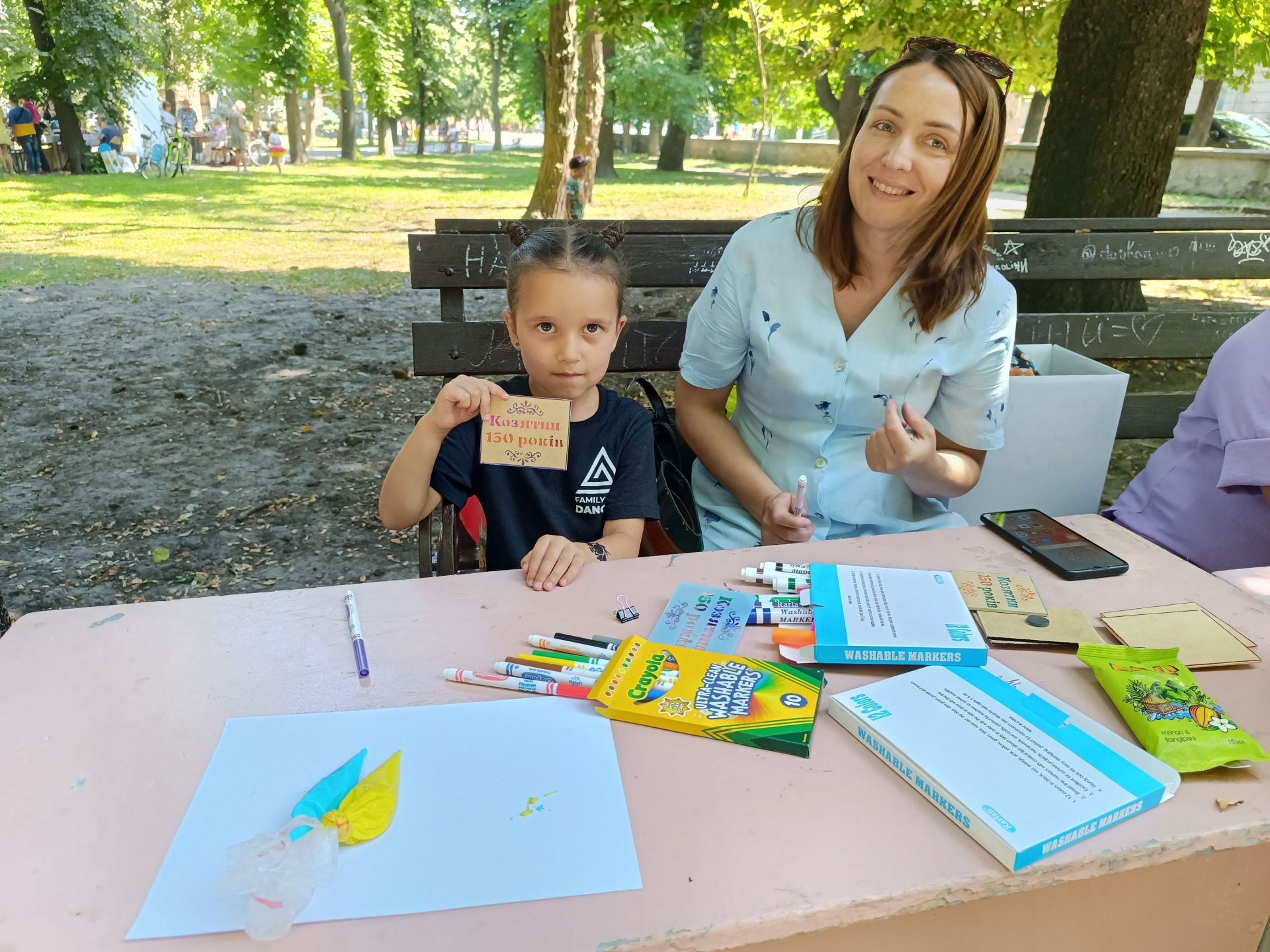 Центр дитячої та юнацької творчості проводить декілька майстер-класів одночасно. На одному діти виготовляють магніт «Козятину 150 років». На іншому розписують спеціальними фарбами екоторбинку. По інший бік алеї Олена Чупрова, волонтерка простору «Добрий Козятин» показує дітям, як виготовити прикрасу-сердечко.