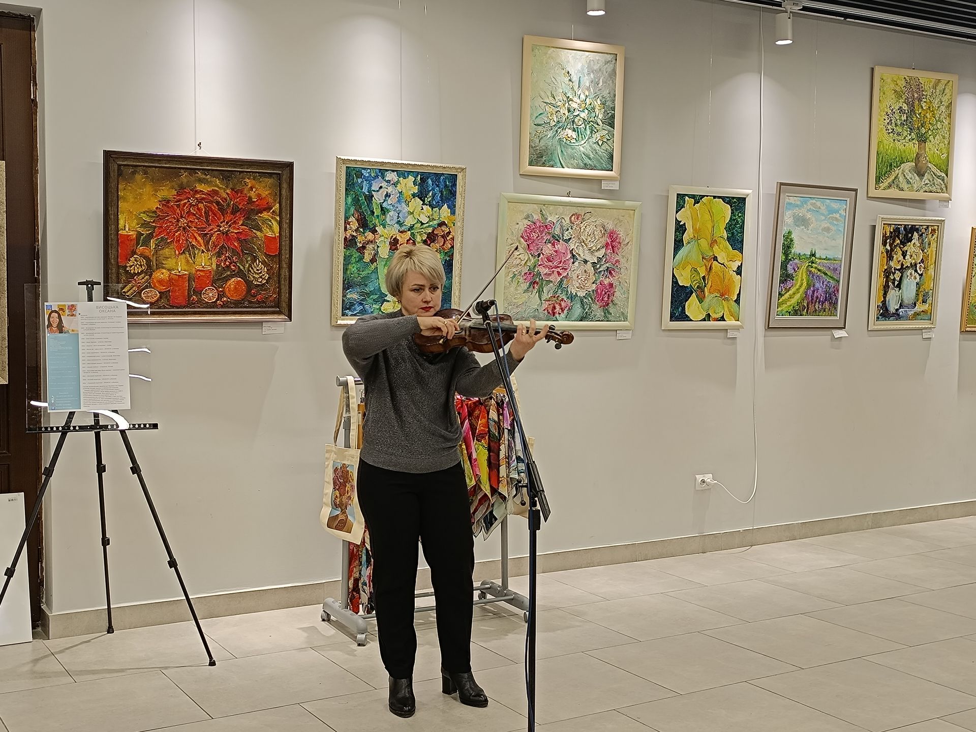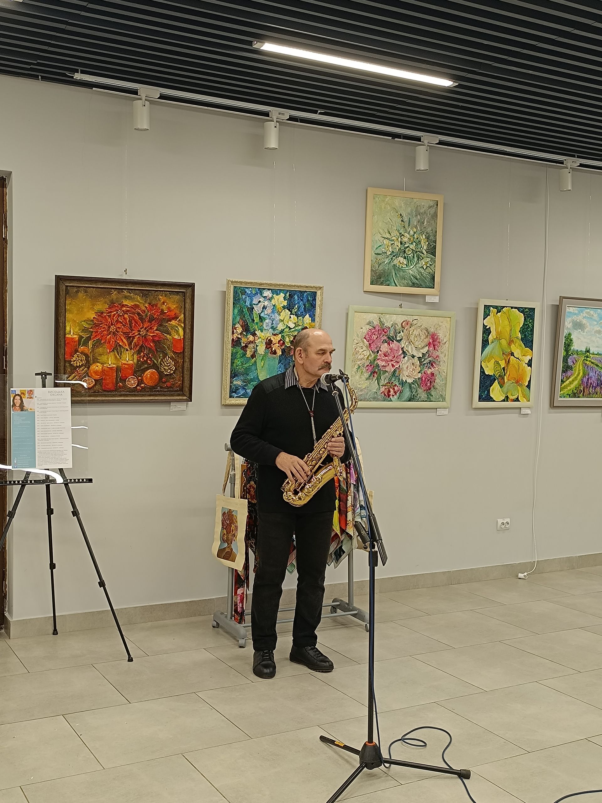 Привітала художницю із відкриттям виставки виконуюча обов’язки міського голови, секретар Козятинської міської ради Ірина Репало. Федір Бережнюк зіграв на саксофоні.