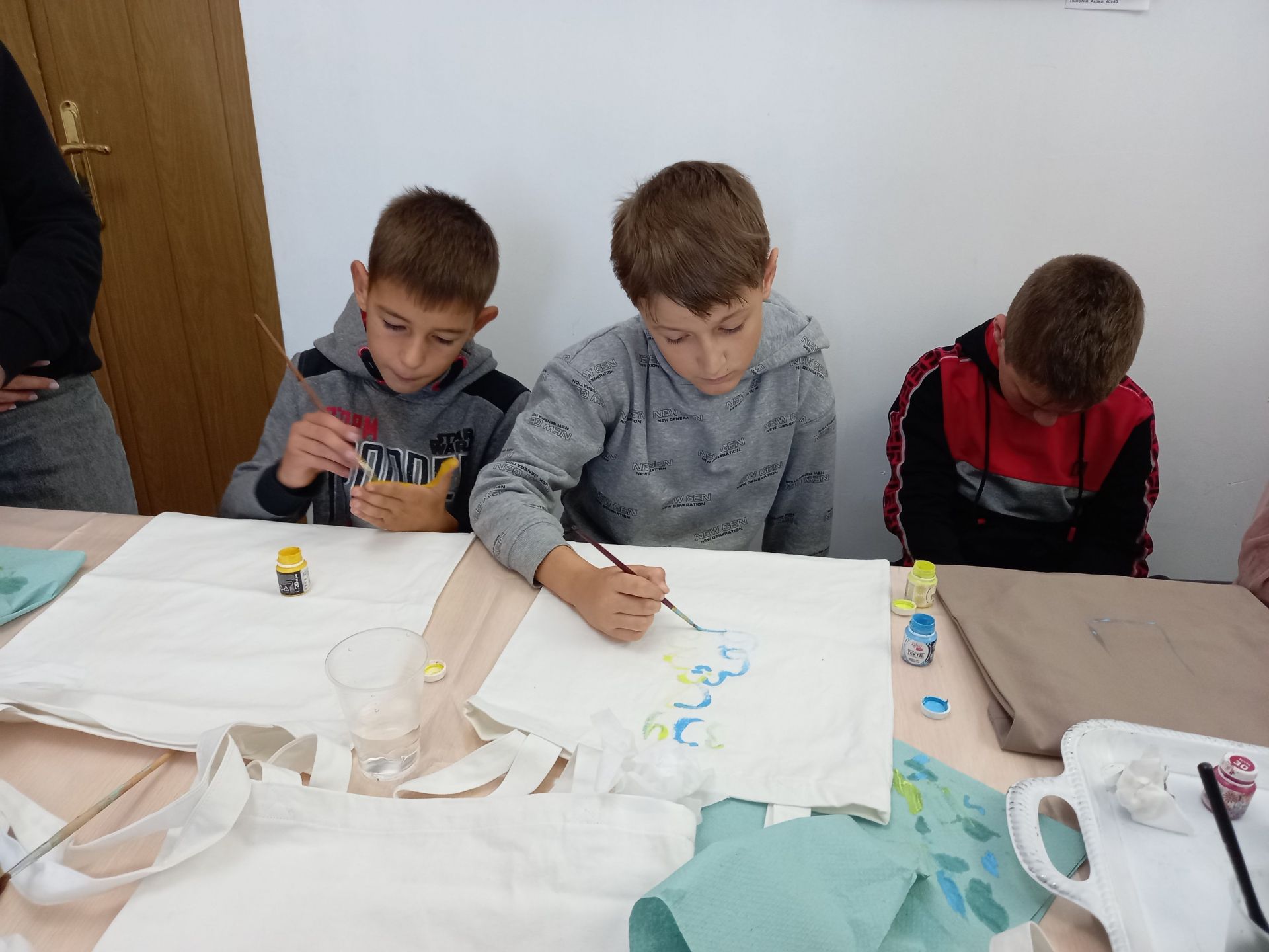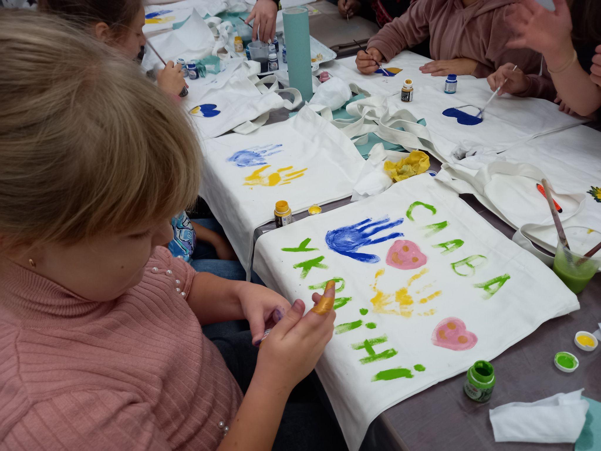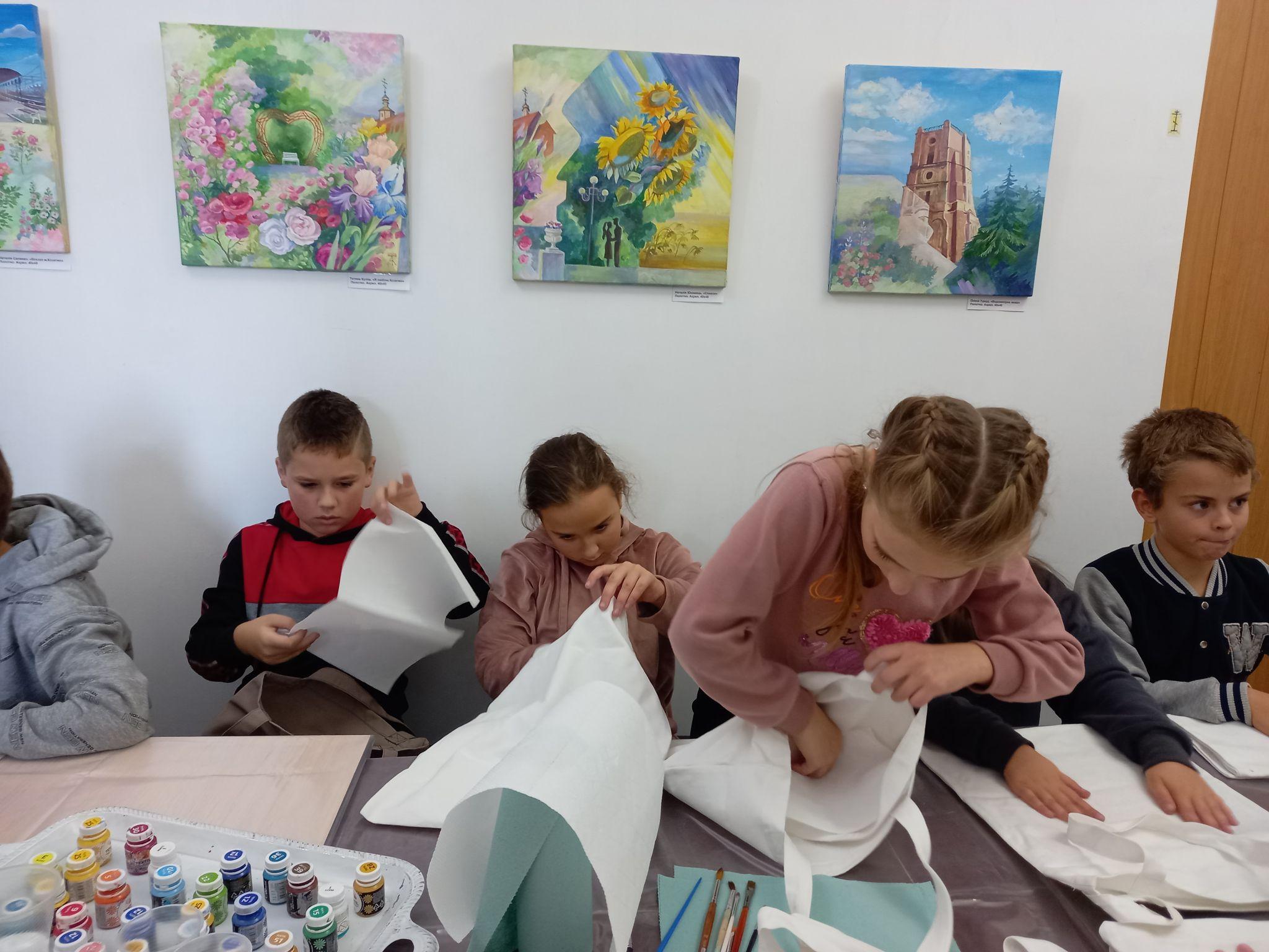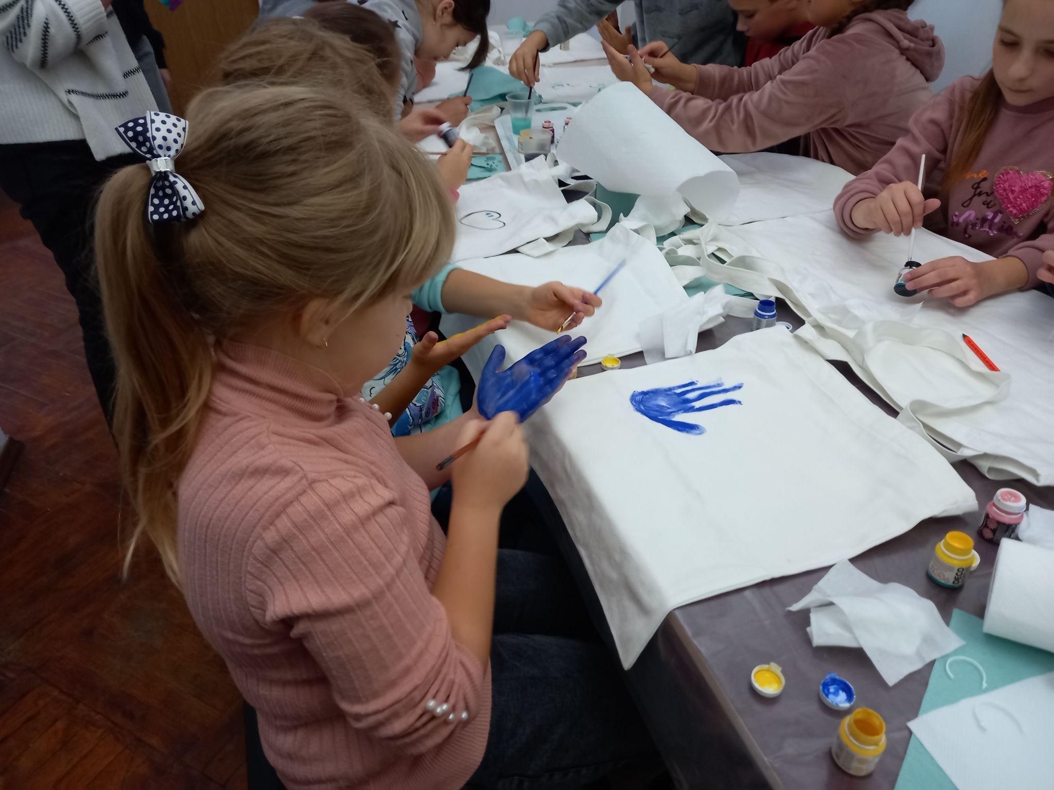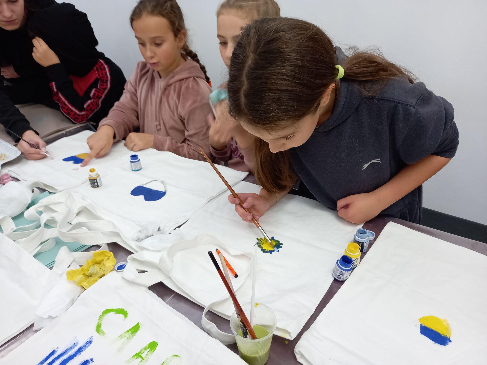 На столі лежить стос шоперів. За годину вони замайорять яскравими барвами. Та спершу на наших юних художників чекає кропітка робота. Діти розбирають торбинки. Одну залишають для Міші. Він не зміг долучитися до майстер-класу, тому діти вирішили разом для нього розписати шопер. Та спершу кожен працює над своїм.