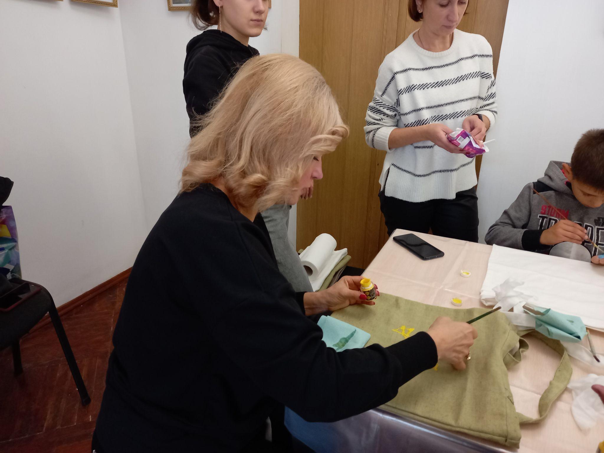 — Сьогодні ми зібралися не просто так, а з дуже класною благодійною метою, — каже майстриня Наталія Баштова. — Ми розмалюємо торбинки і допоможемо ЗСУ. Тим, хто обороняє нас, хто дозволяє нам спати спокійно, хто своїми серцями захищає нас. Теплота ваших сердець, коли ви малюватимете, мріятимете, допоможе нашим хлопцям. Ми розмалюємо торбинки у патріотичній тематиці. Обмежень не буде, але є певні обмеження у використанні фарби — якнайменше мочити пензлик.