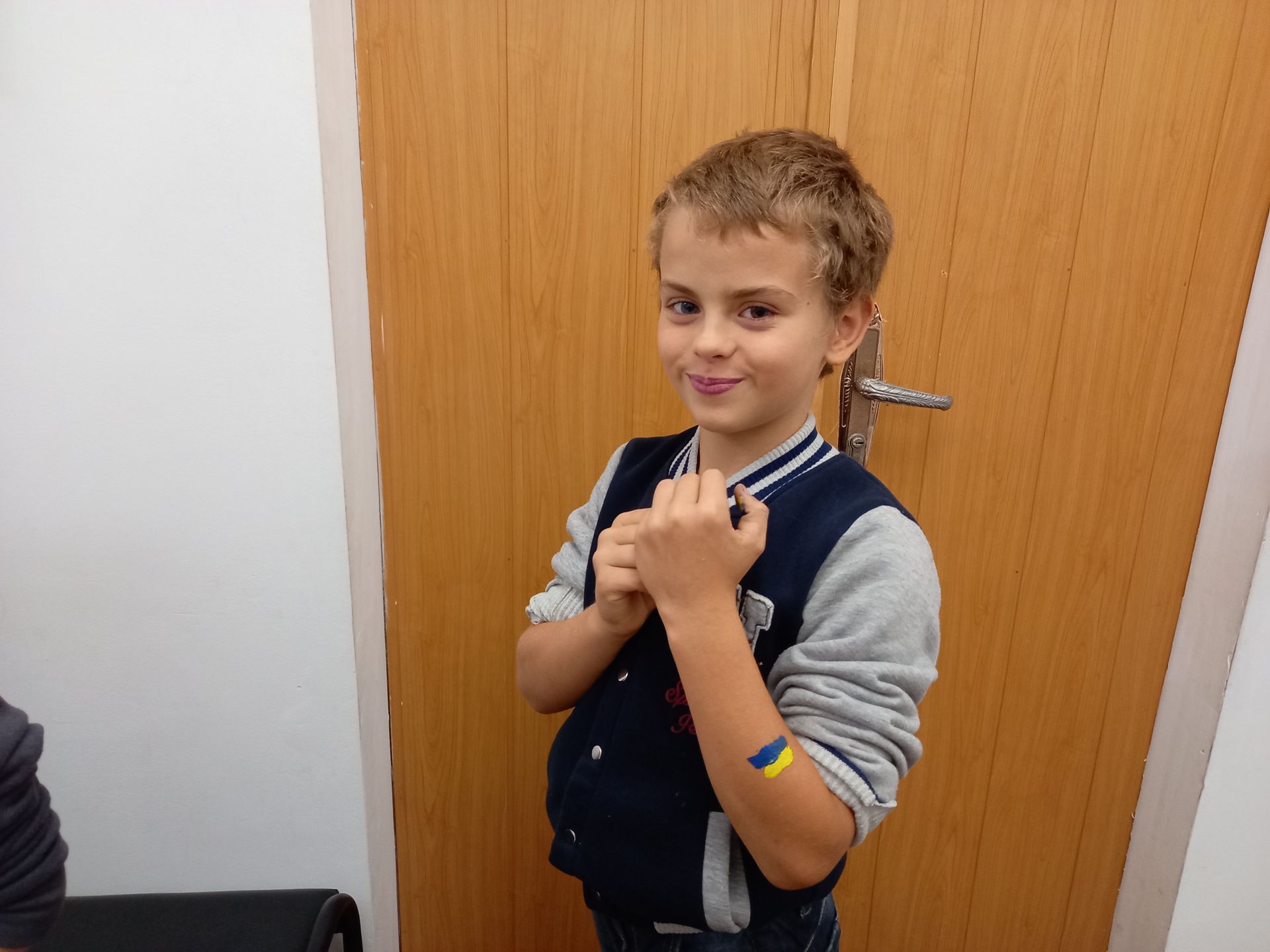 По той бік столу Славік встиг зробити малюнок не лише на торбинці. На шопері хлопчик зобразив сердечко і прапор України, а на руці намалював невеликий жовто-блакитний стяг.