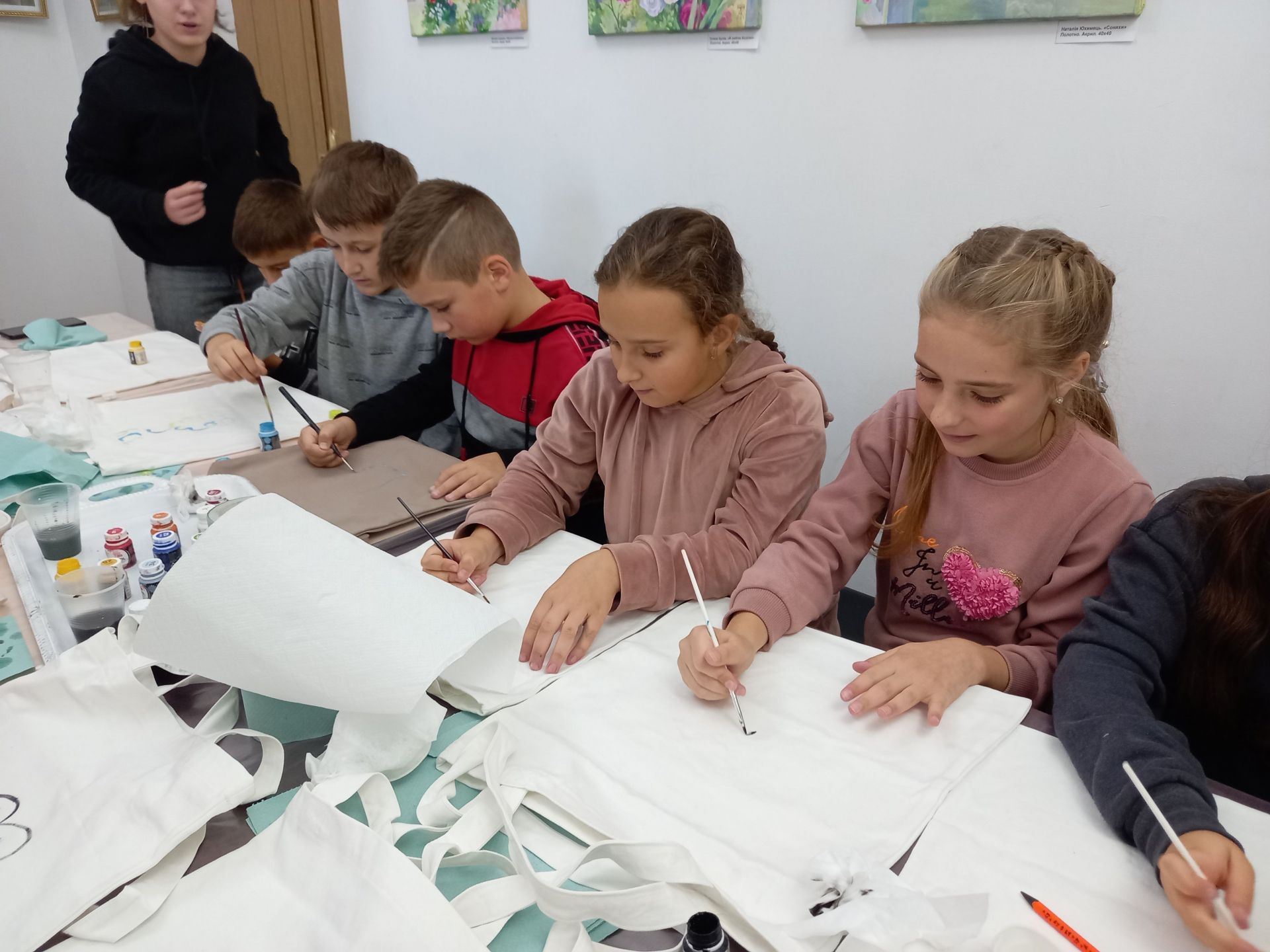 Кожен бере собі пензель і починає міркувати над дизайном шопера. Поки діти мудрують над тим, що малювати, майстриня показує свою еко-сумку, яку вона розписала власноруч. На ній зображена лялька-мотанка.