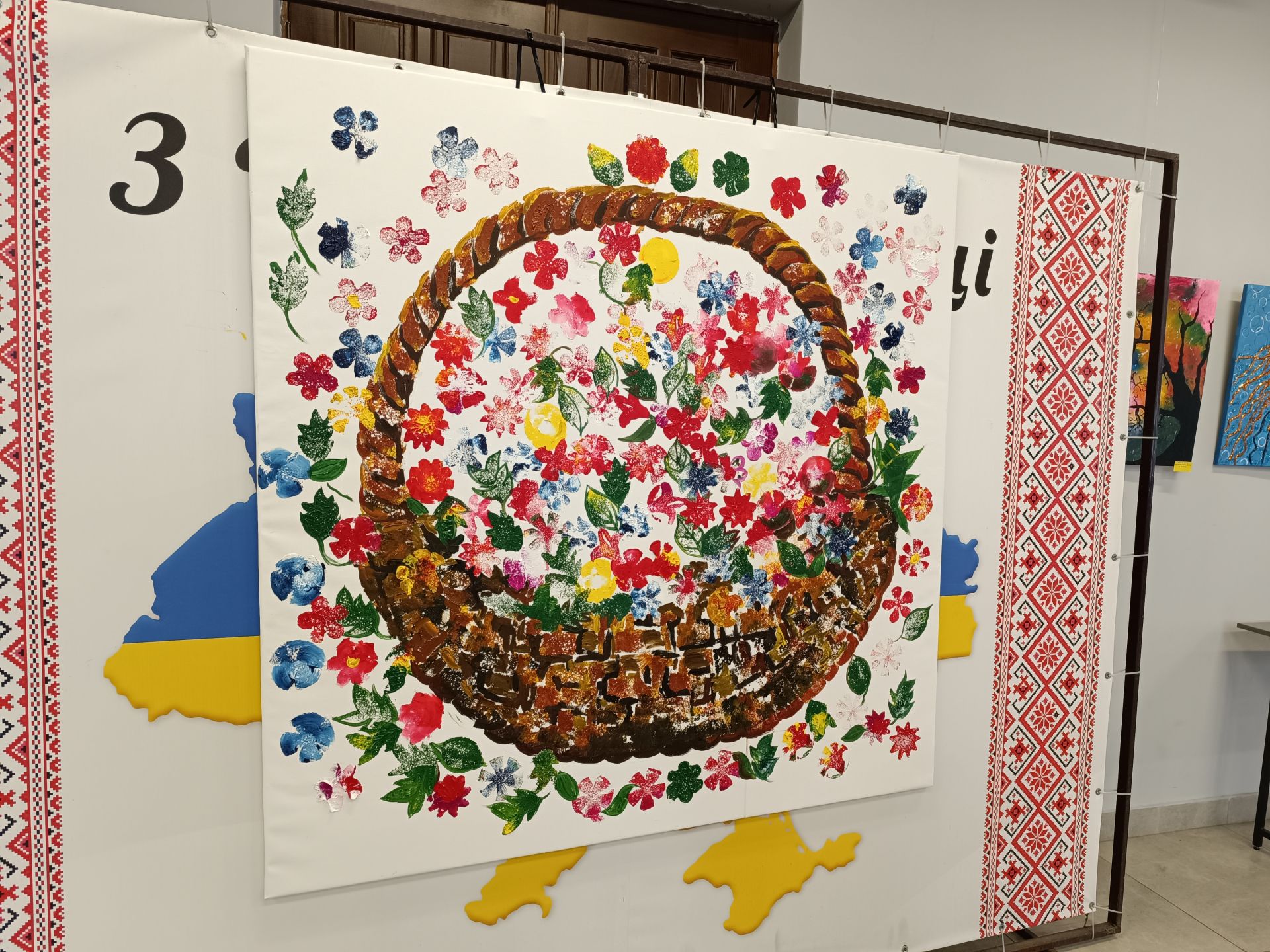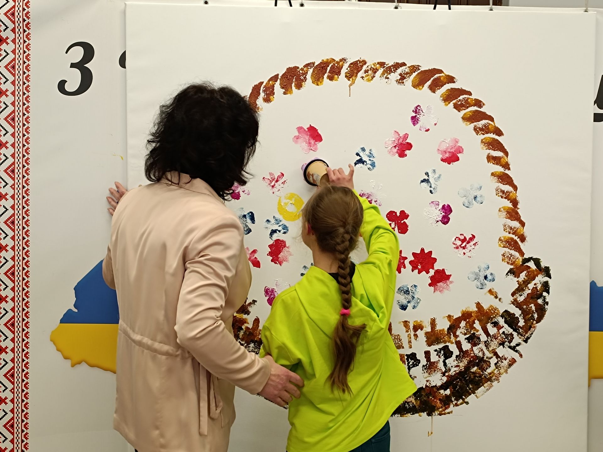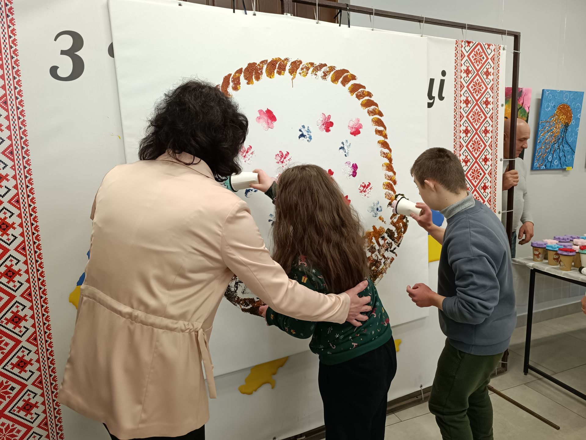 За декілька хвилин на полотні з’явилися обриси кошика. Усіх учасників проєкту запросили долучитися до створення спільної картини. Кожен хлопчик та дівчинка зобразили на полотні квітку. Аби полегшити завдання, заздалегідь підготували спеціальні штампи, за допомогою яких ставили на полотні відтиски. Долучилися не лише діти, а й дорослі. Художниці додали декілька штрихів і картина замайоріла барвистими весняними квітами.
