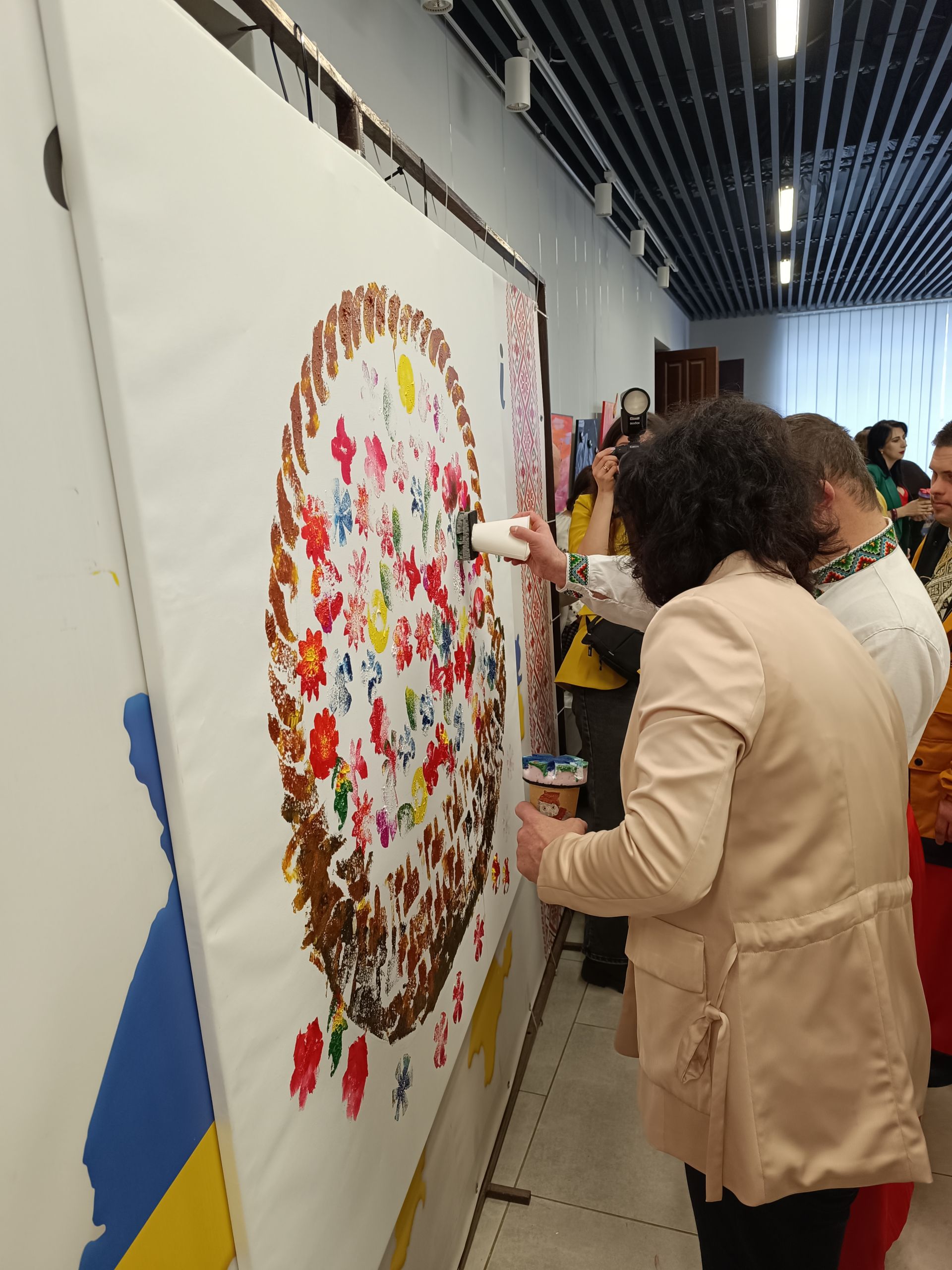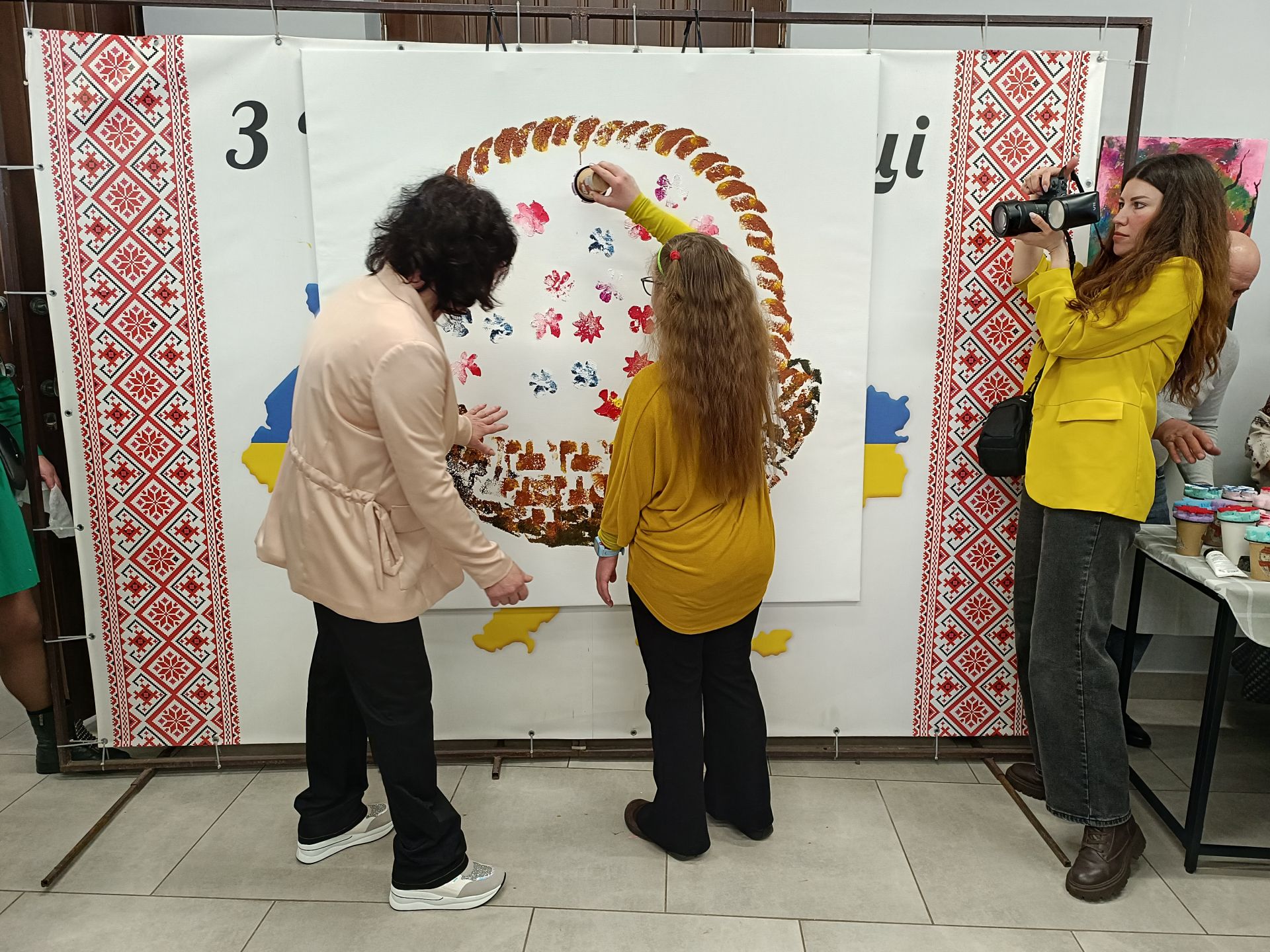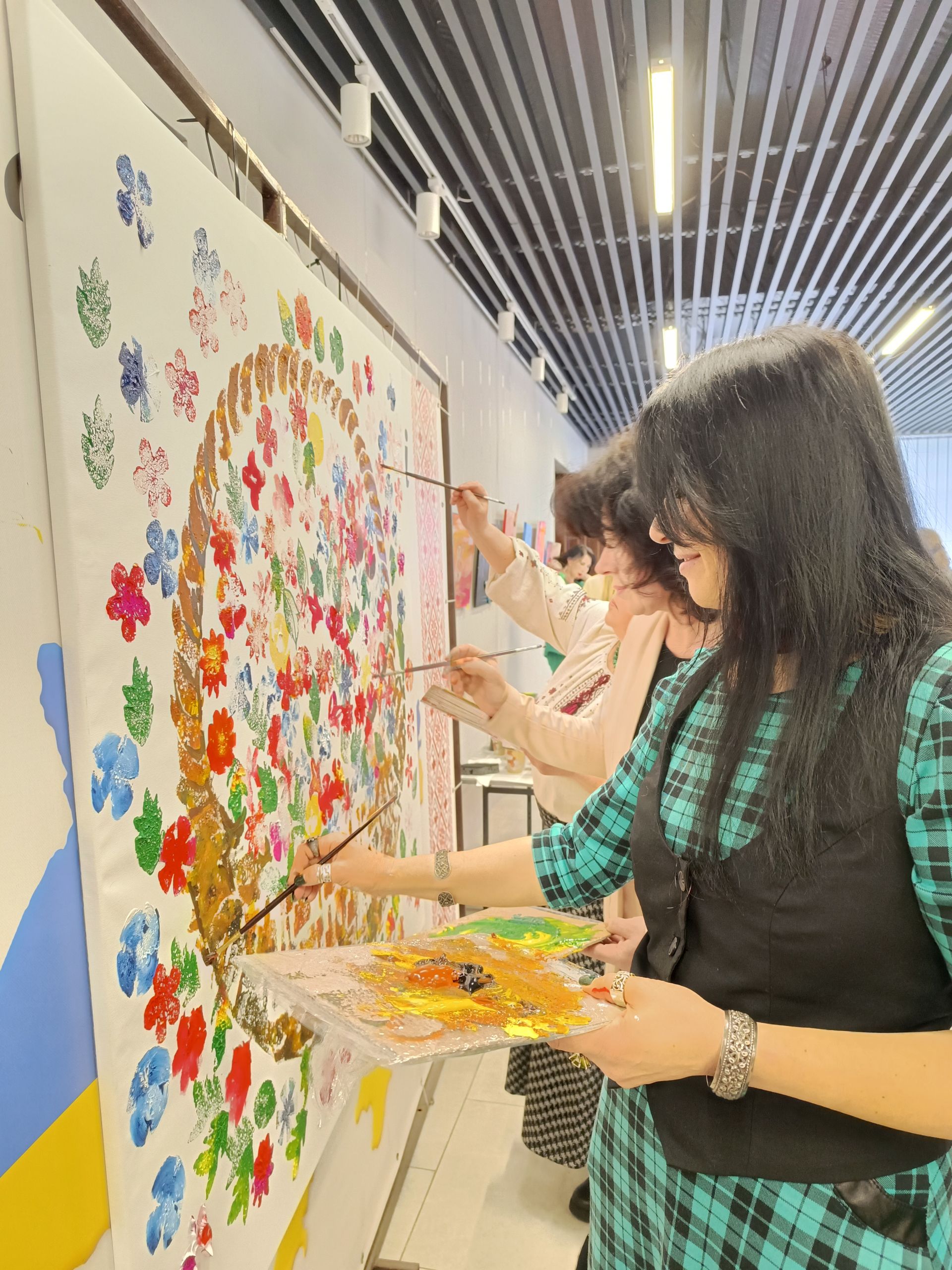 За декілька хвилин на полотні з’явилися обриси кошика. Усіх учасників проєкту запросили долучитися до створення спільної картини. Кожен хлопчик та дівчинка зобразили на полотні квітку. Аби полегшити завдання, заздалегідь підготували спеціальні штампи, за допомогою яких ставили на полотні відтиски. Долучилися не лише діти, а й дорослі. Художниці додали декілька штрихів і картина замайоріла барвистими весняними квітами.