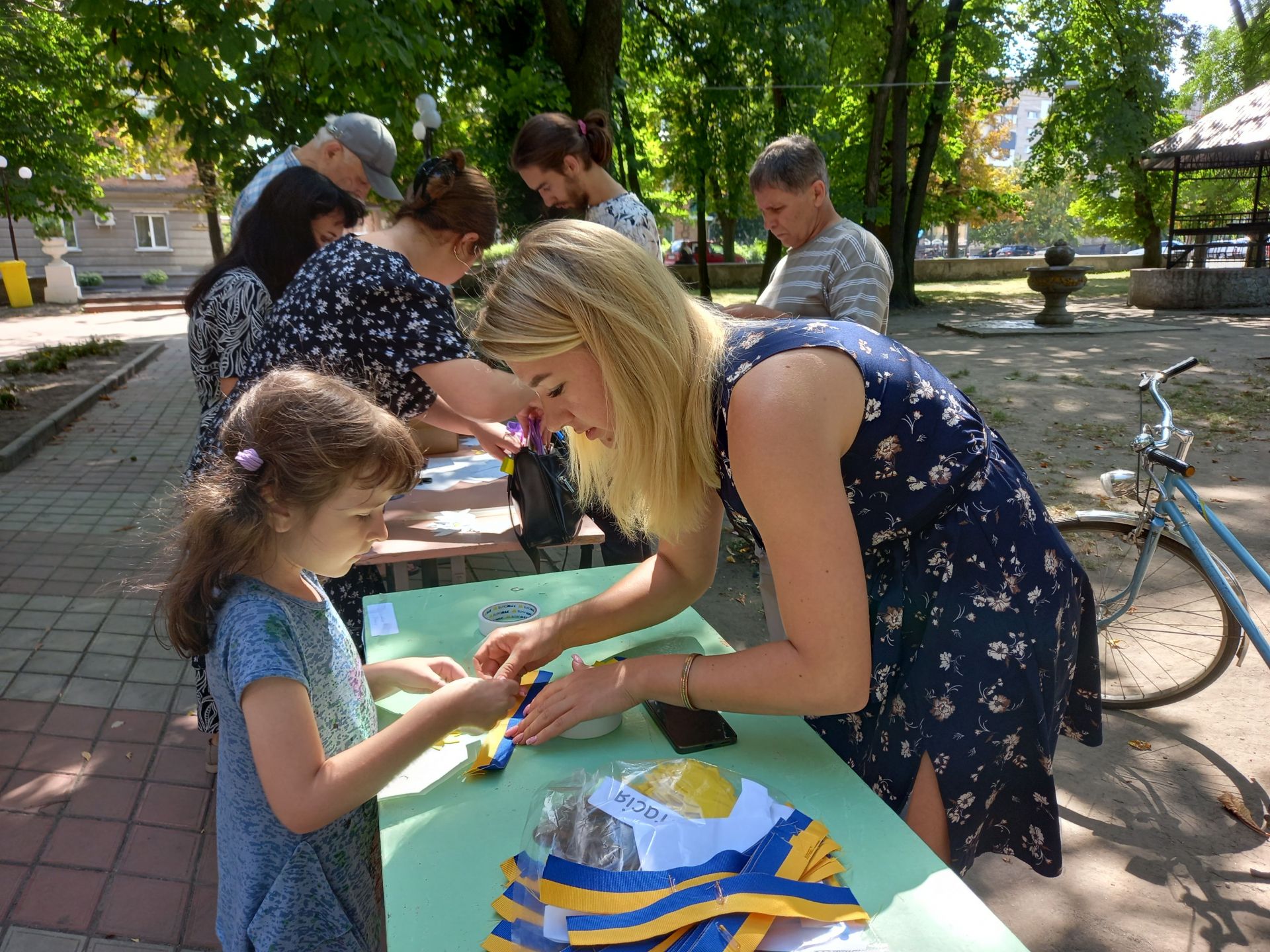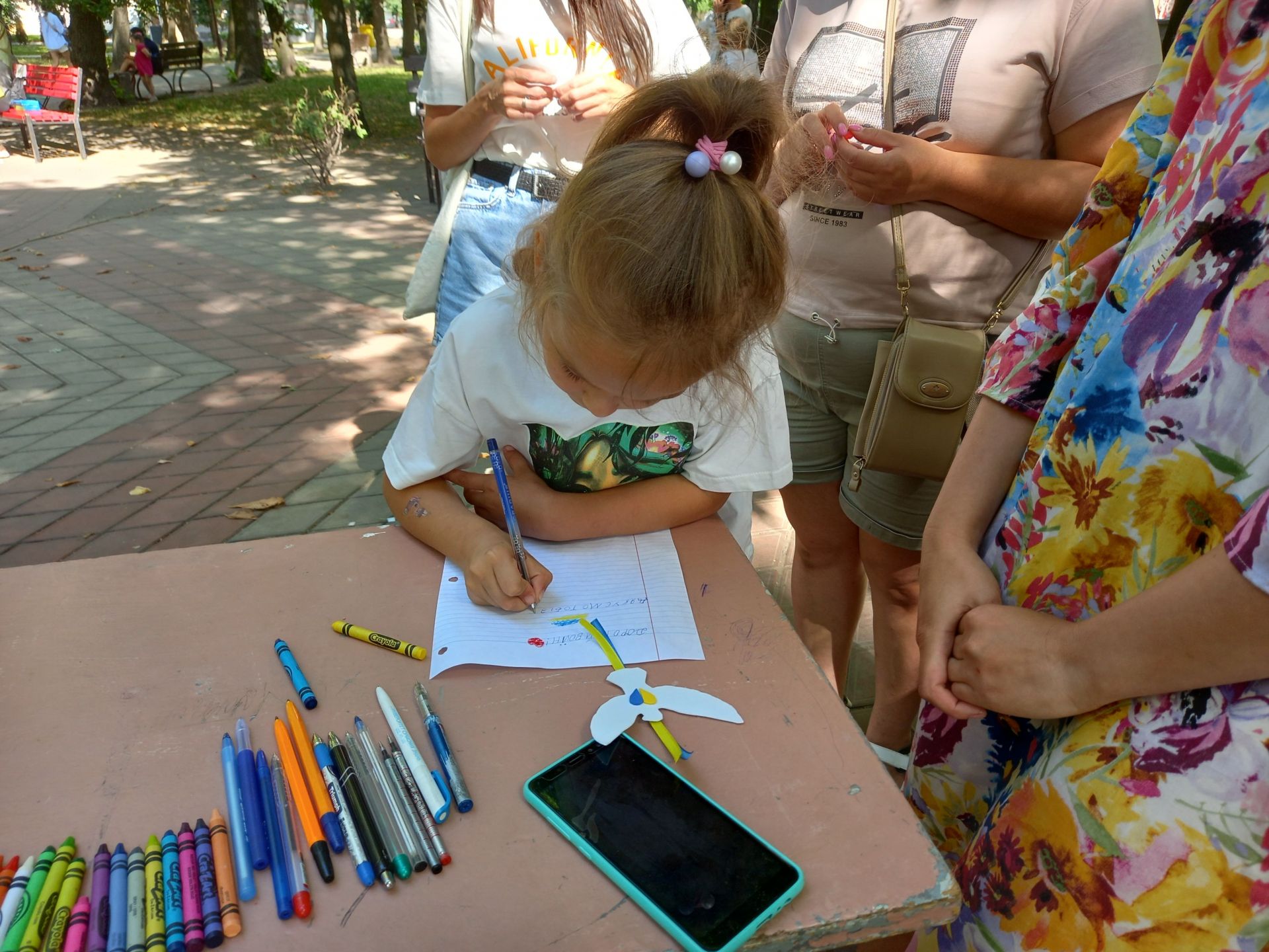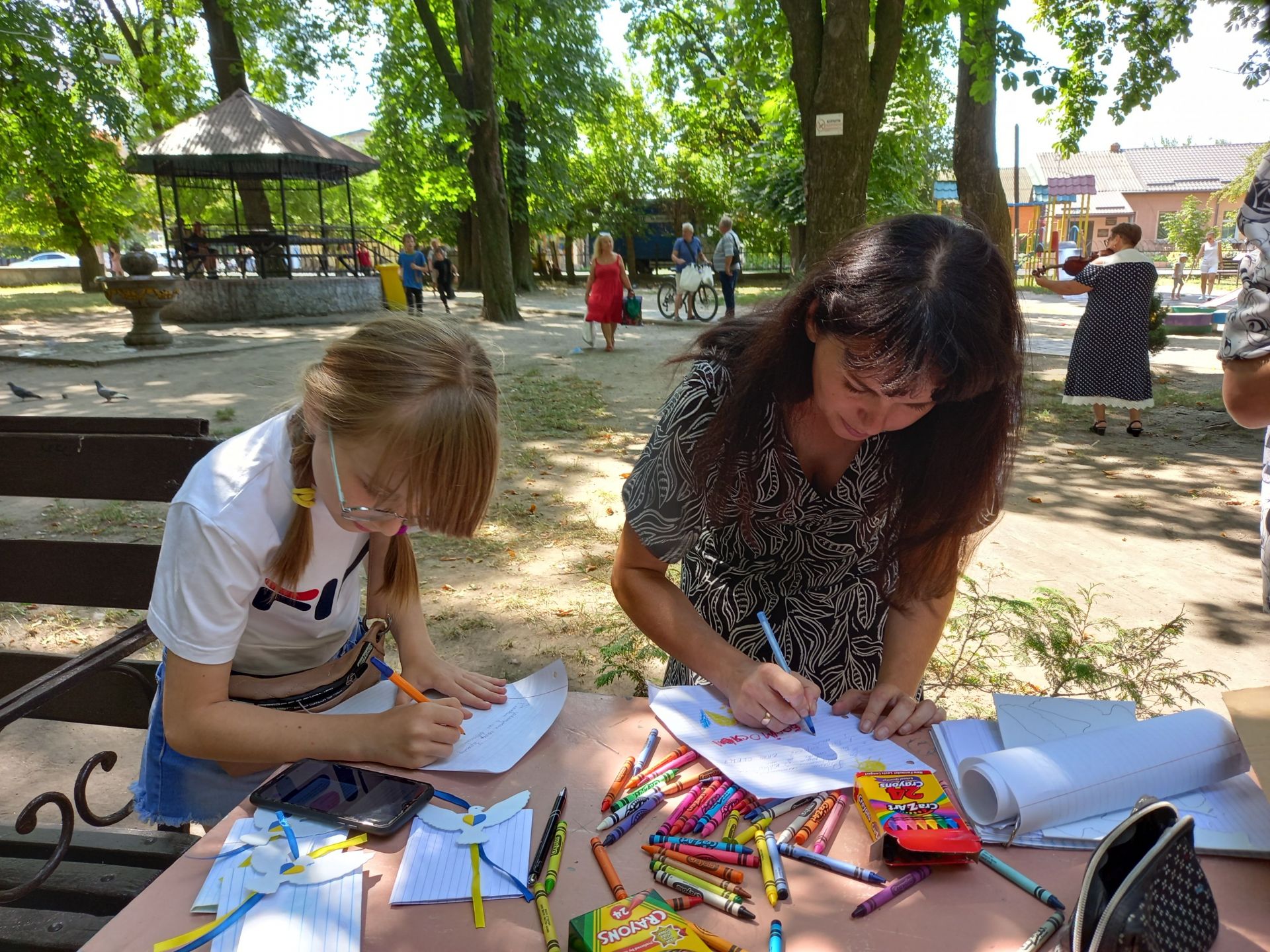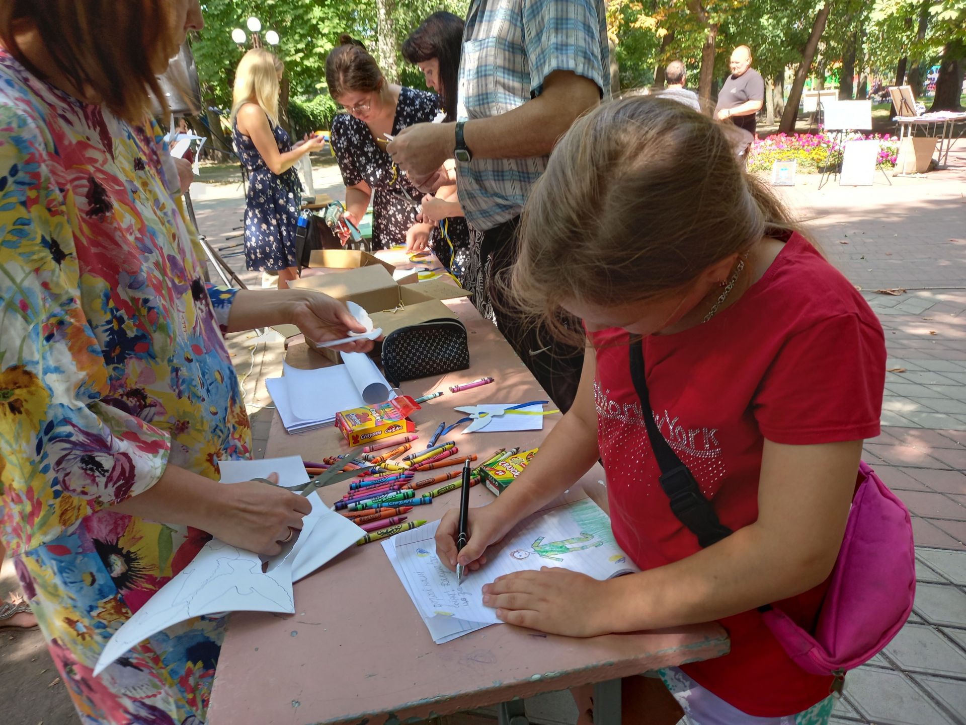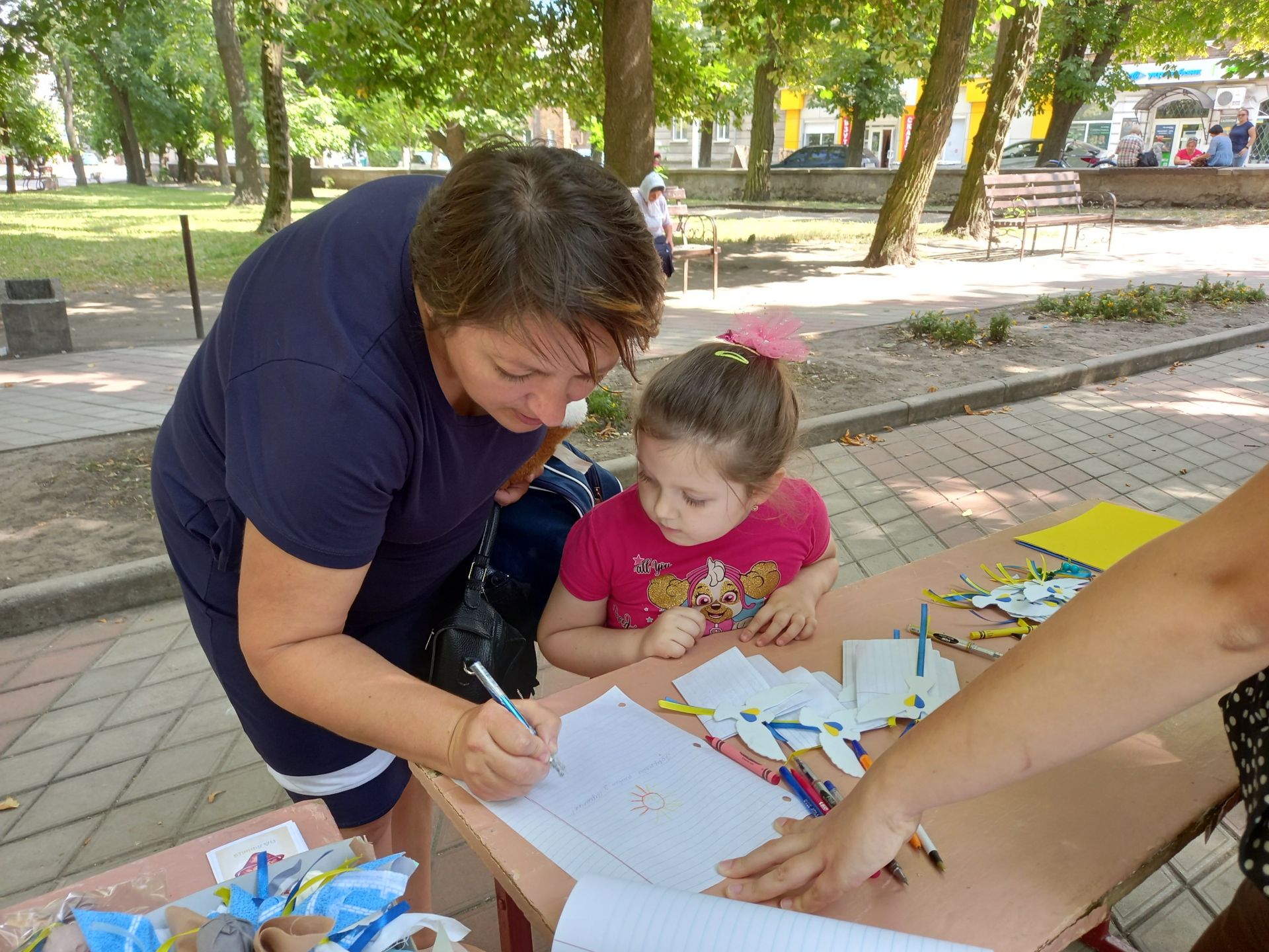 По інший бік алеї для гостей ярмарку-вернісажу проводили майстер-класи за донат. Наталія Салинко показувала юним козятинчанам, як створювати соняшники — символи пам’яті про загиблих воїнів. За столиком поруч — воскові олівці, голуби з паперу та чисті аркуші. Сюди підходили діти, щоб написати листа із побажаннями для воїнів. Усі листи передадуть нашим захисникам.