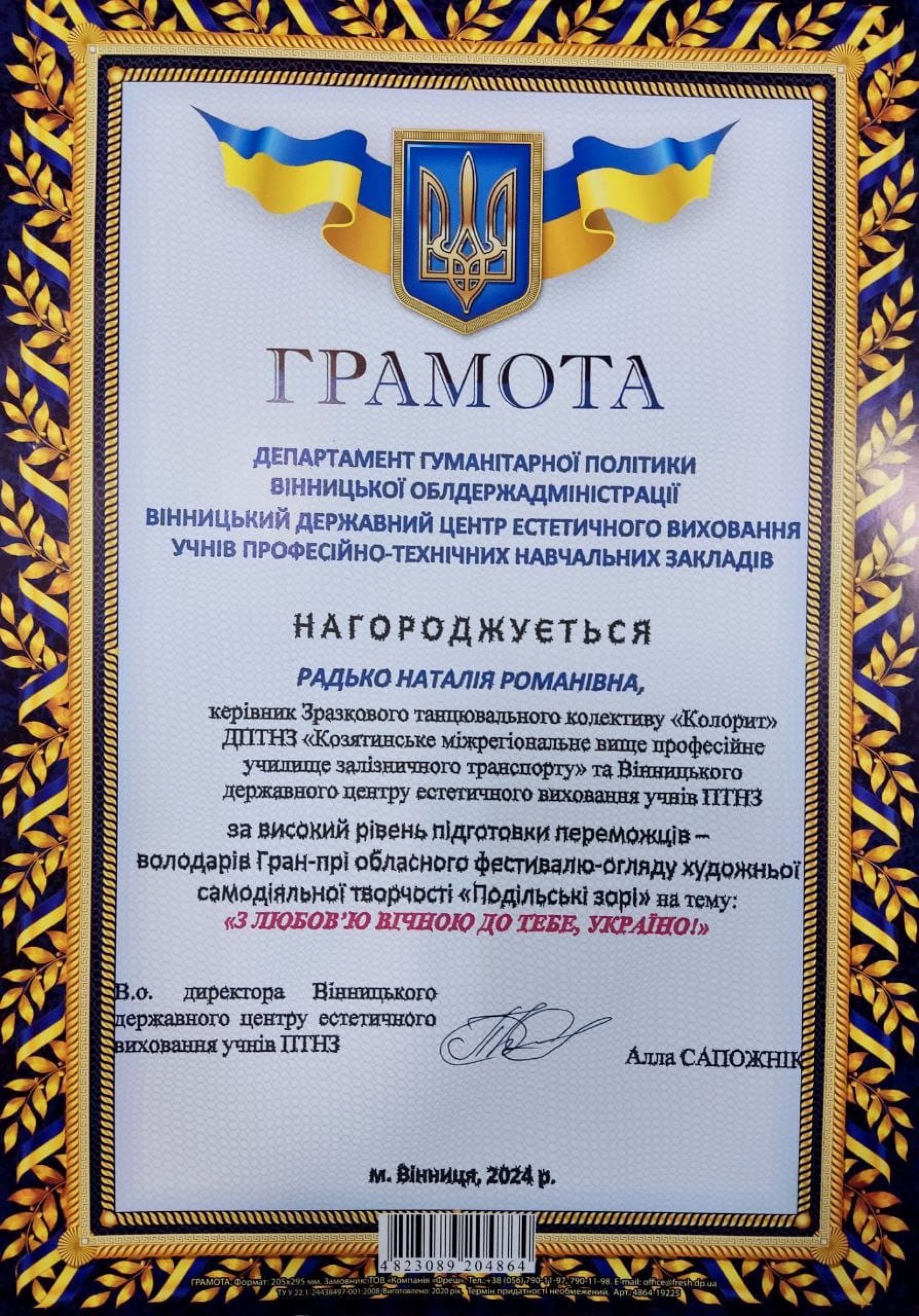 - Вихованці гуртків художньої самодіяльної творчості Козятинського залізничного училища, під керівництвом Наталії Радько, взяли участь у щорічному обласному фестивалі-огляді художньої самодіяльної творчості здобувачів освіти закладів професійної (професійно-технічної) освіти «Подільські зорі» на тему: «З любов’ю вічною до тебе, Україно!»
