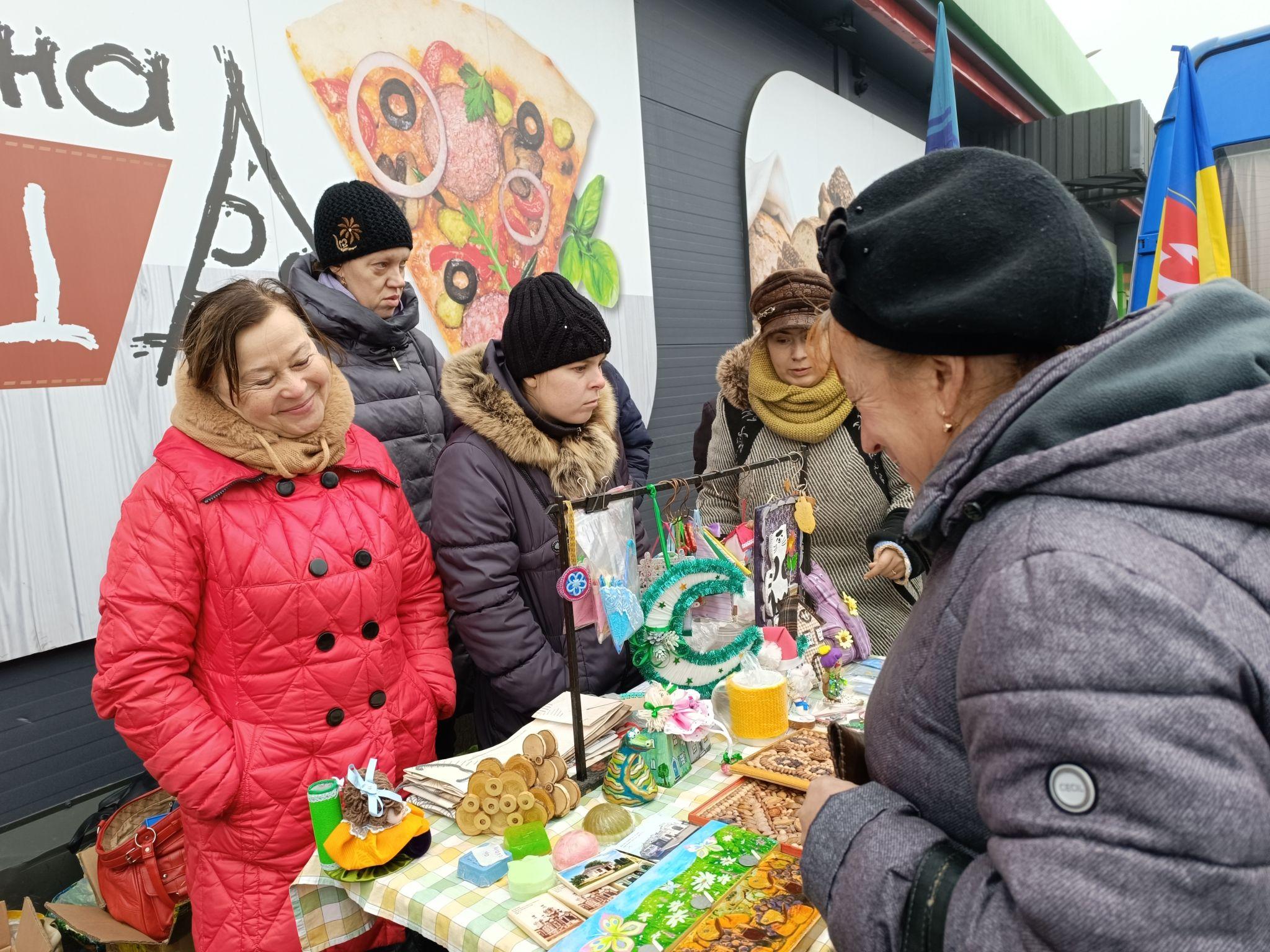 Продавали на Різдвяному ярмарку не тільки смаколики, а й вироби ручної роботи. Долучилися волонтери громадської організації «ДОМ». Вони часто беруть участь у патріотичних акціях та ярмарках.