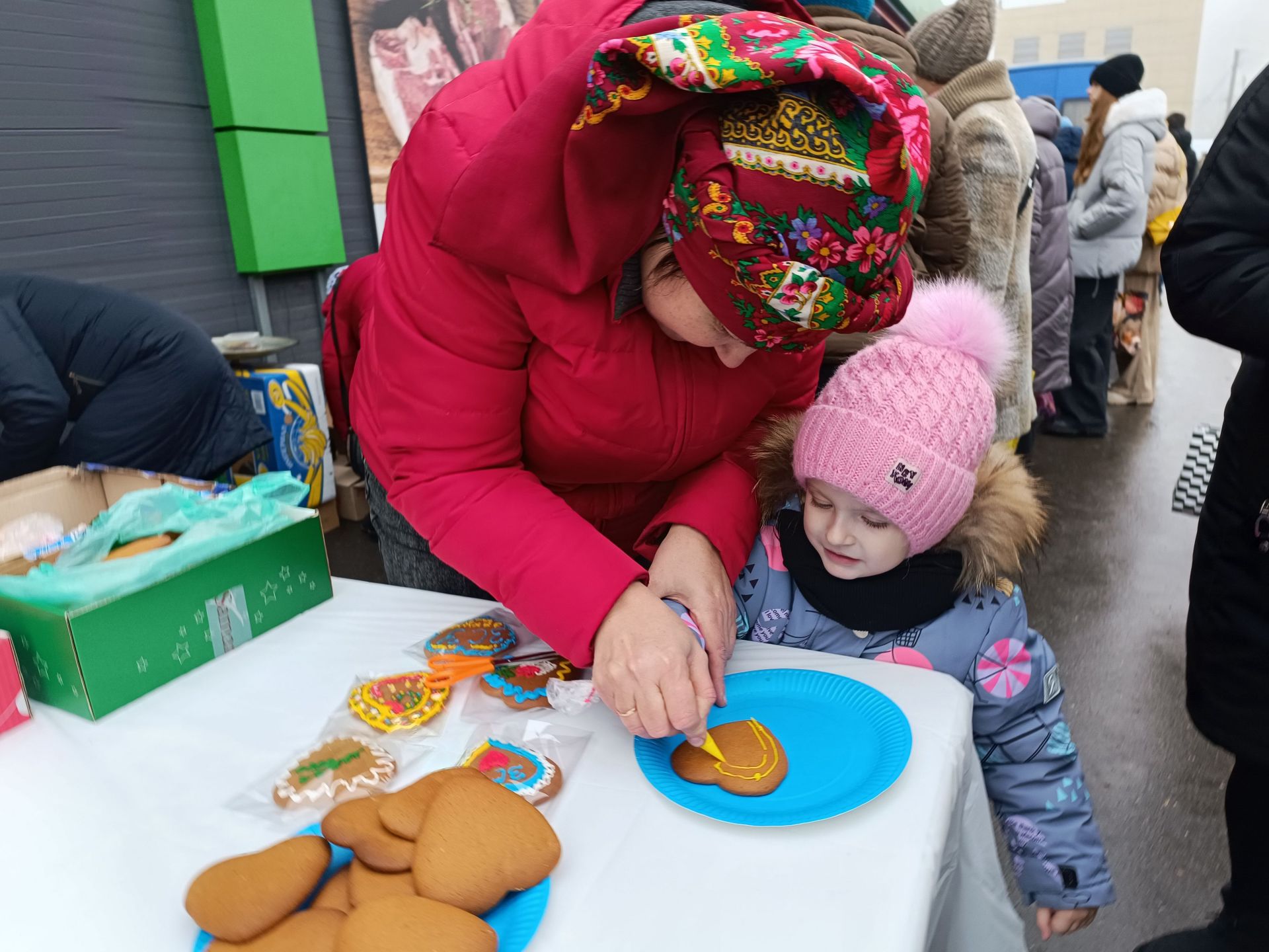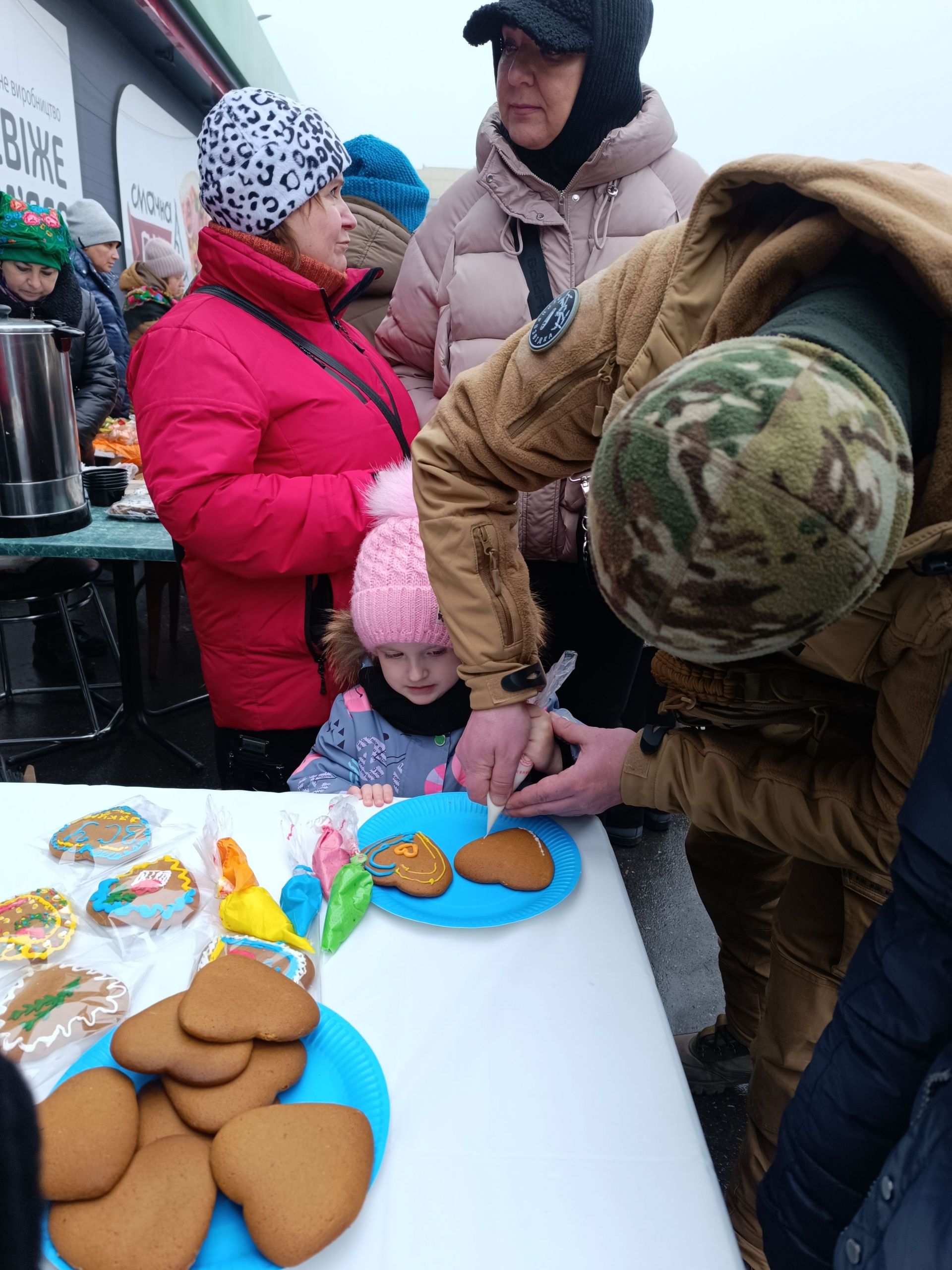 Не забули волонтери і про наймолодших — для них організували майстер-класи. Хлопчикам та дівчаткам пропонували розфарбувати печиво глазур’ю. Маленька Софія залюбки долучилася. Вона прийшла на ярмарок разом із батьками. Тато Ігор допомагає своїй крихітці.