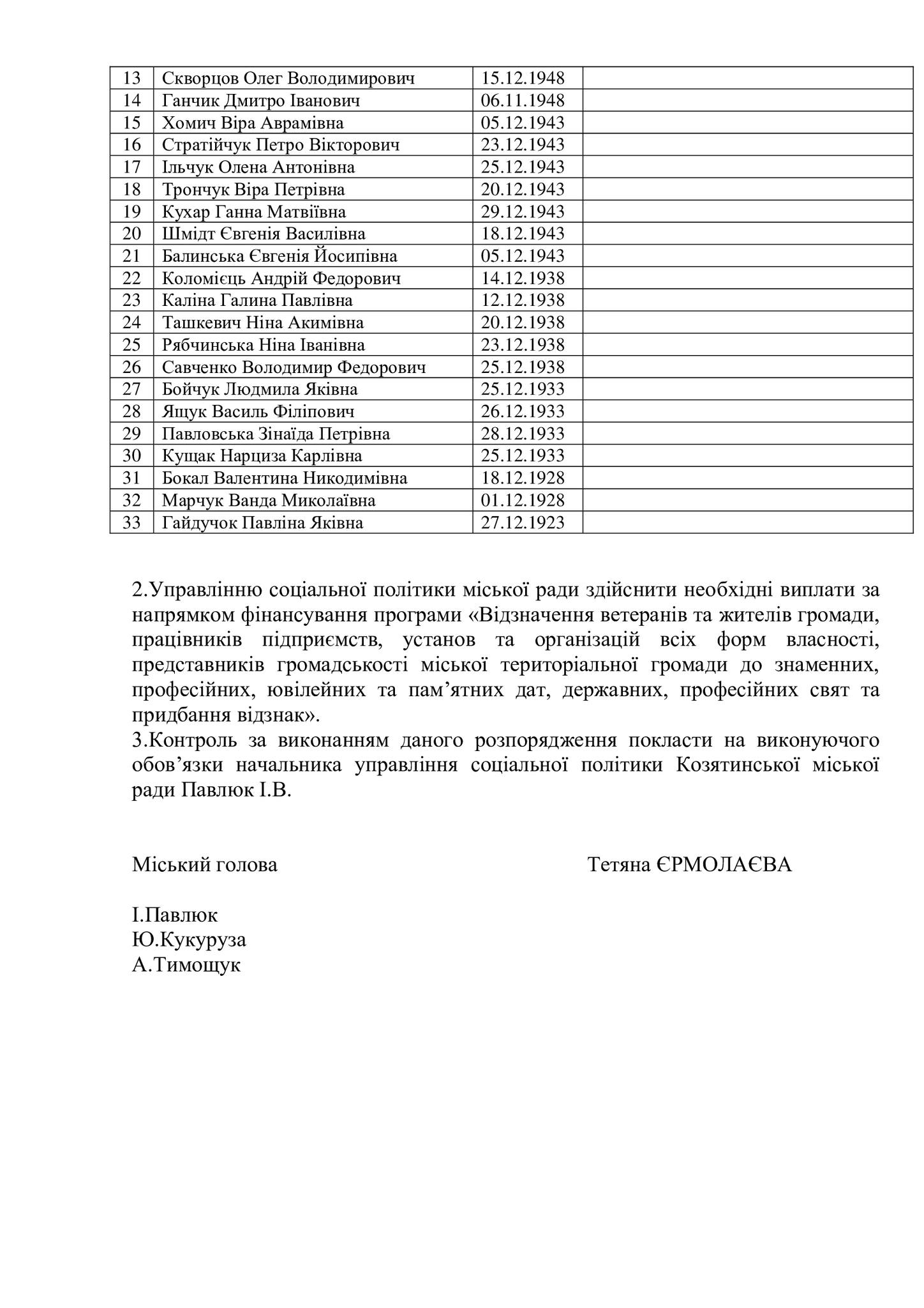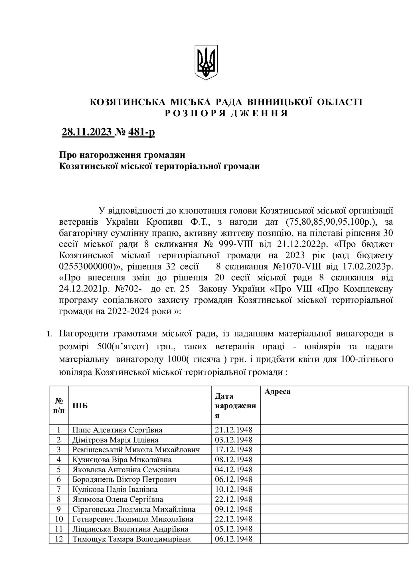 - Опублікували список довгожителів Козятинської громади, яких у грудні вітатимуть з ювілейними датами грамотами міської ради та матеріальною винагородою