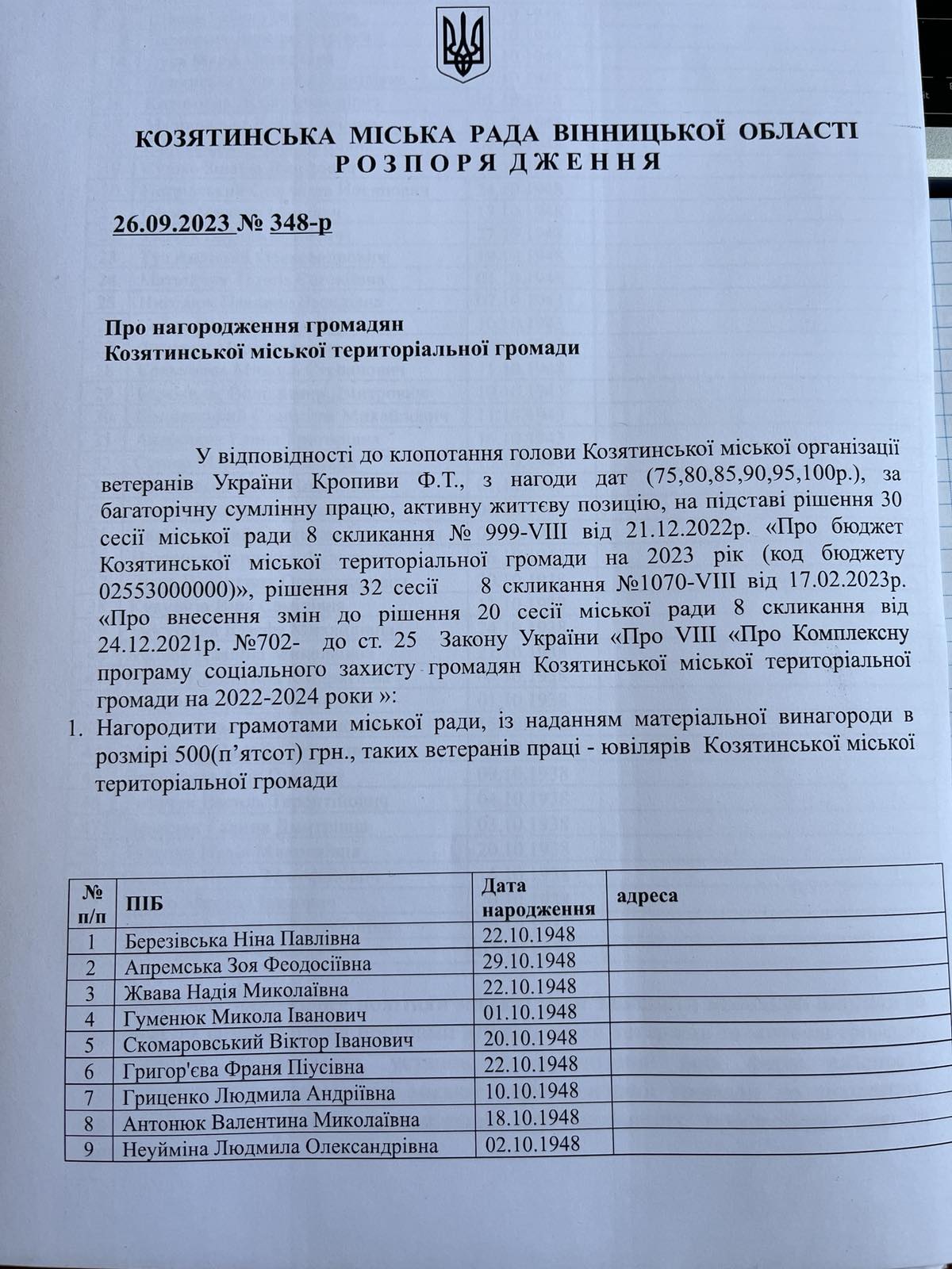 У Козятинській міській територіальній громаді продовжують усім ветеранам праці-ювілярам з нагоди славних життєвих дат 75, 80, 85, 90, 95 та 100 років, надавати матеріальну винагороду. Як повідомляє Козятинський міський голова Тетяна Єрмолаєва, комплексна програма соціального захисту громадян триває з початку року